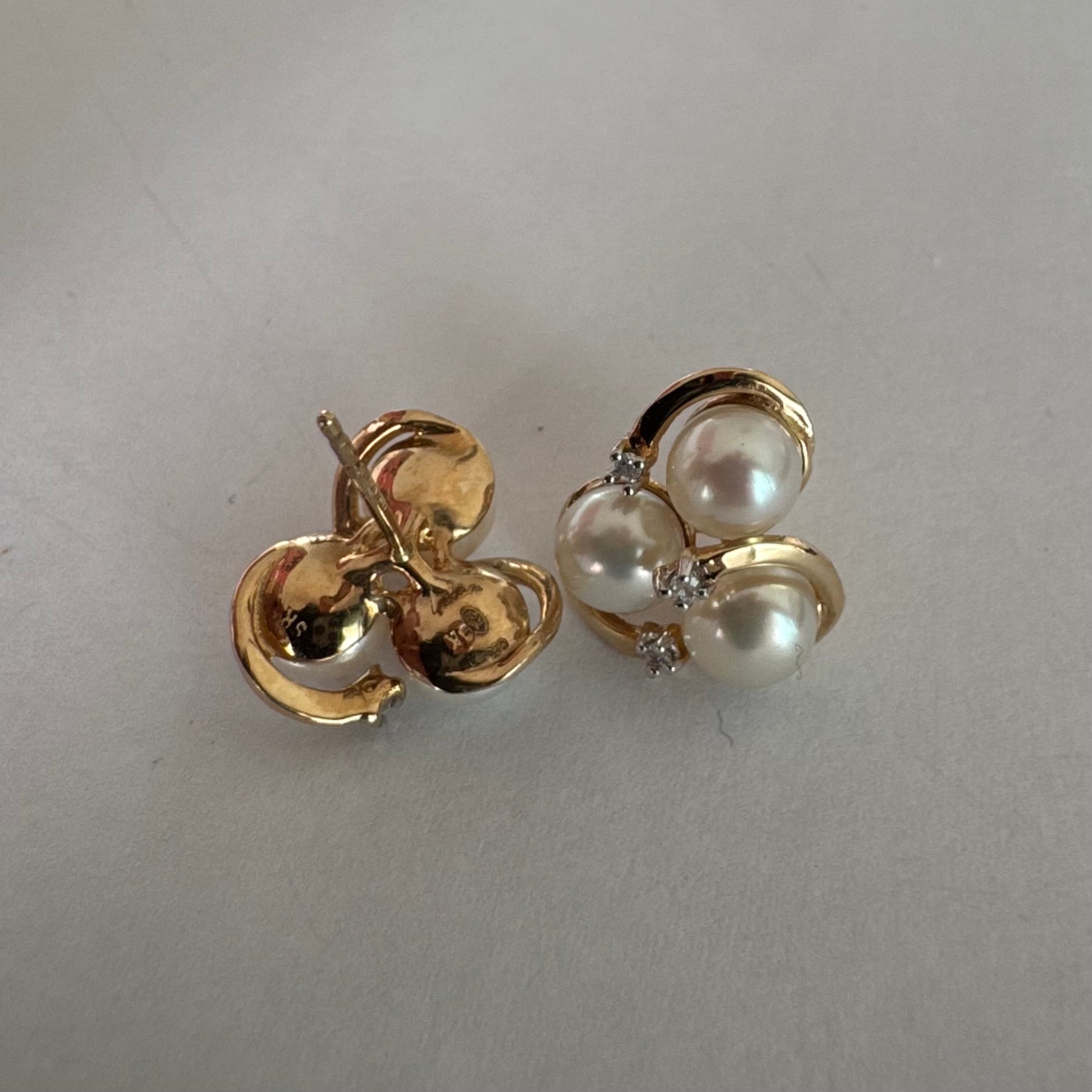 10K gold stud earrings in a delicate floral design, set with three creamy natural Pearls & Diamonds.