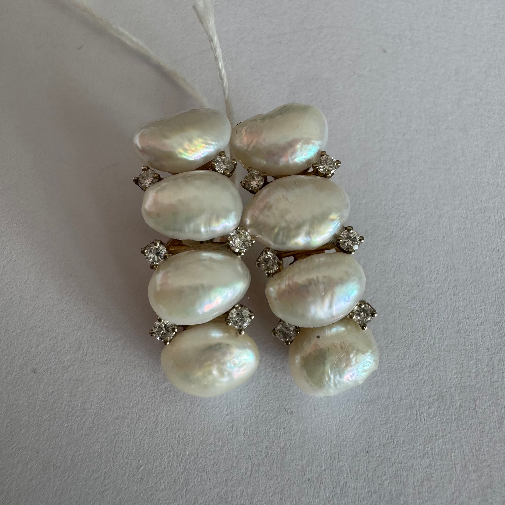 עגילי קליפס מזהב צהוב 14 קראט, משובצים פנינים גדולות ולא אחידות במראה טבעי, עם יהלומים בין כל פנינה המוסיפים ברק עדין ואלגנטי.