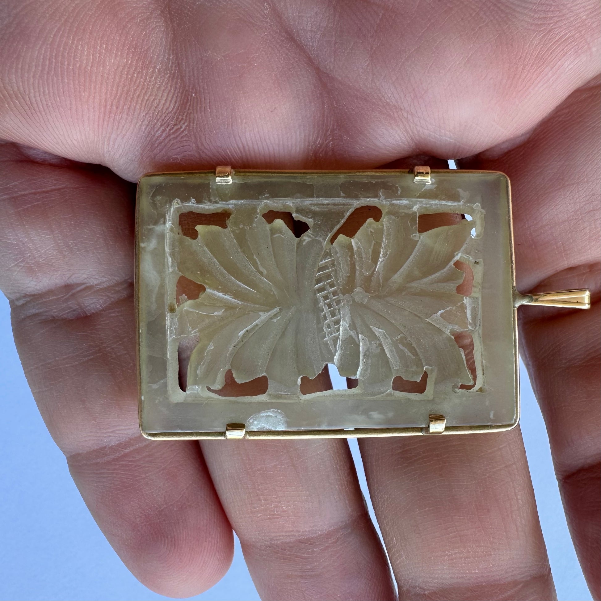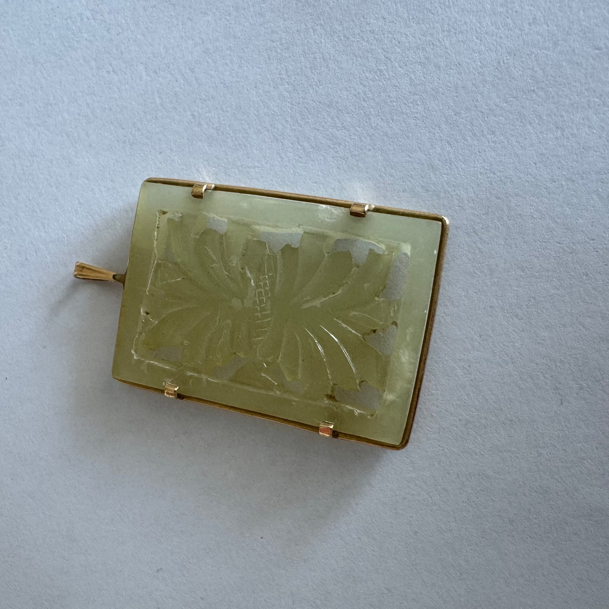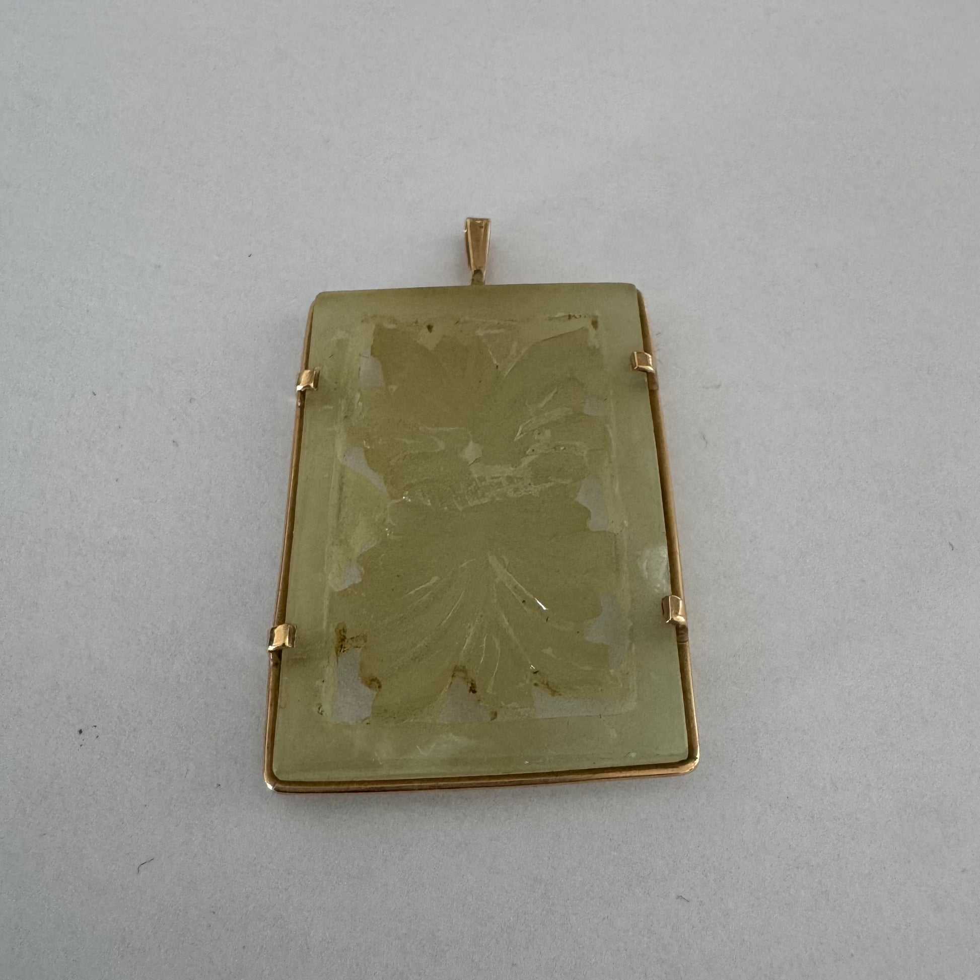 14K gold rectangular pendant set with a hand-carved milky Jade stone