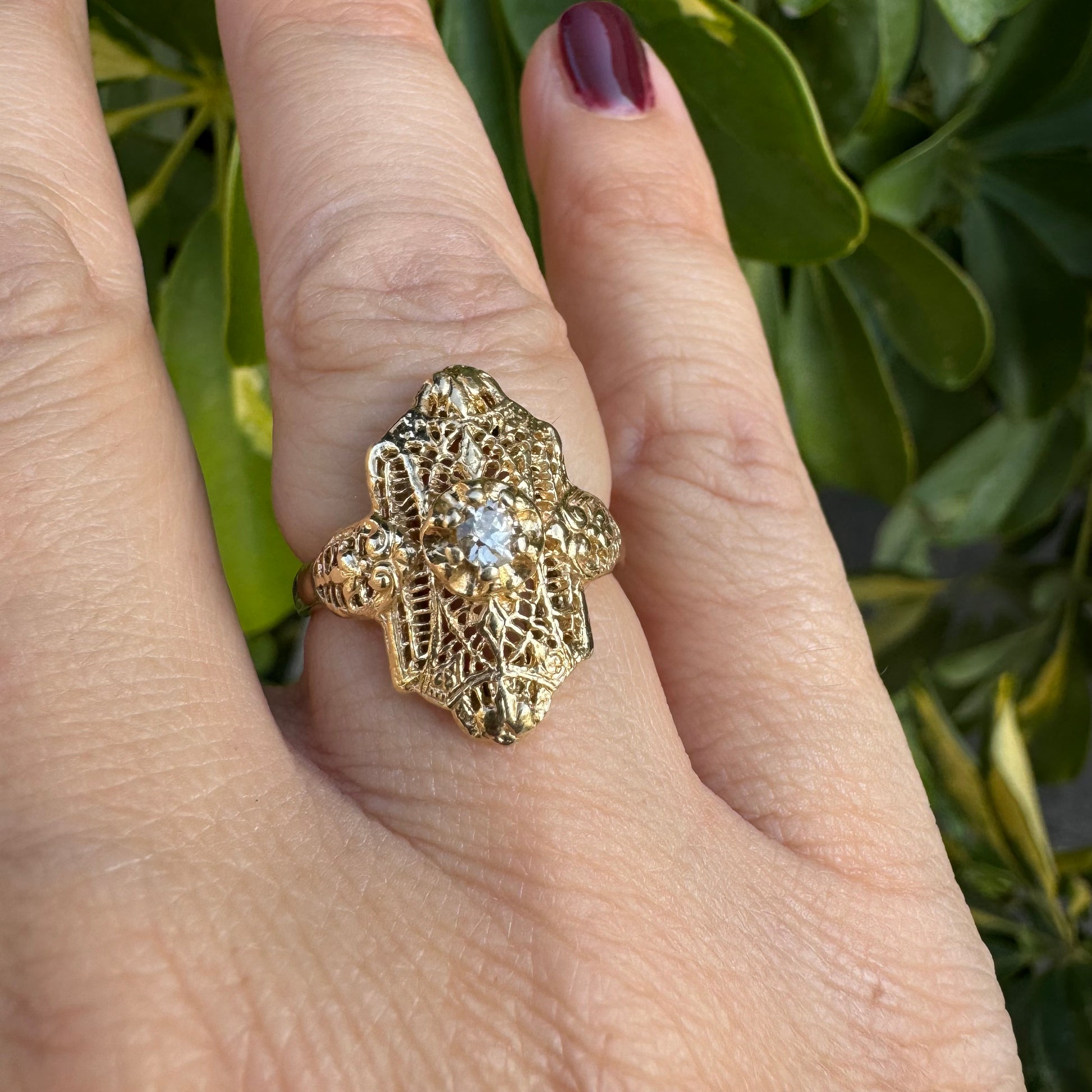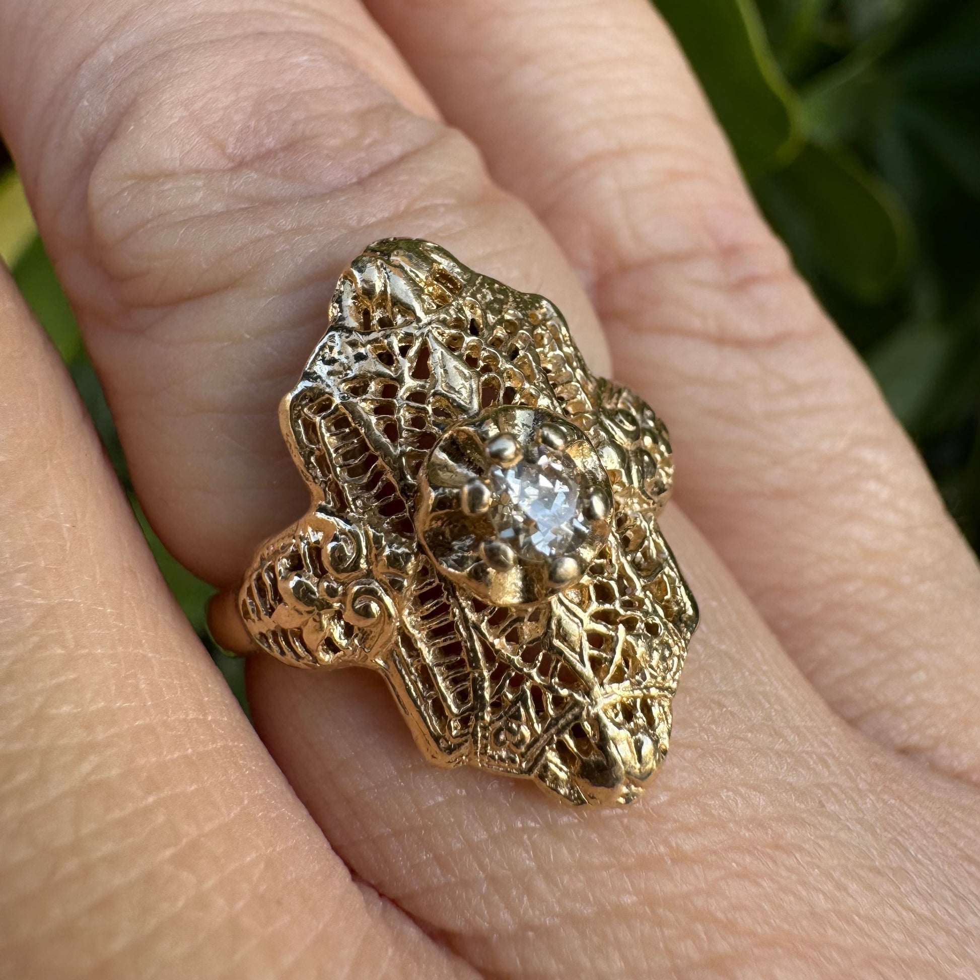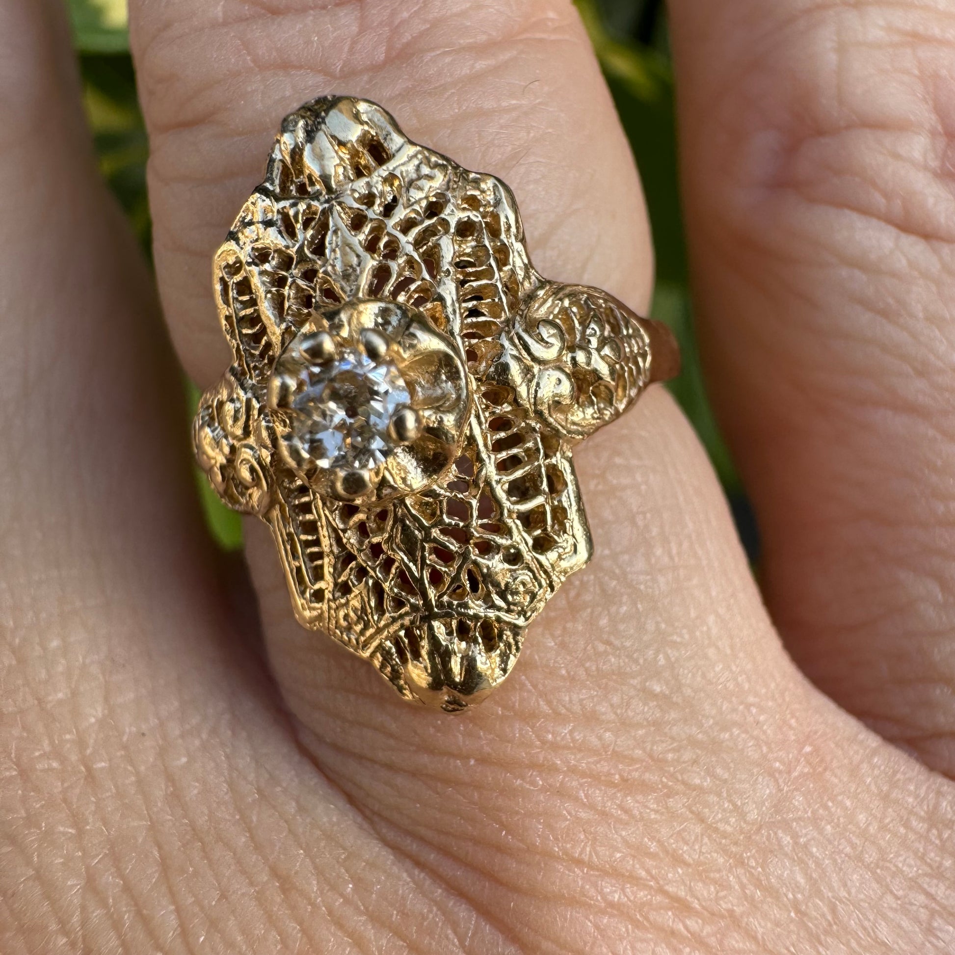 14K yellow gold filigree ring set with an old-cut Diamond