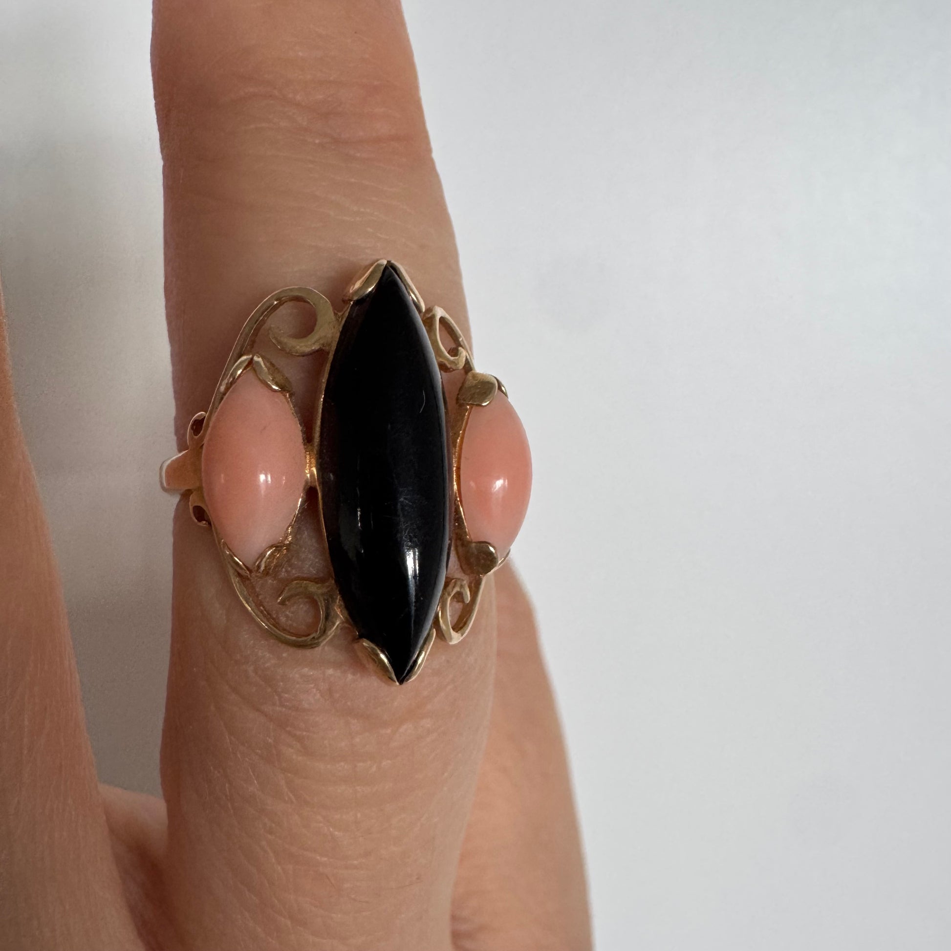 14K gold ring set with Black Onyx & Corals