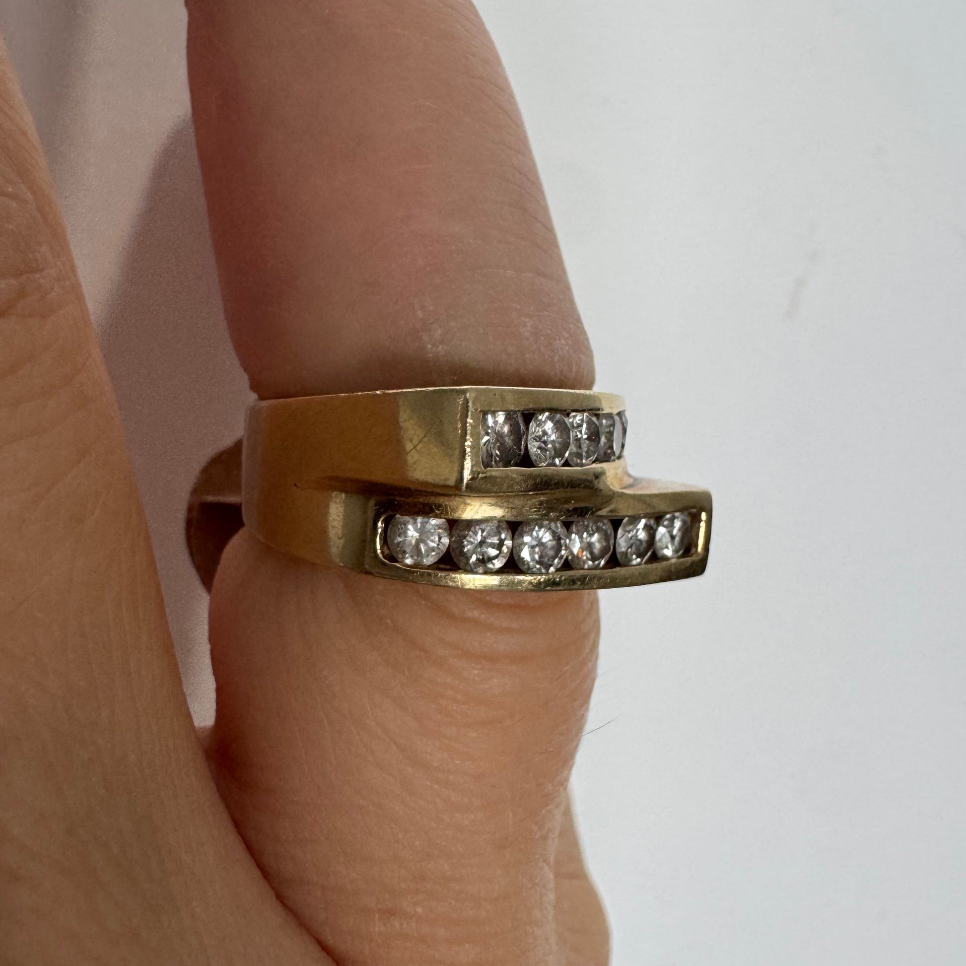 14K yellow gold ring set with two parallel diamond-set rows