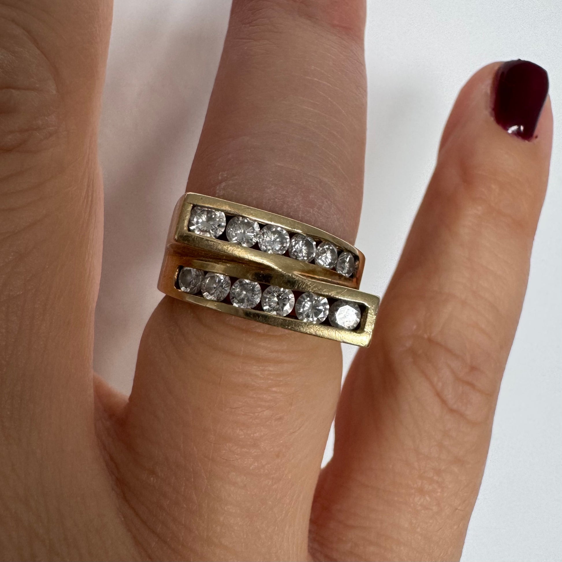 14K gold ring set with two parallel Diamond-set rows