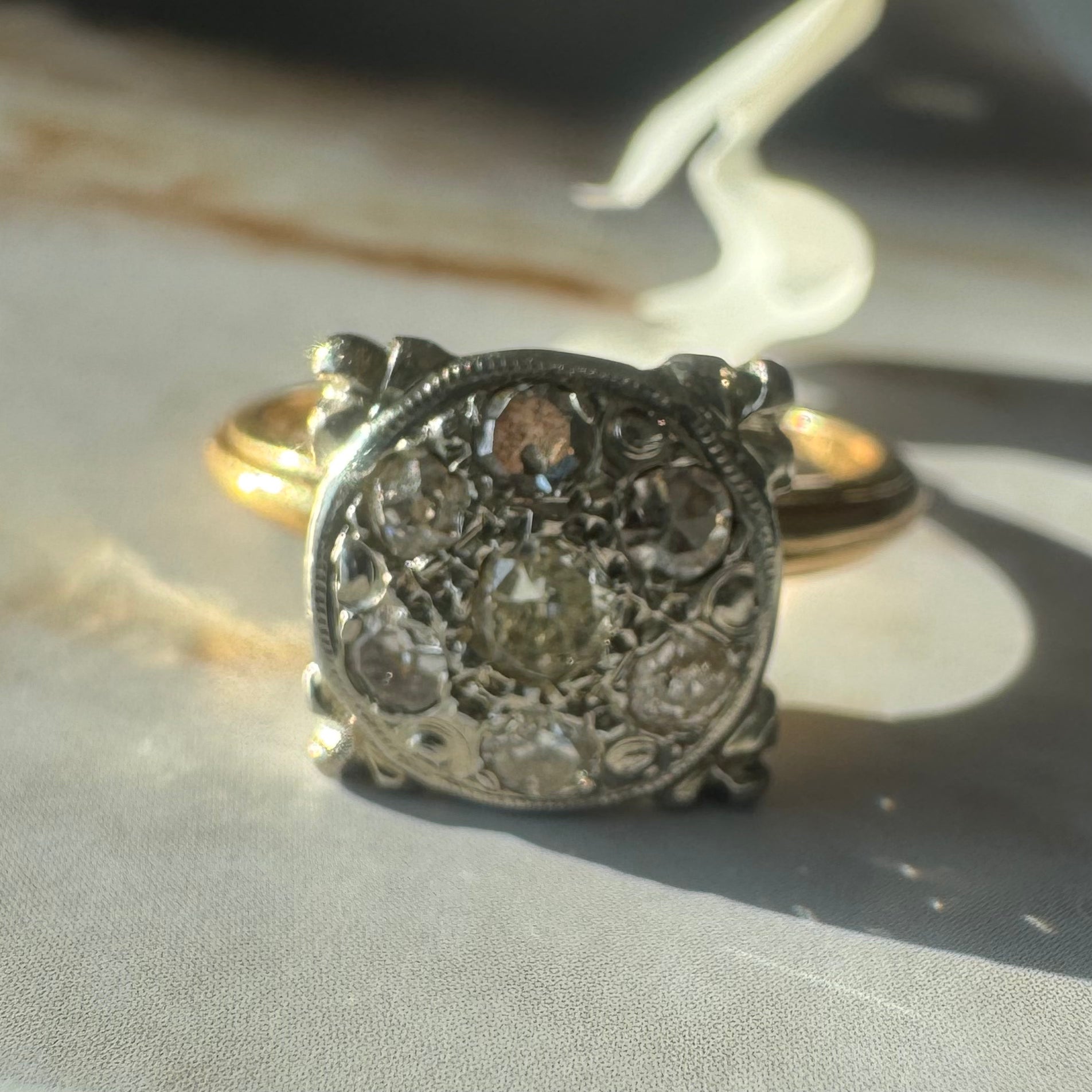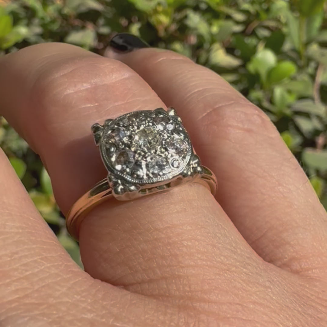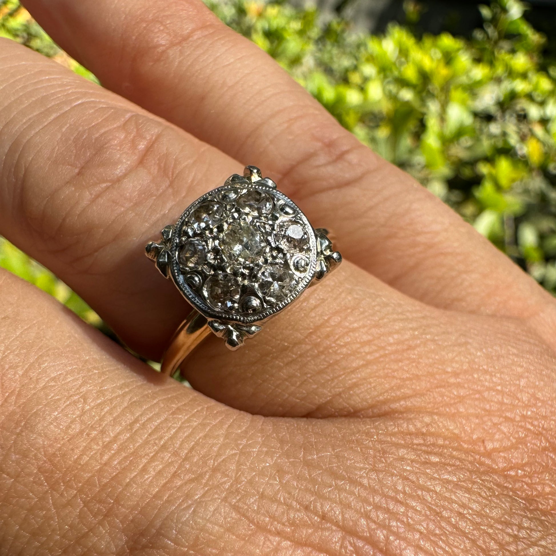 טבעת צהוב לבן 14 קראט משובצת ביהלומים בליטוש ישן (Old Cut), עם יהלום מרכזי מוקף בעיגול צפוף של יהלומים קטנים נוספים.