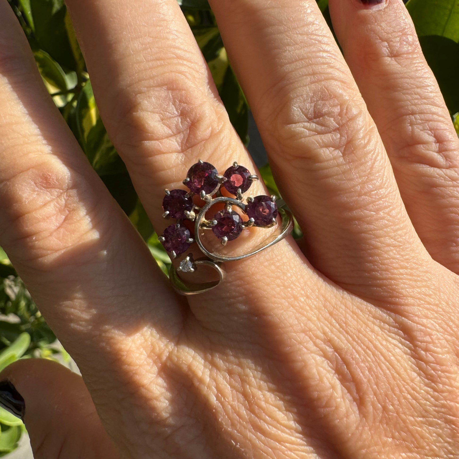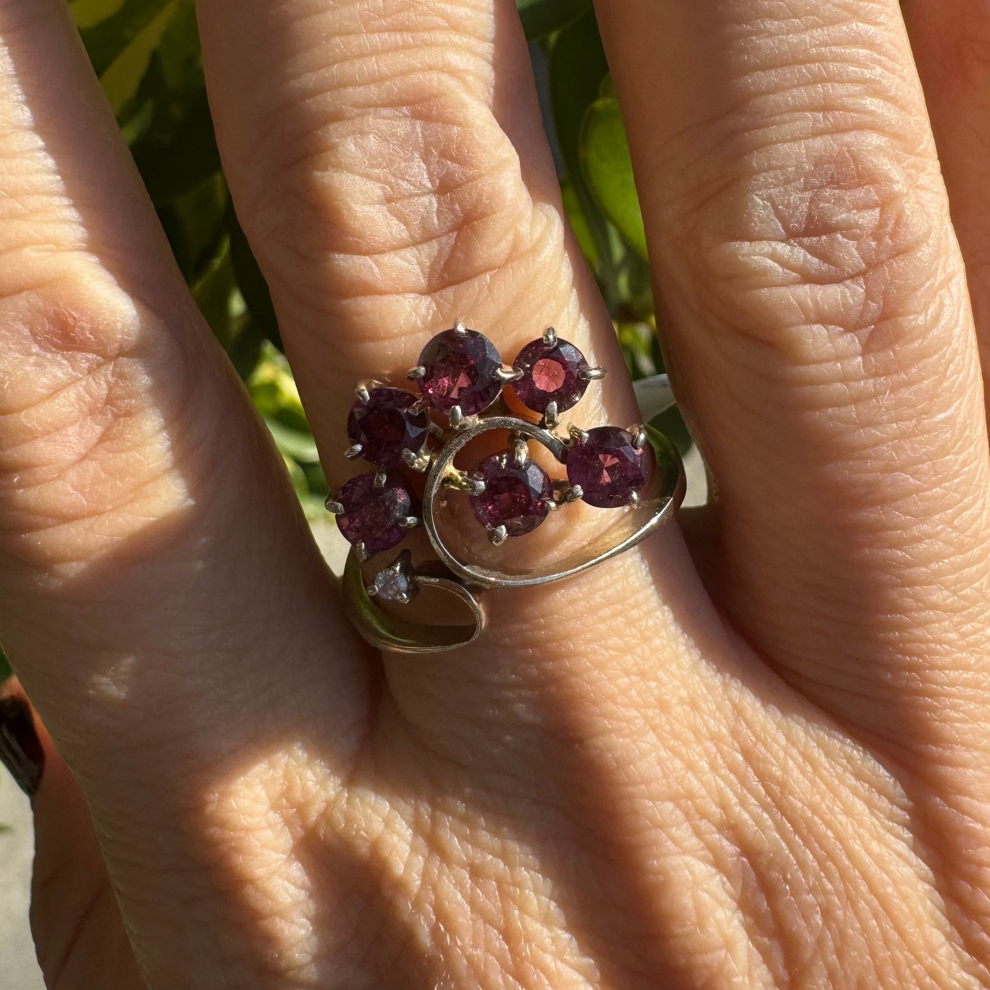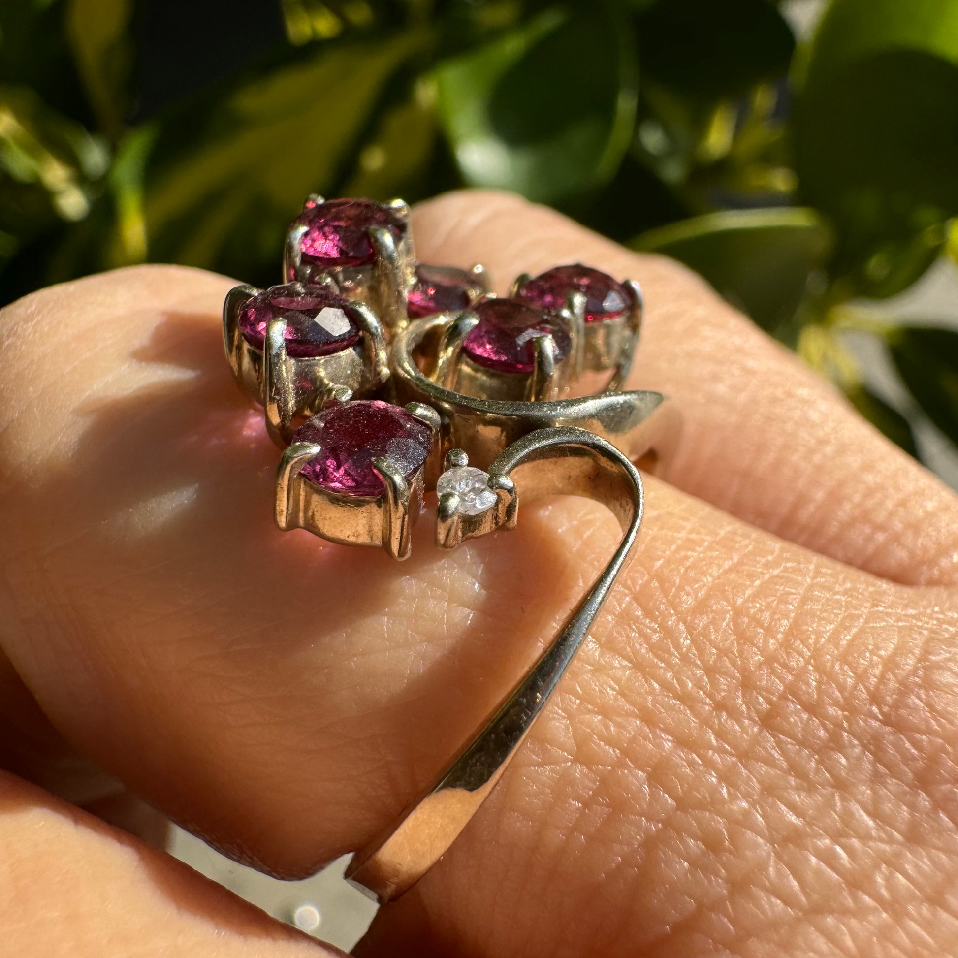 14K gold ring with an open, flowing design, set with multiple pink Tourmaline stones and accented by a Diamond