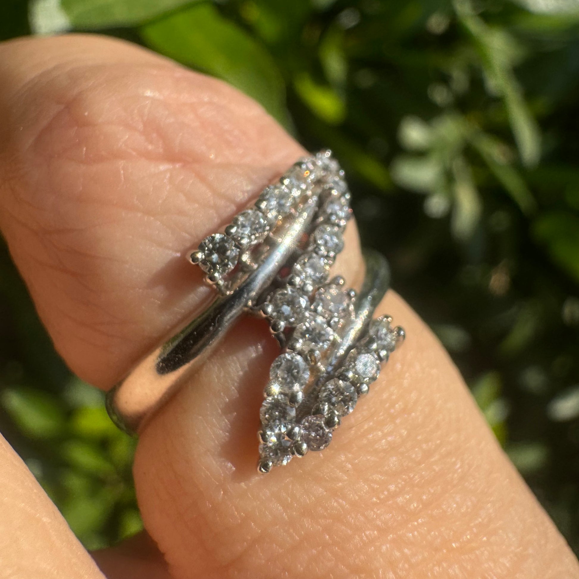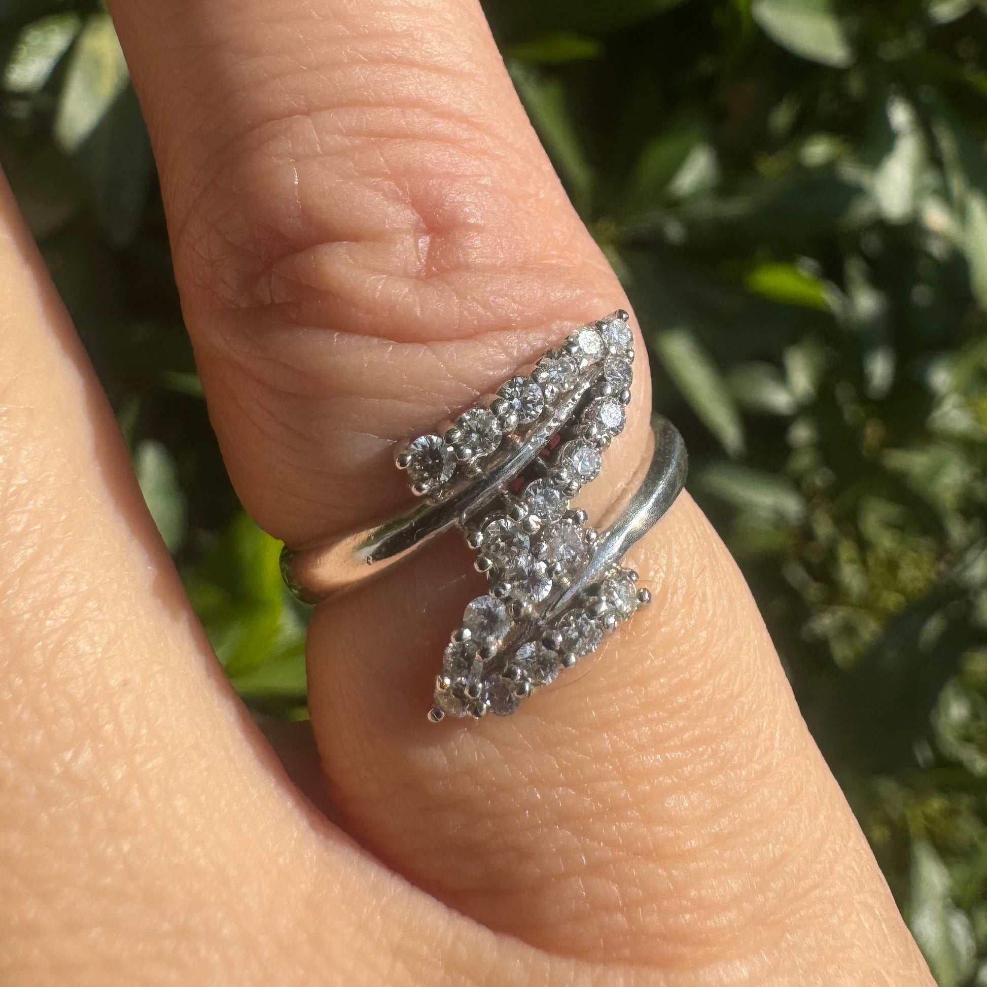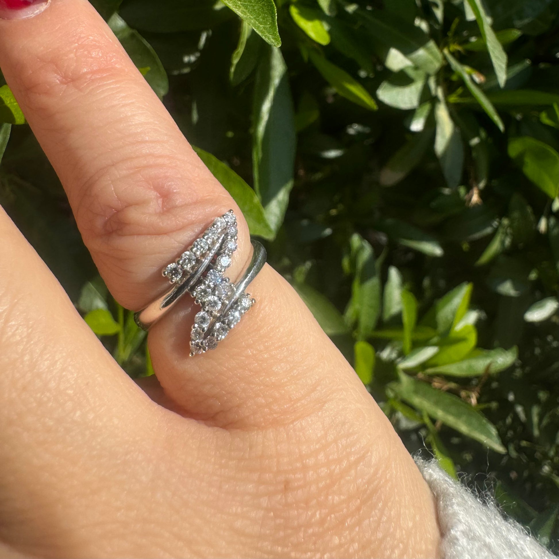 טבעת זהב לבן 14 קראט בעיצוב פתוח, עם שתי שורות מעוגלות של יהלומים נוצצים, המצטלבות זו בזו בצורה אלגנטית