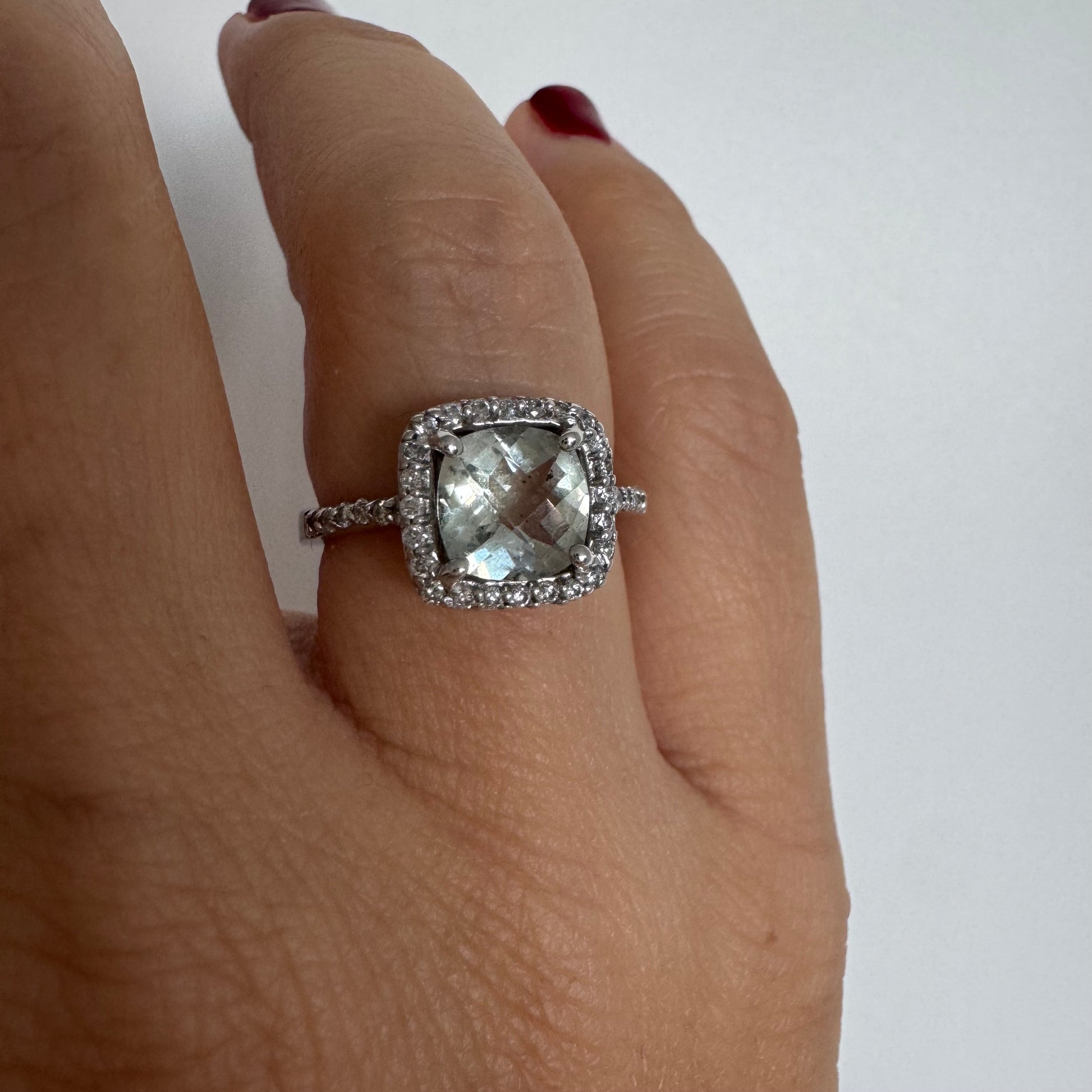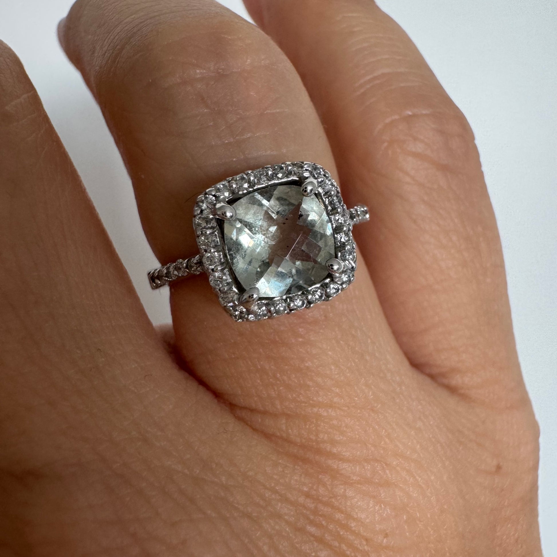 14K white gold ring featuring a cushion-cut light blue Aquamarine set in a sparkling double halo of round-cut Diamonds.