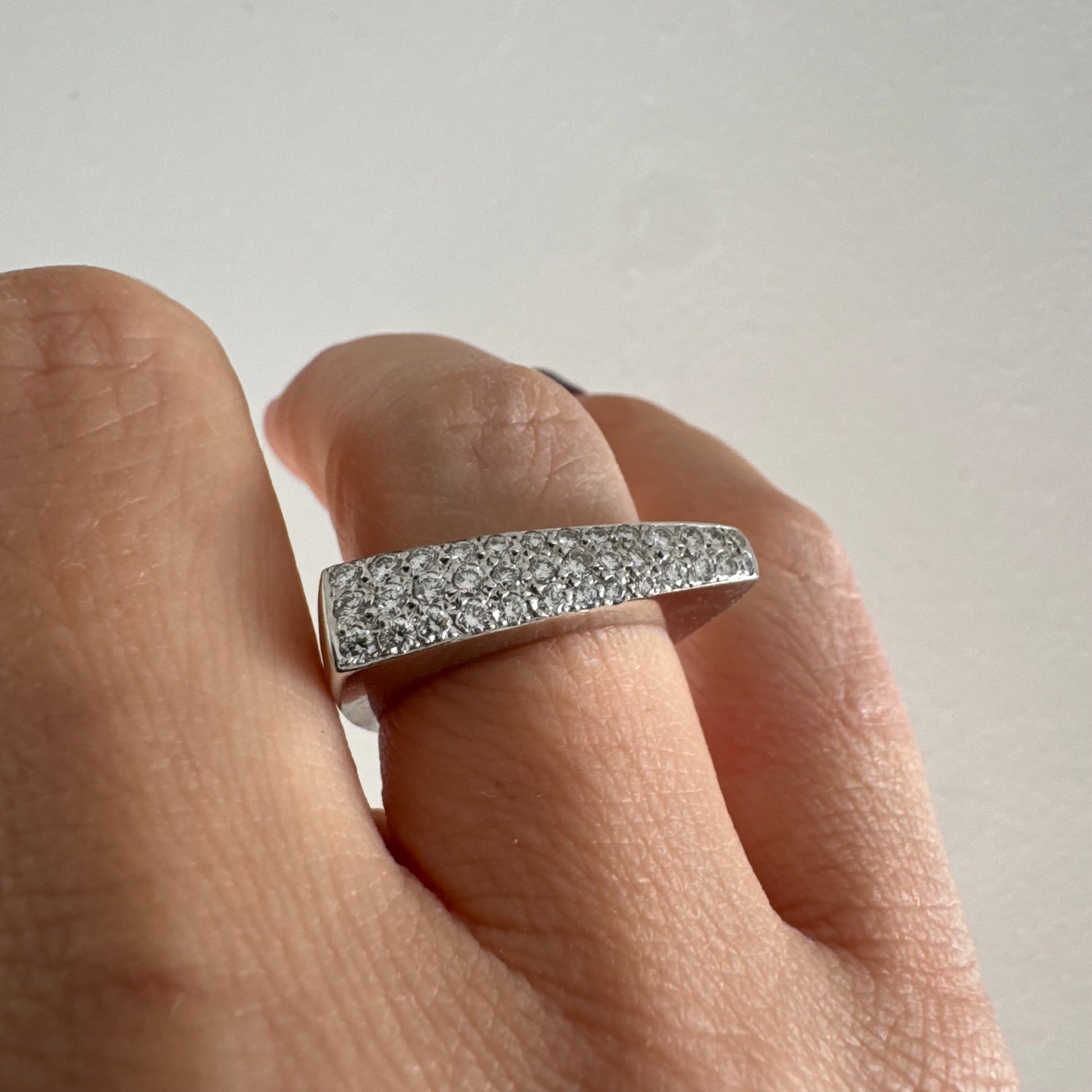 18K white gold band fully set with pavé diamonds across the surface.