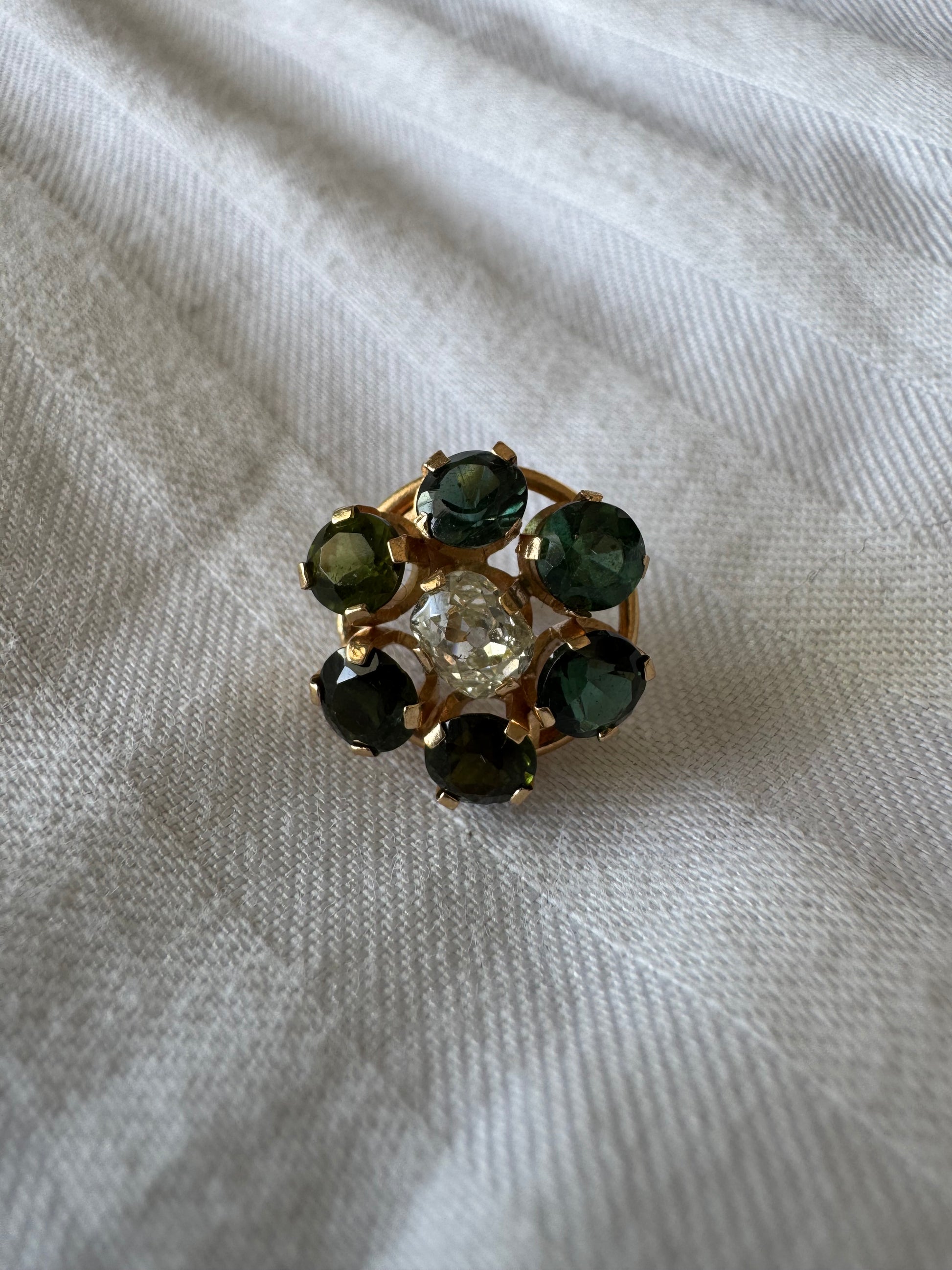 כל ראש טבעת משובץ באבנים צבעוניות שונות: אבן קורל, אבני חן בצבע כחול, טורמלין ירוק ורובי.