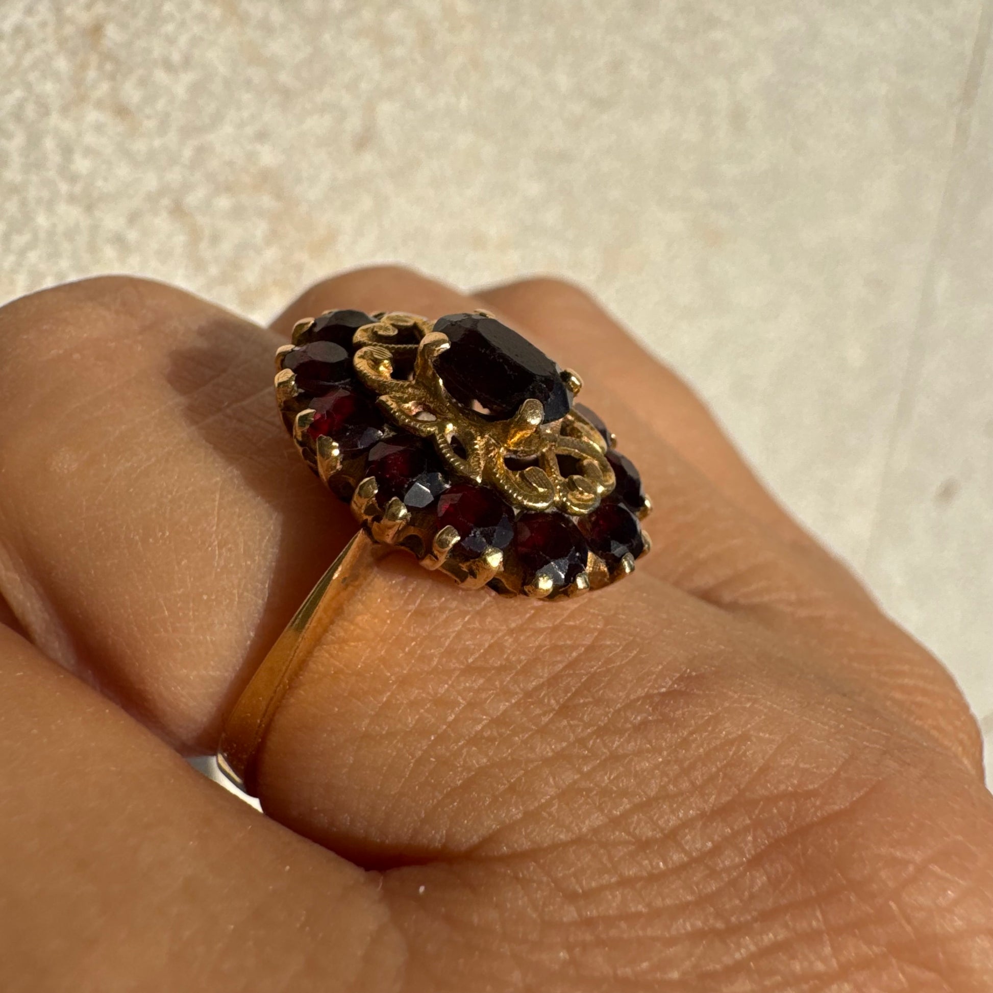 טבעת זהב צהוב 18 קראט משובצת אבני גרנט בגוון אדום עמוק, בעיצוב קלאסי עם נגיעות וינטג׳ אלגנטיות.