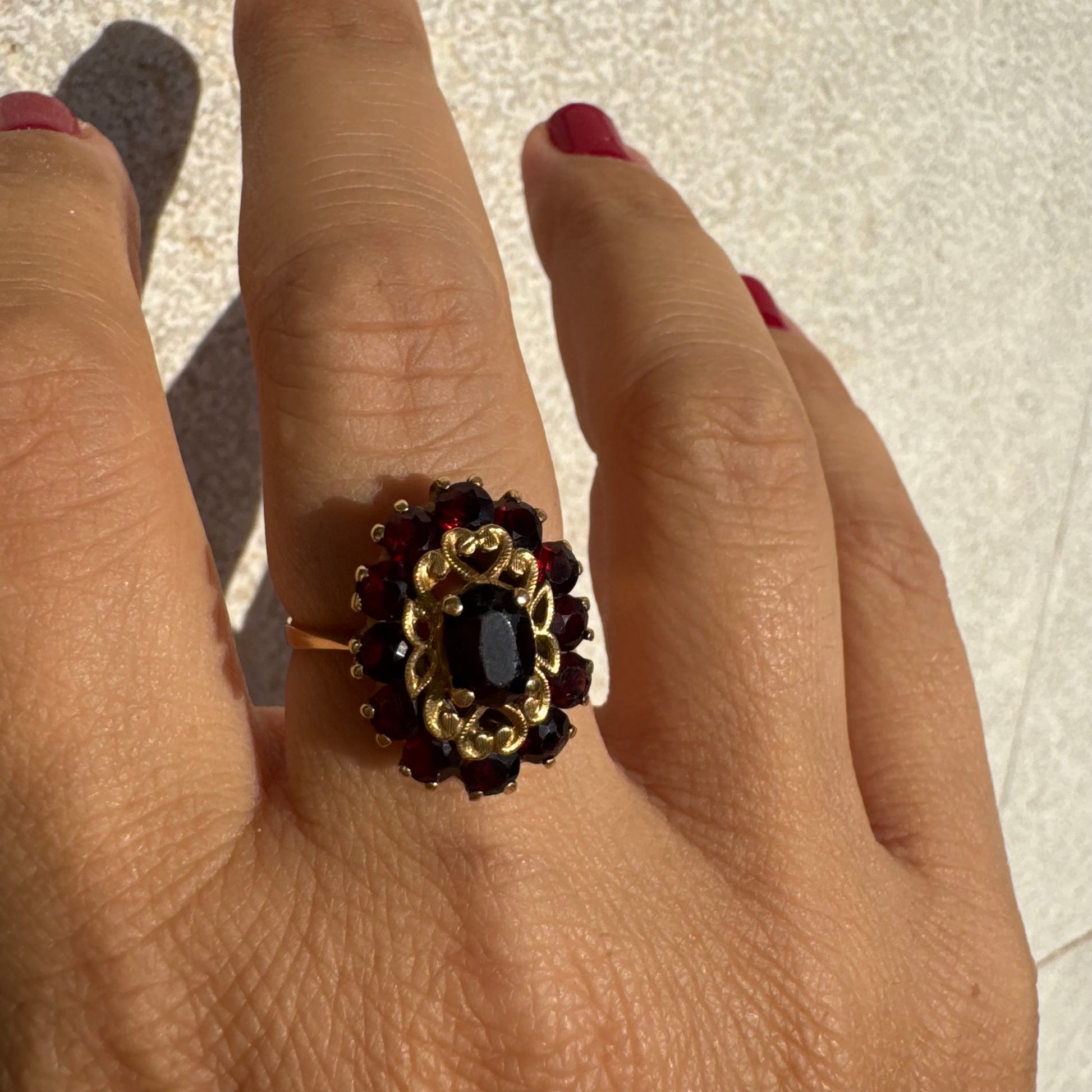 18K gold ring adorned with deep red Garnet gemstones, arranged in a radiant oval composition