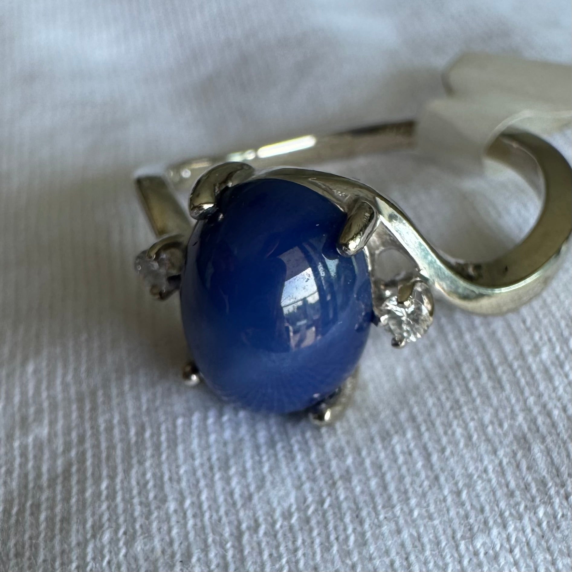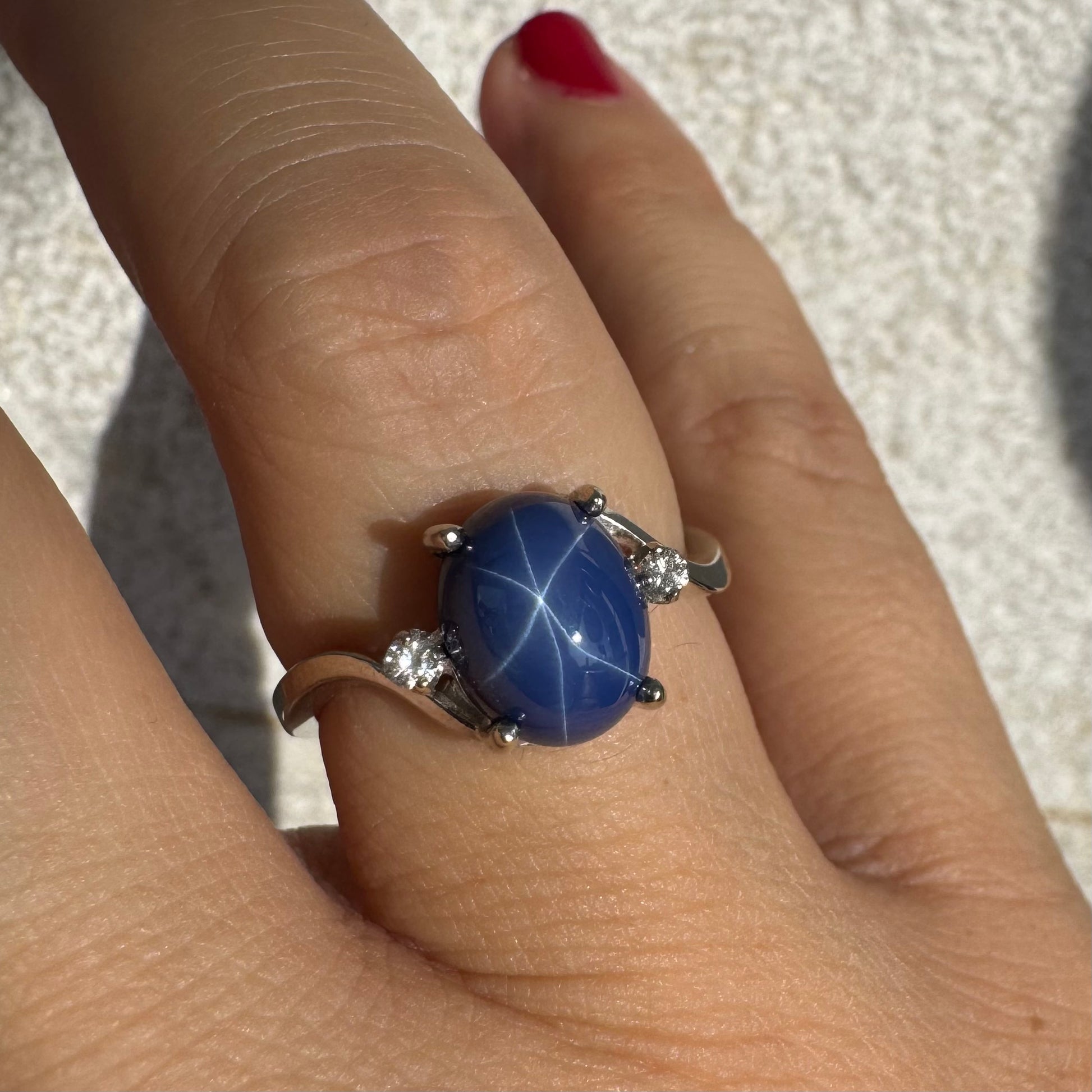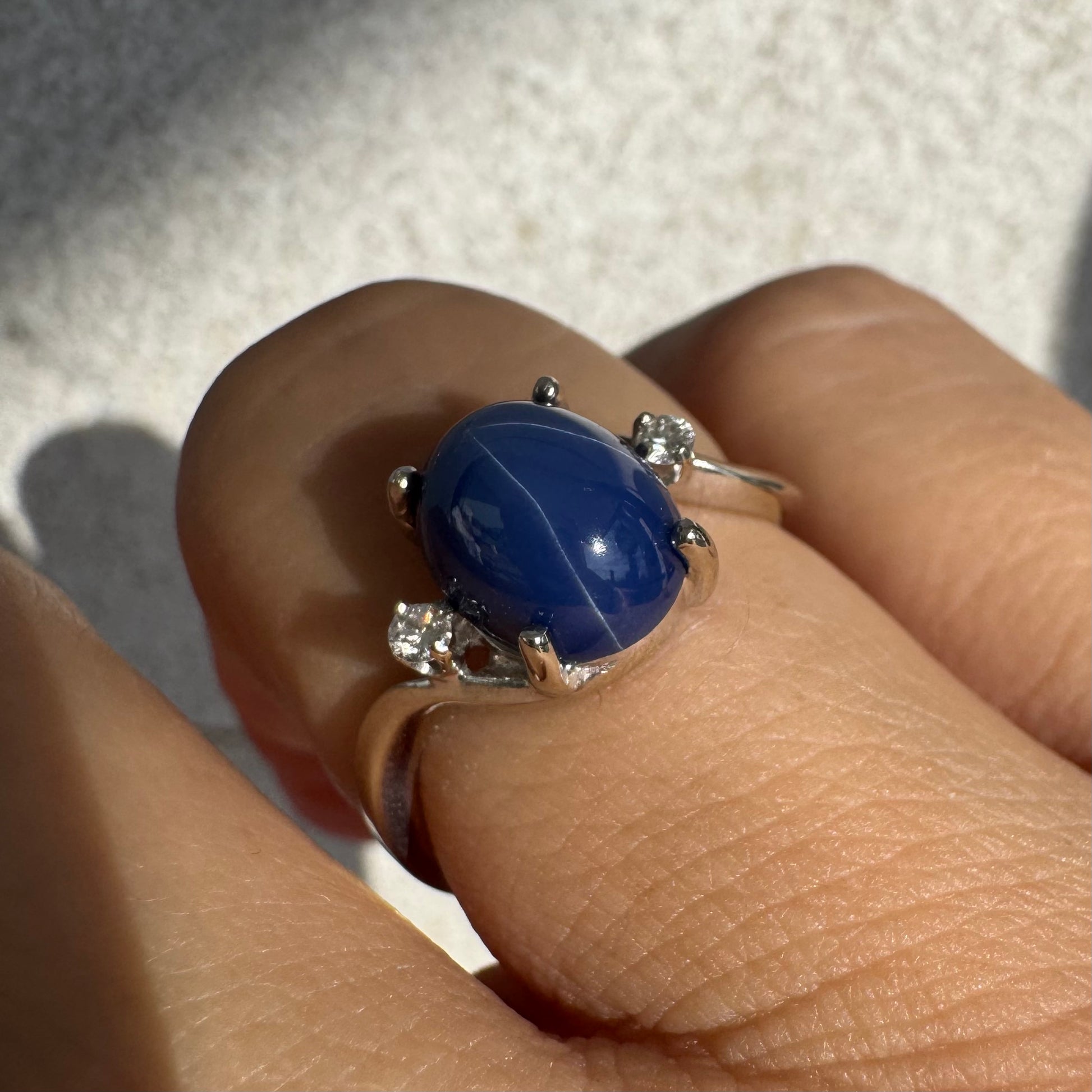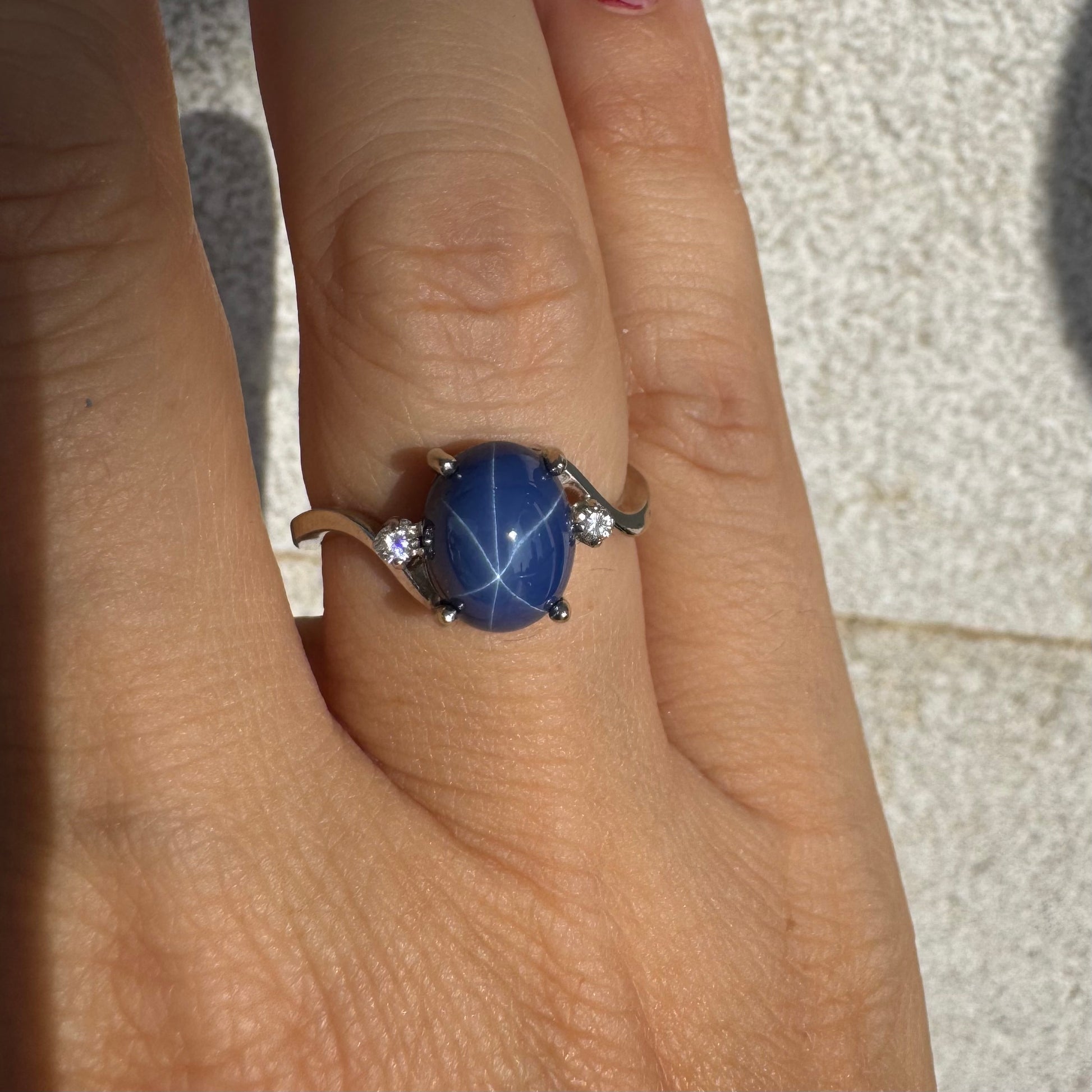 טבעת זהב לבן 14 קראט משובצת אבן ספיר כוכב מרהיבה, המציגה תופעת טבע של שישה קווים זוהרים, ובצידיה שני יהלומים מנצנצים. פריט וינטג’ נדיר ואלגנטי.