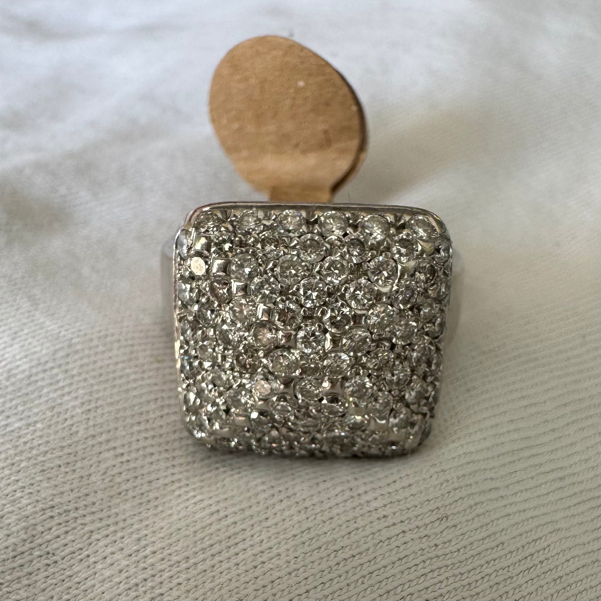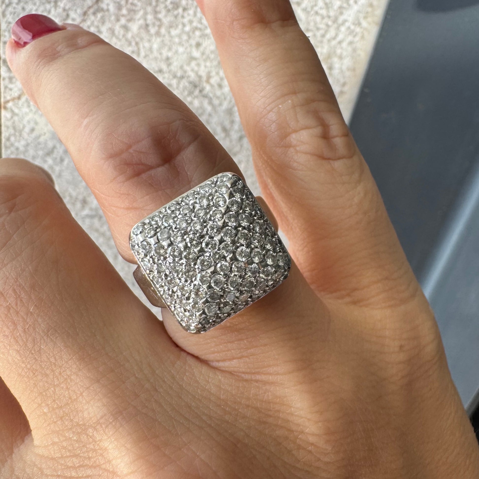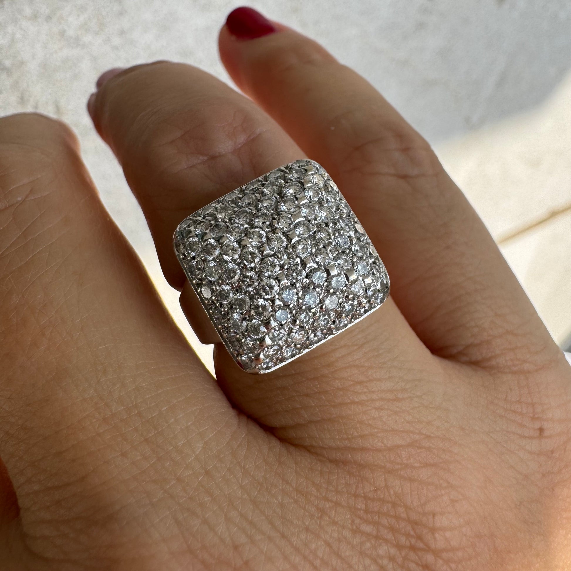 טבעת זהב לבן 18 קראט עם חלק עליון רחב בצורת ריבוע המשובץ כולו ביהלומים מנצנצים, ליצירת מראה יוקרתי ונוצץ.