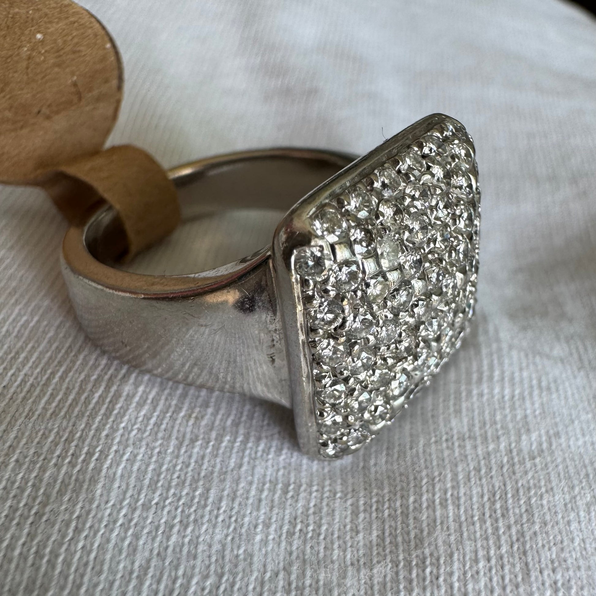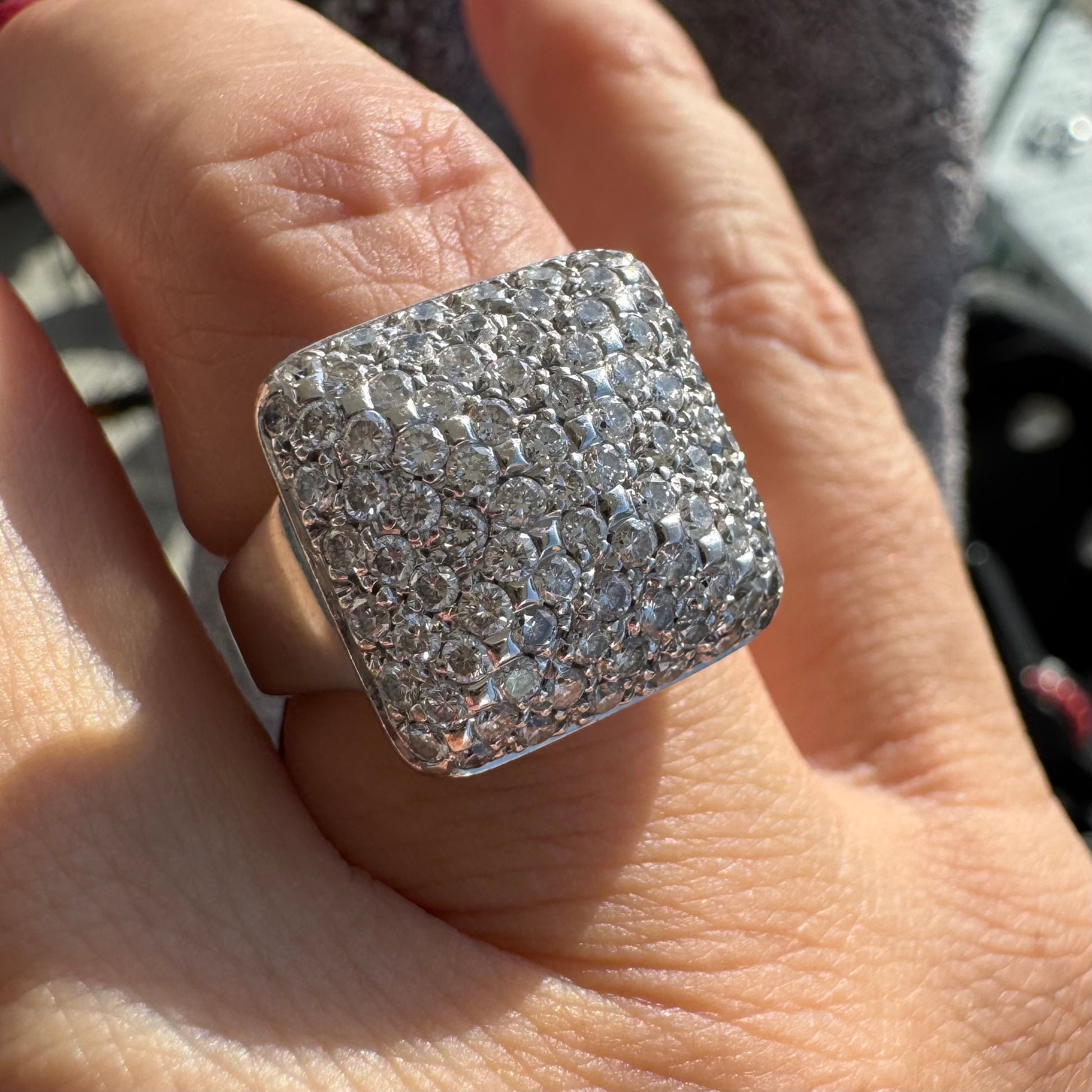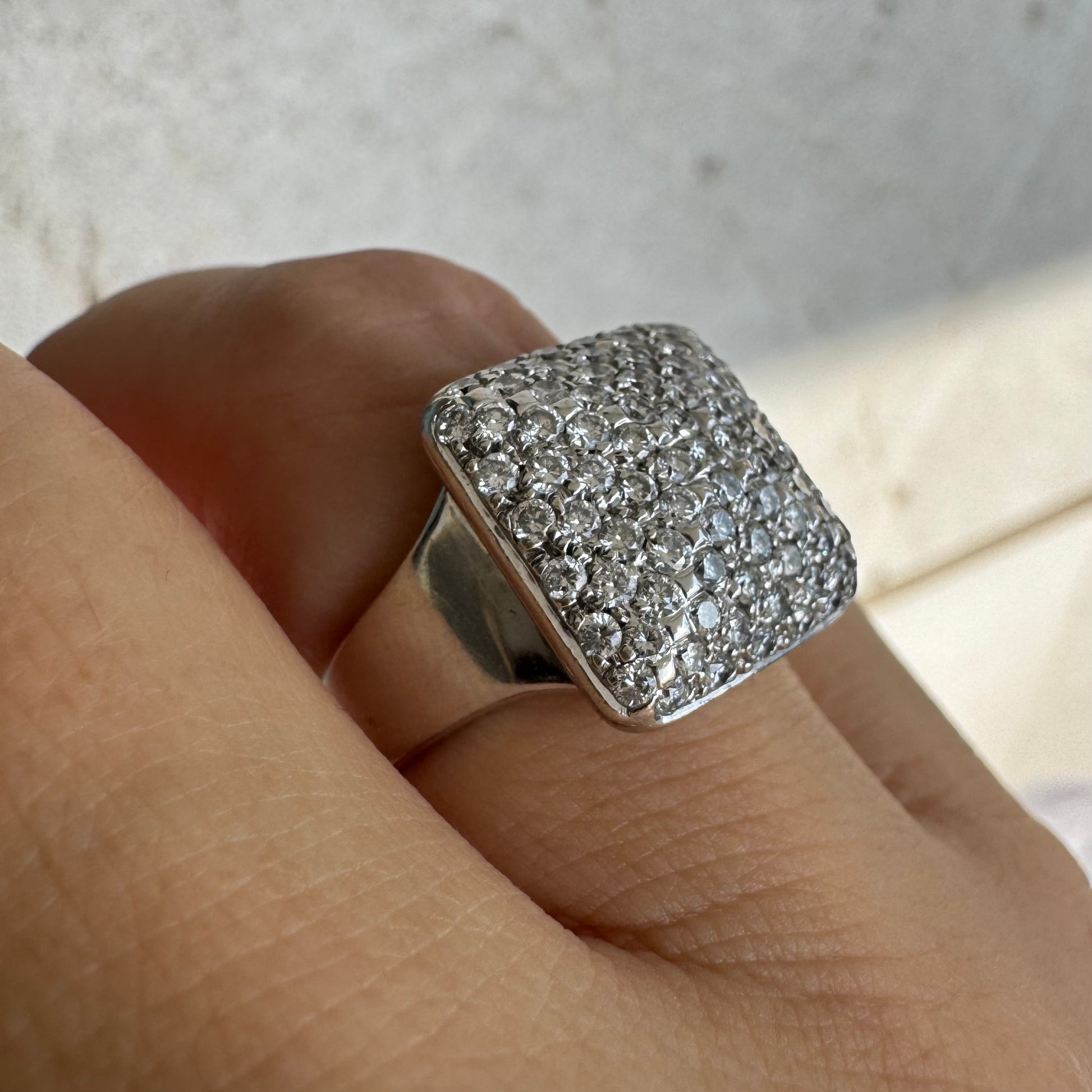 טבעת זהב לבן 18 קראט עם חלק עליון רחב בצורת ריבוע המשובץ כולו ביהלומים מנצנצים, ליצירת מראה יוקרתי ונוצץ.