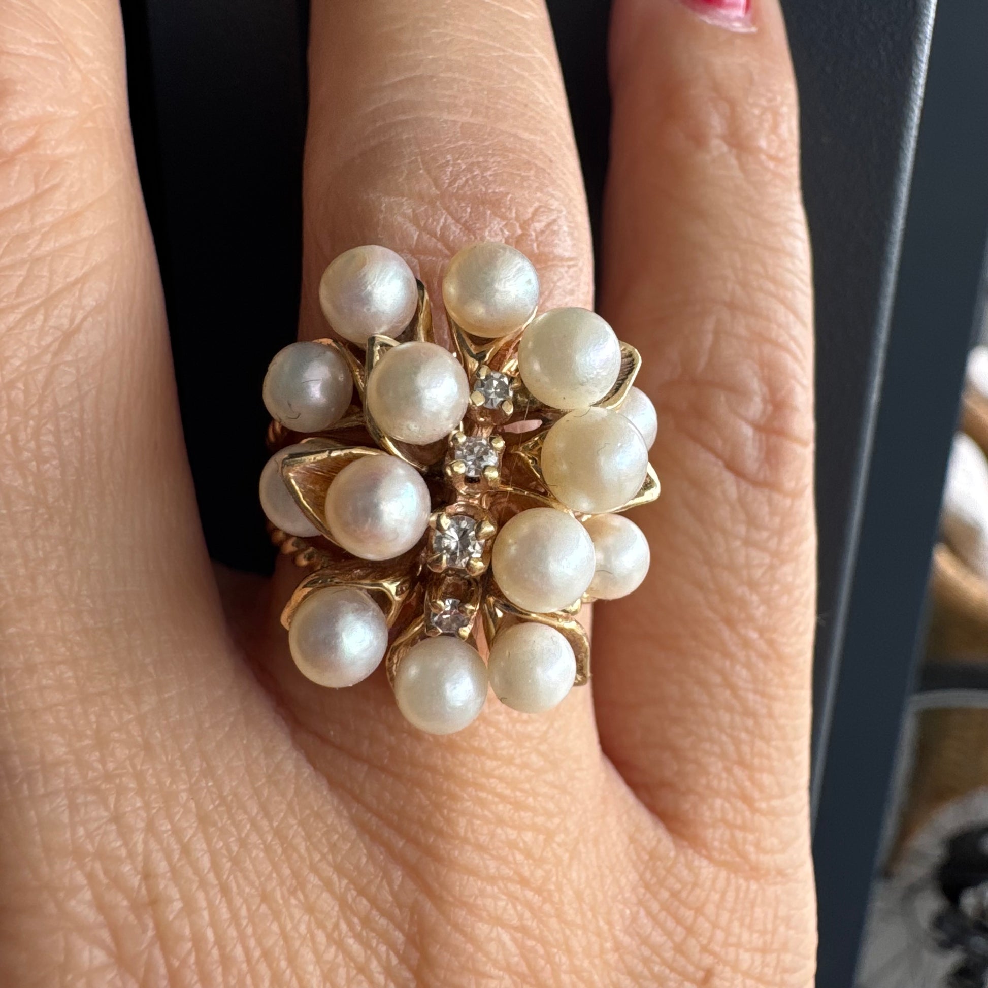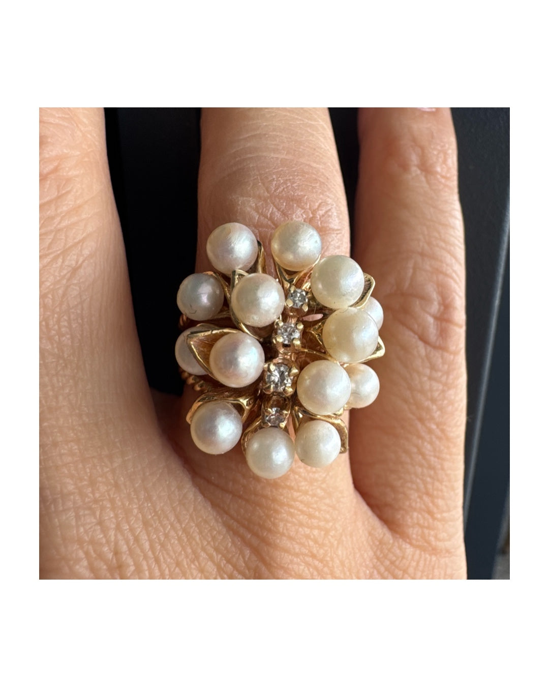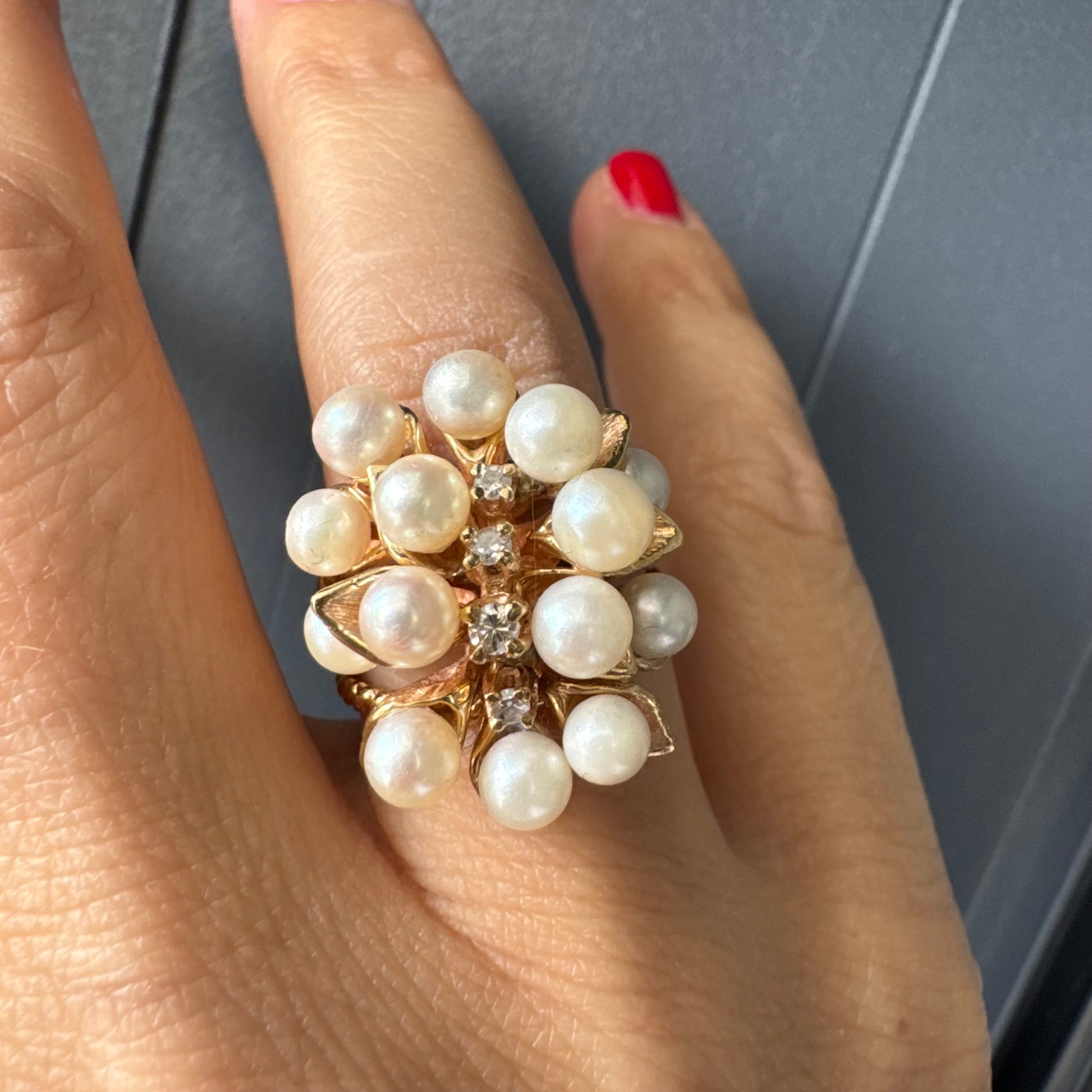 טבעת זהב צהוב 14 קראט משובצת בשפע של פנינים עגולות ולבנות, עם שורת יהלומים קטנים במרכז – יוצרת מראה פרחוני וזוהר שמושך את העין.