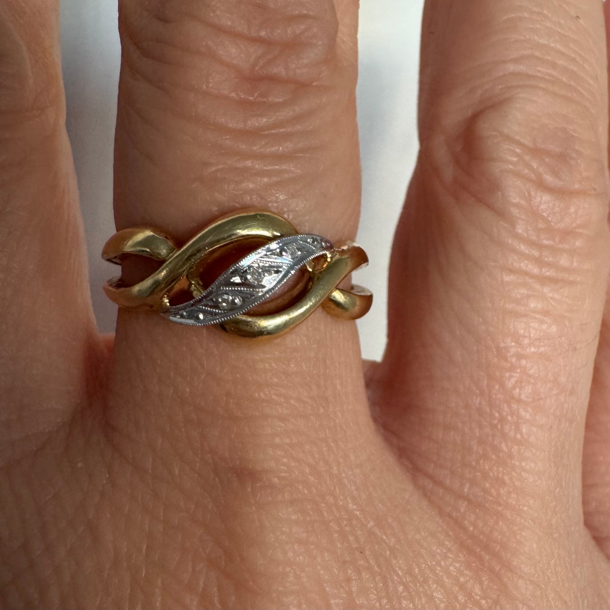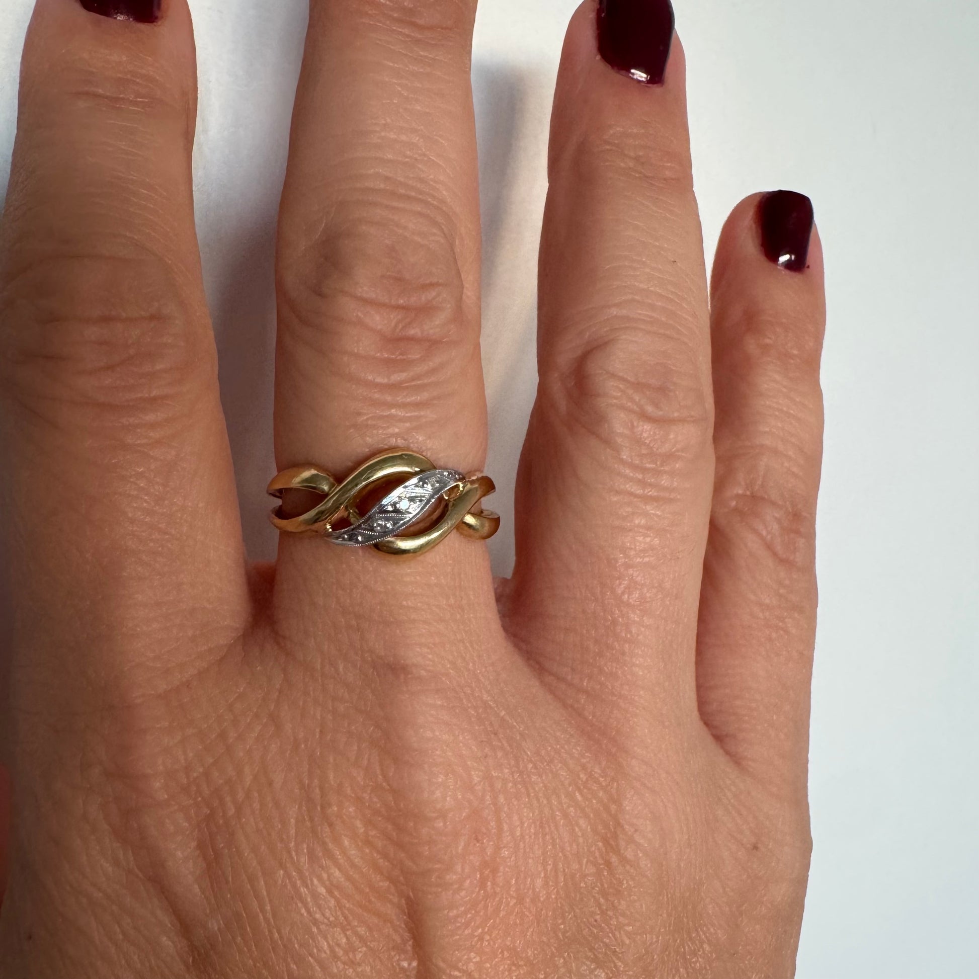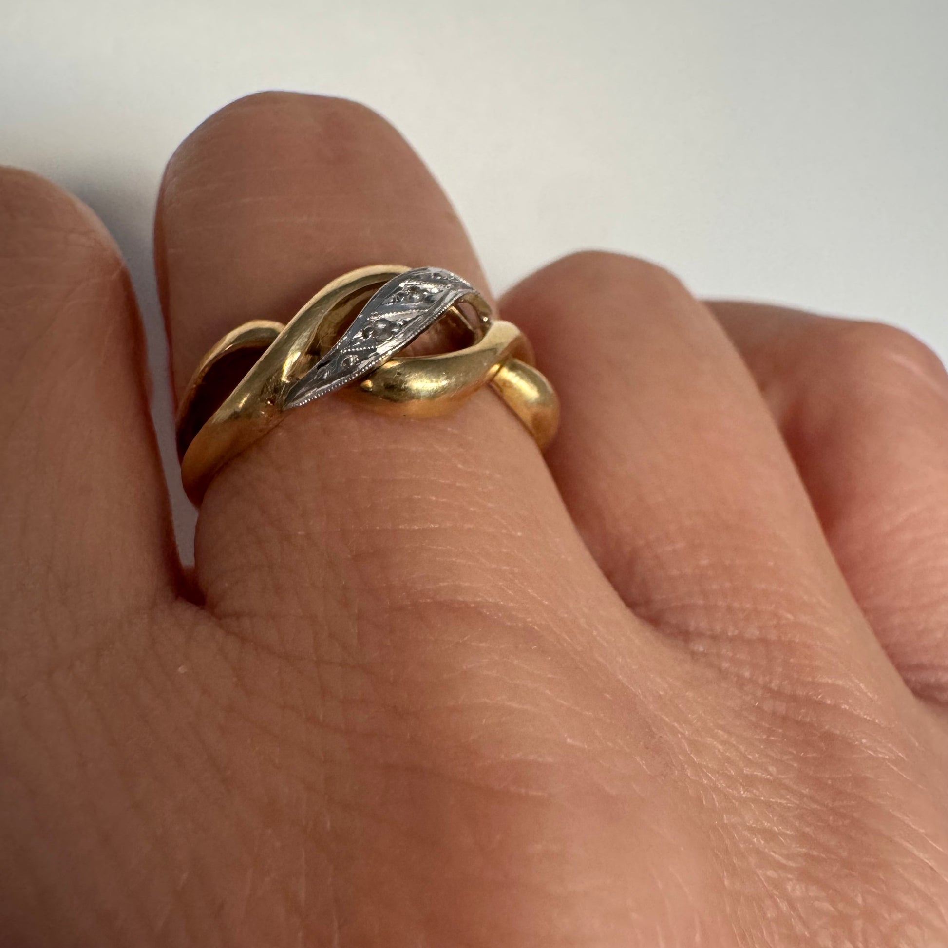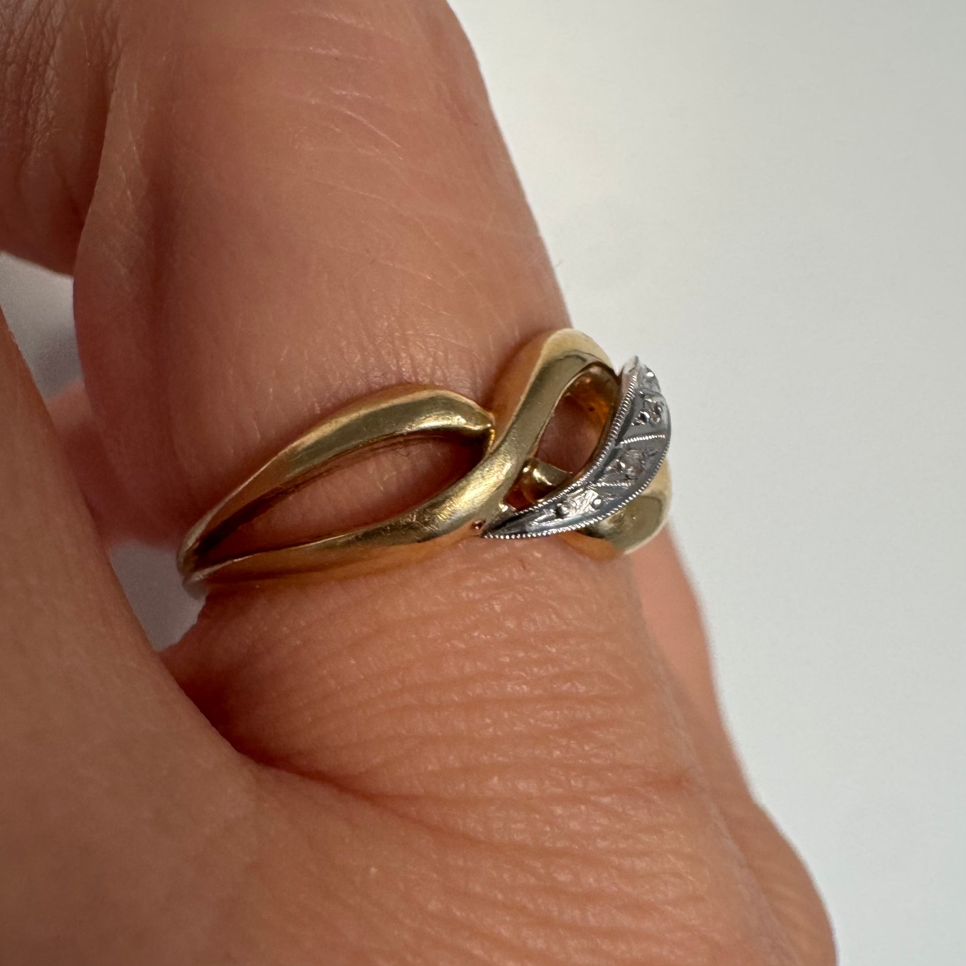 טבעת זהב צהוב 18 קראט בעיצוב קשר קלאסי, בשילוב אלמנט מרכזי מזהב לבן משובץ יהלומים עדינים.