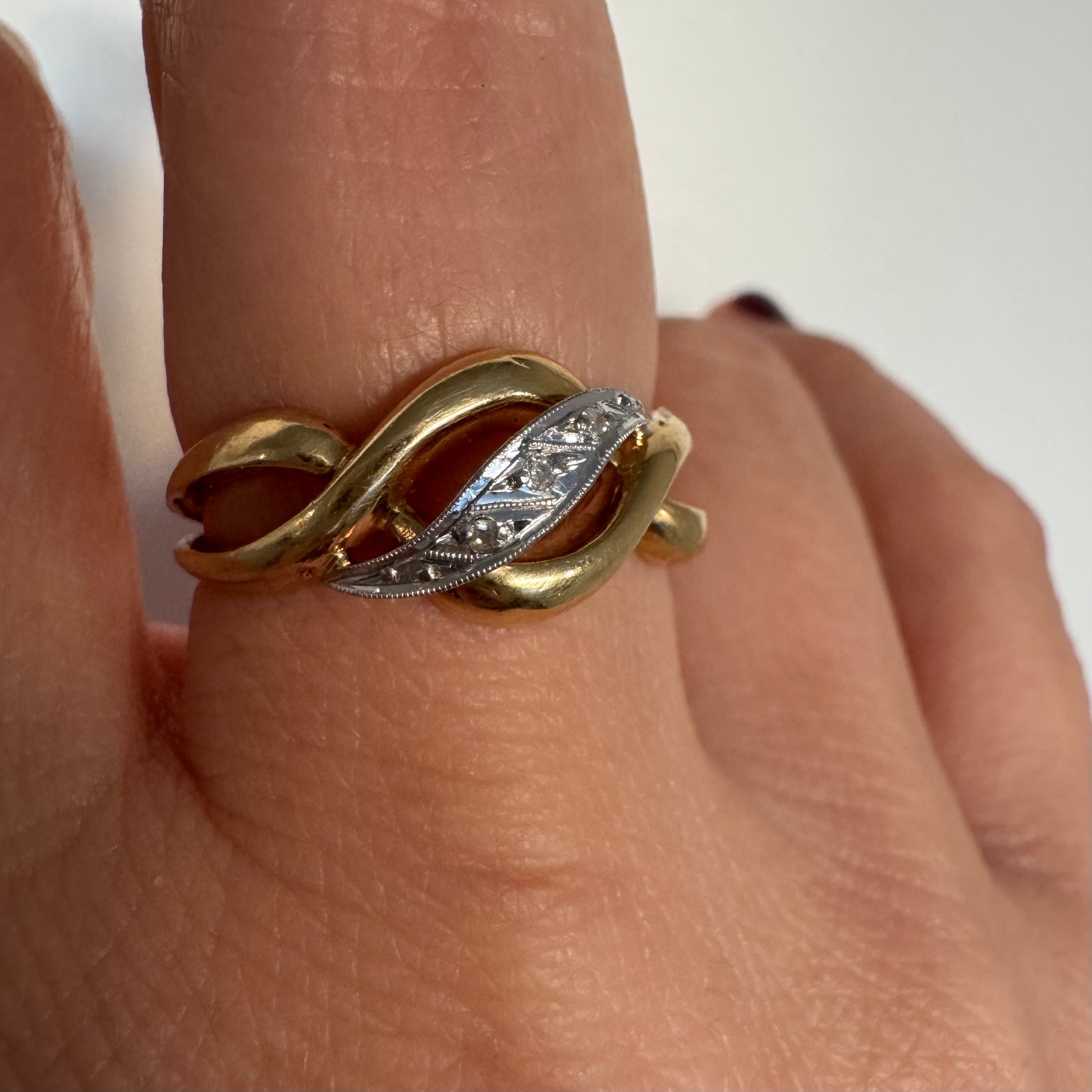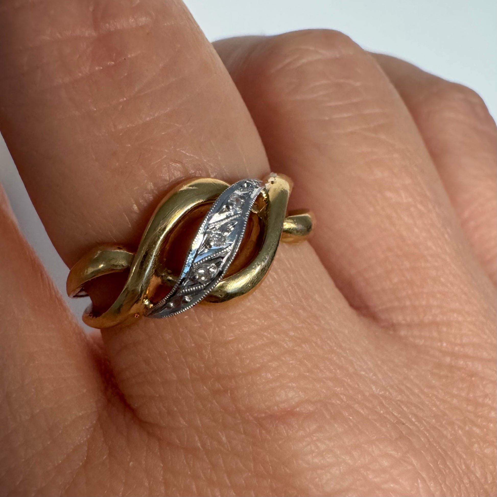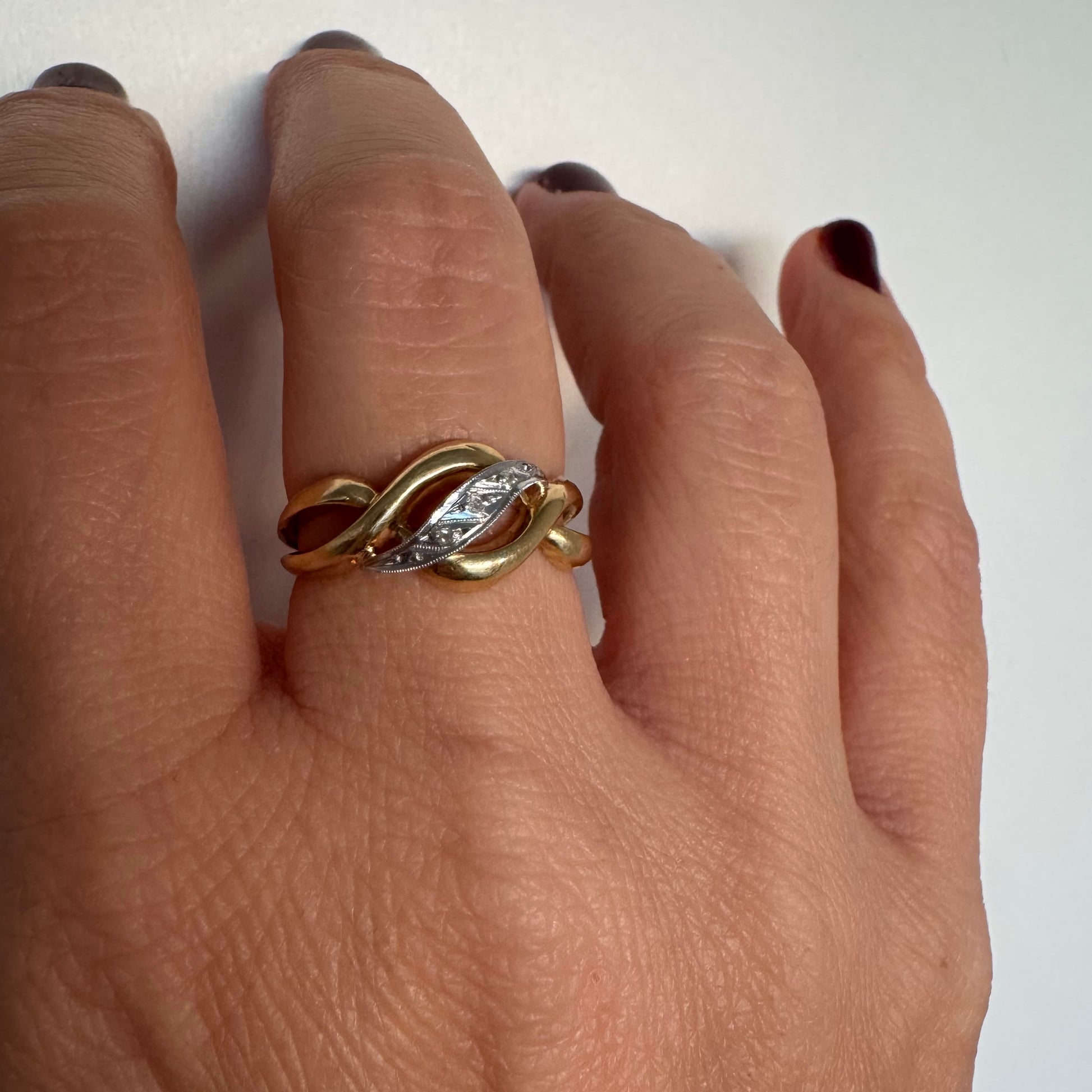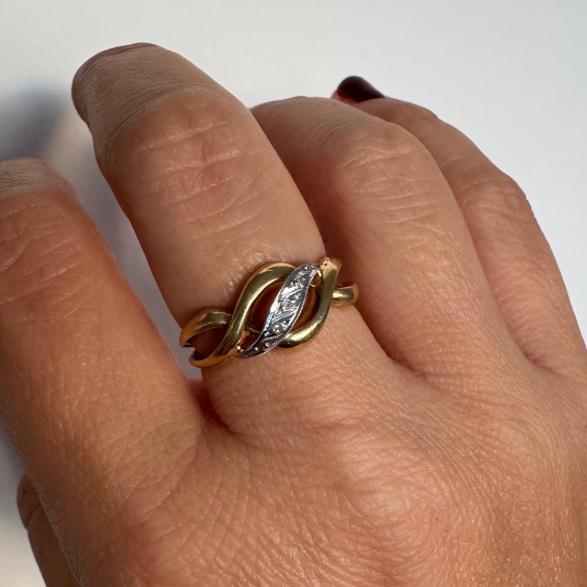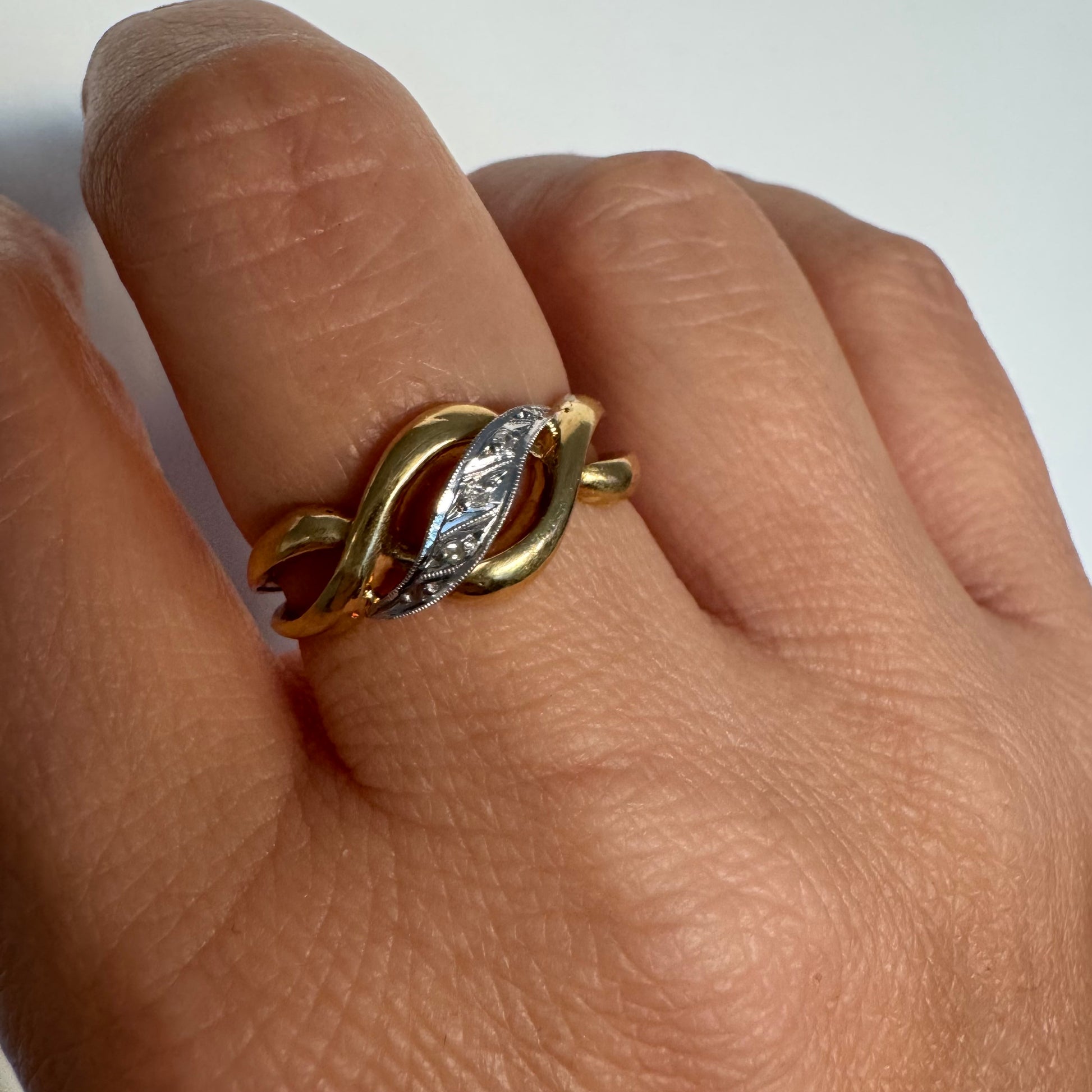 טבעת זהב צהוב 18 קראט בעיצוב קשר קלאסי, בשילוב אלמנט מרכזי מזהב לבן משובץ יהלומים עדינים.