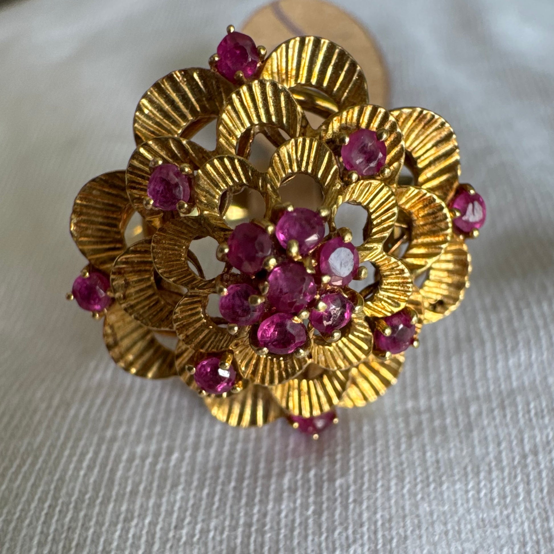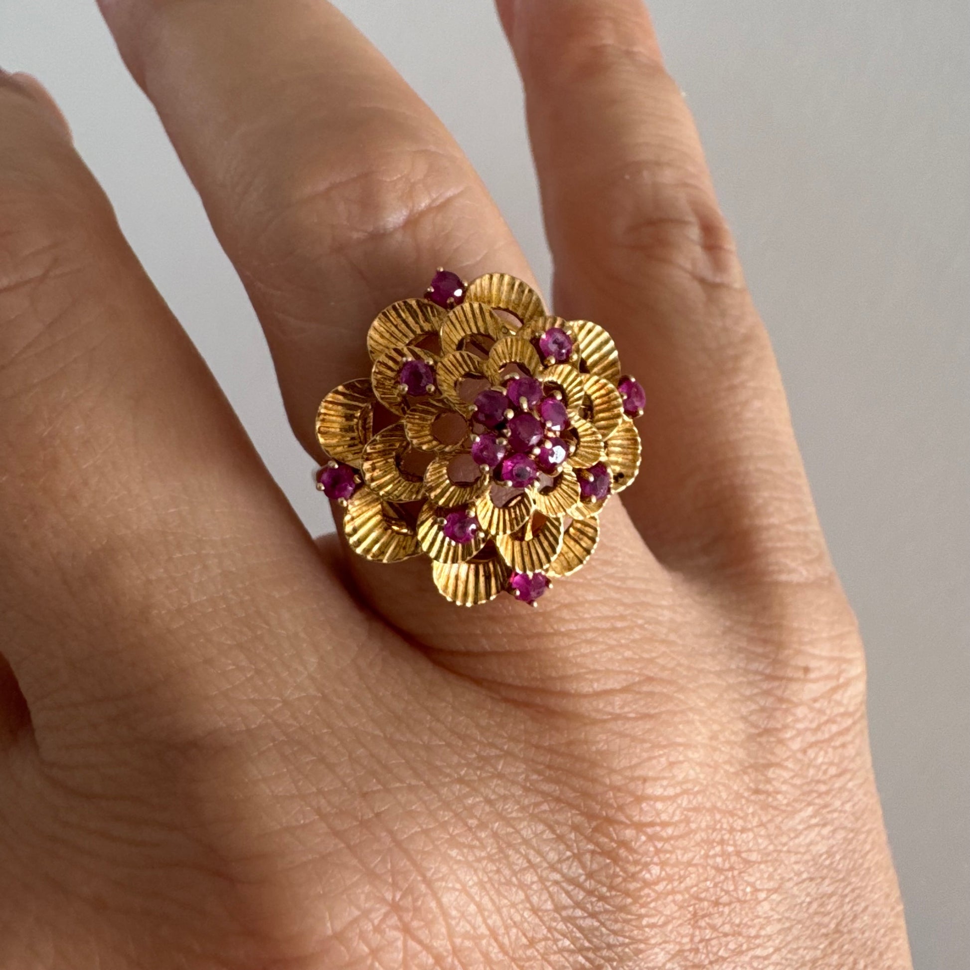 טבעת זהב צהוב 18 קראט, מעוטרת באבני רובי קטנות בצבע ורוד-אדום.