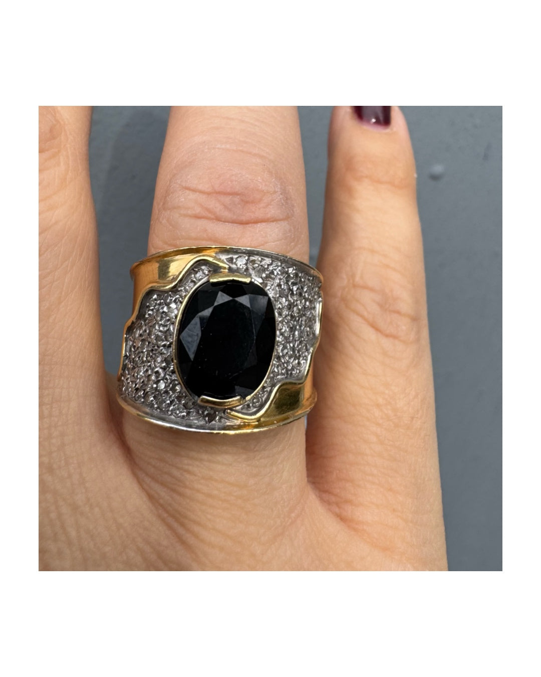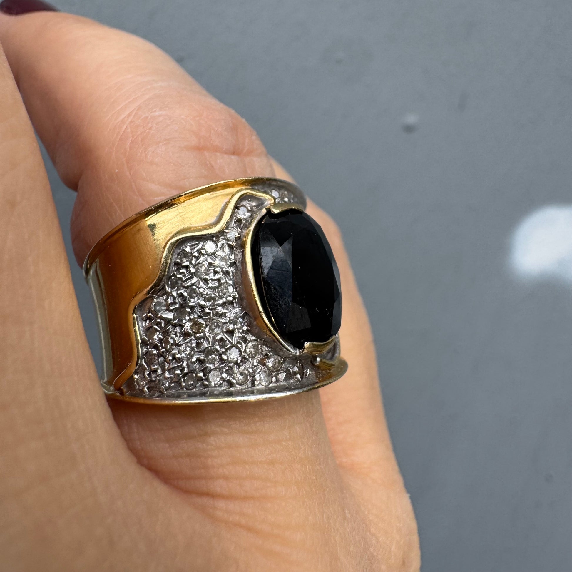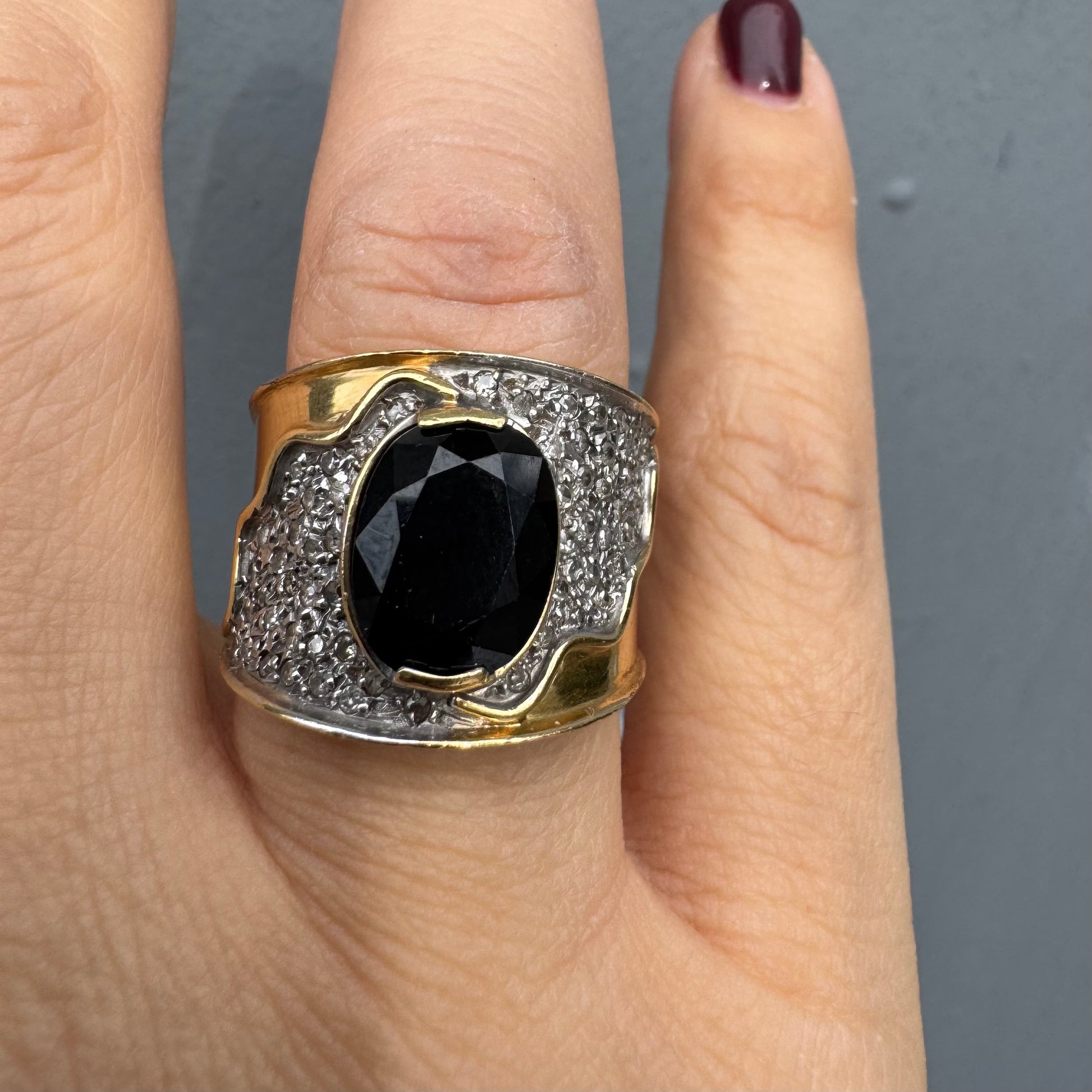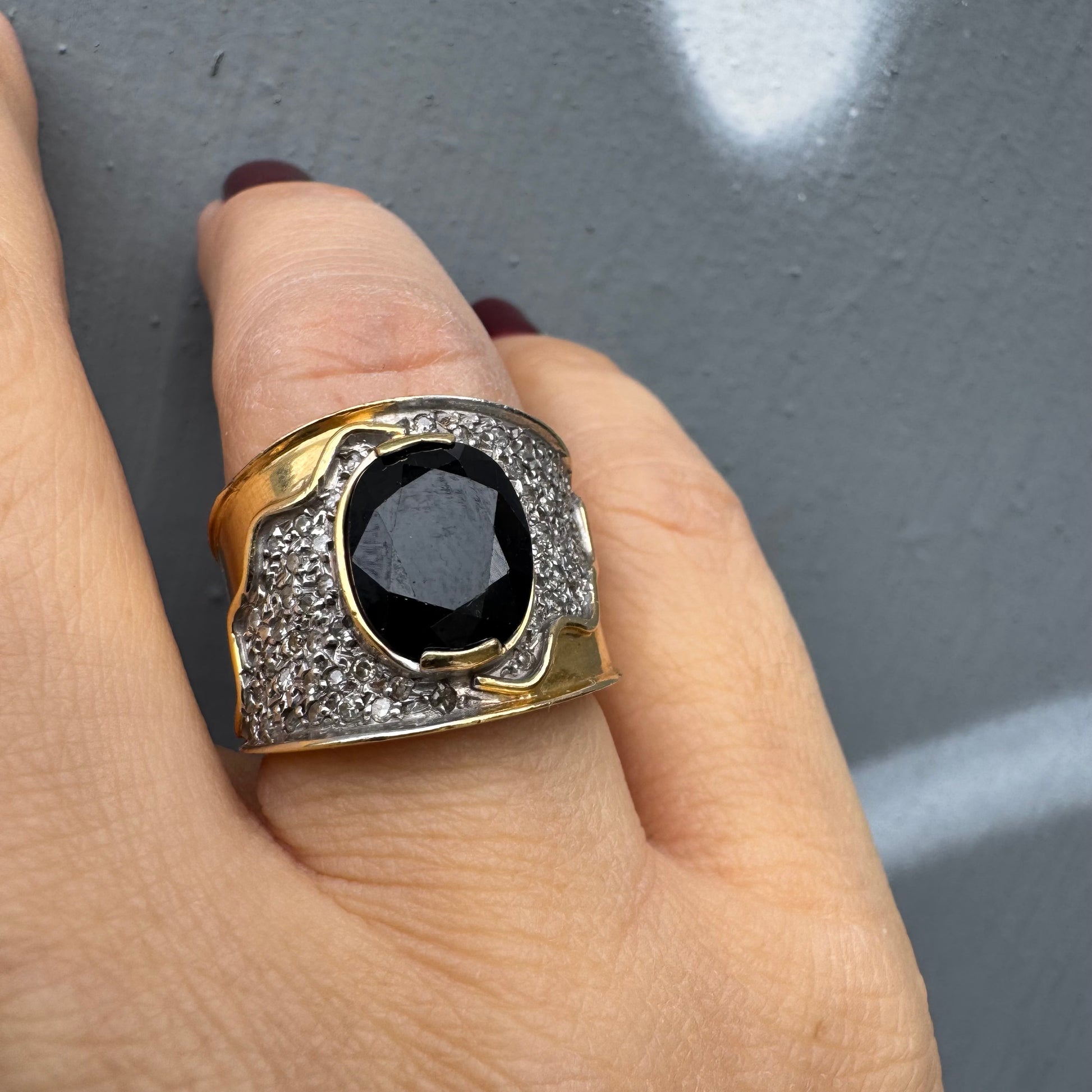 טבעת זהב צהוב 18 קראט משובצת יהלומים ואבן ספיר בצבע כחול כהה במרכז בעלת עיצוב דרמטי ואלגנטי בסגנון וינטג׳-יוקרתי