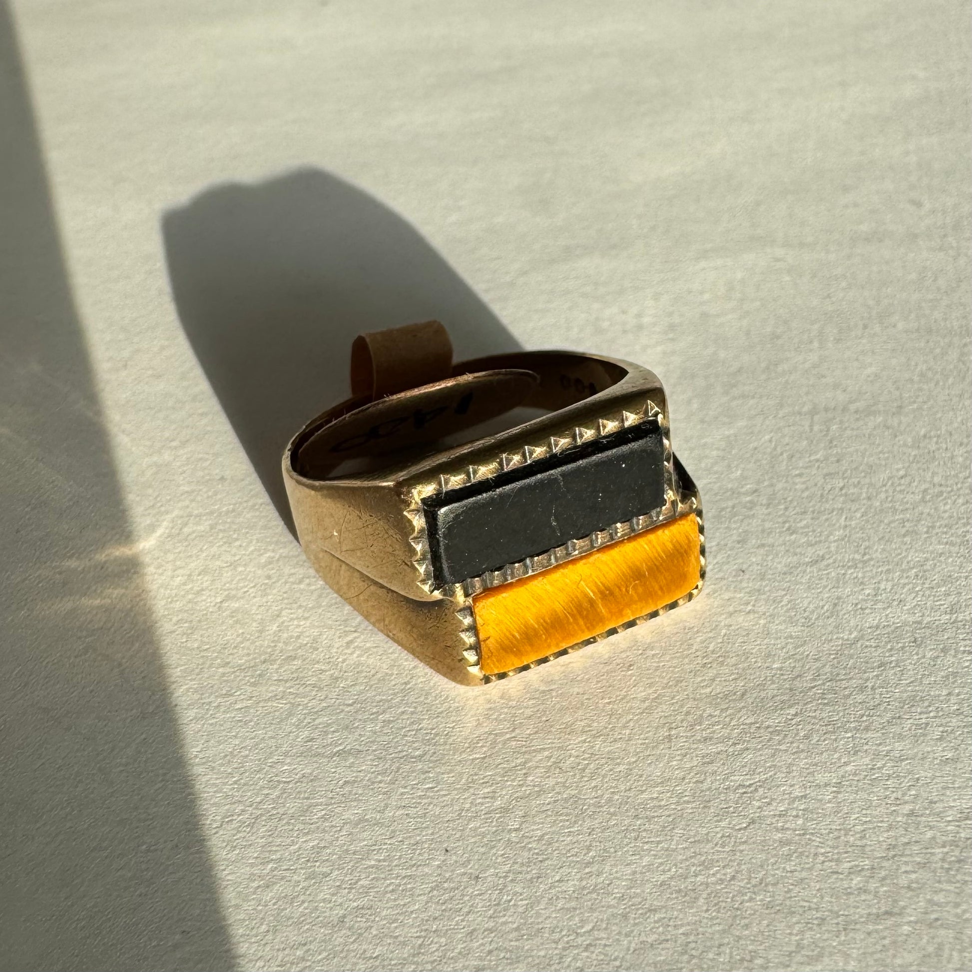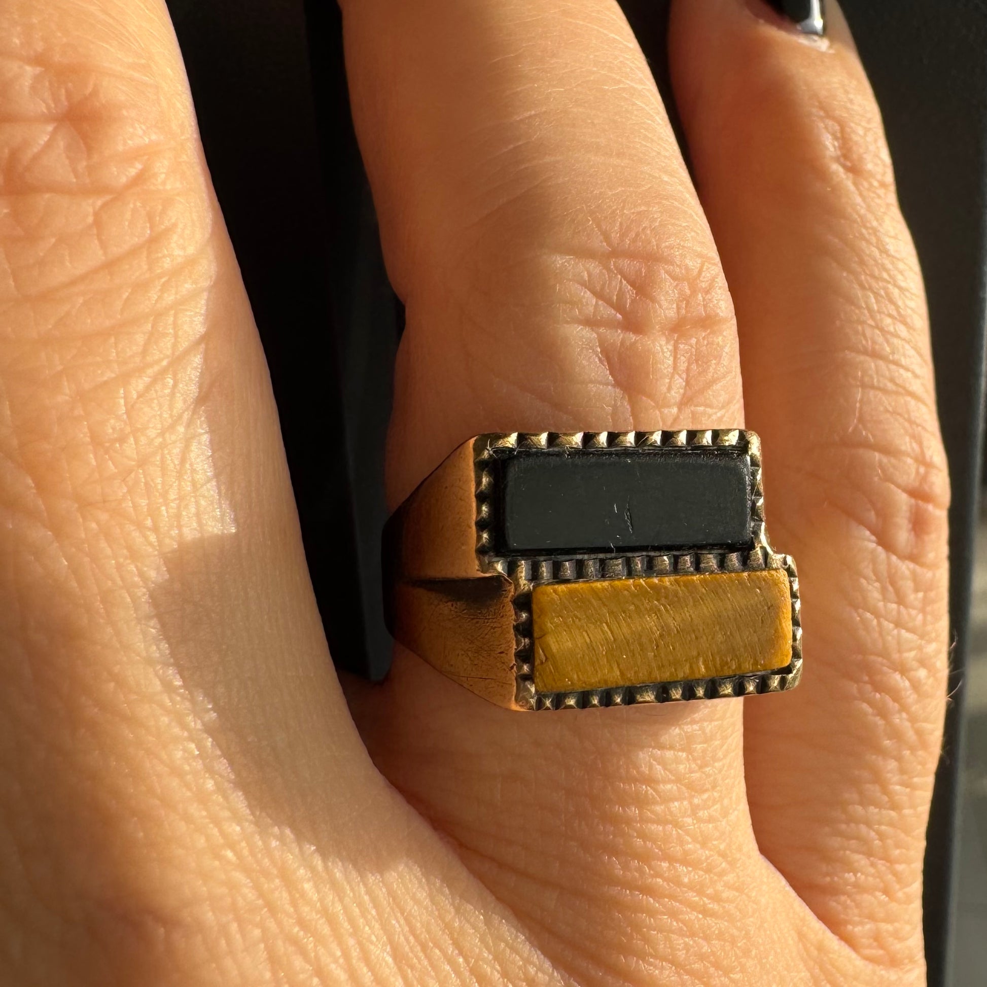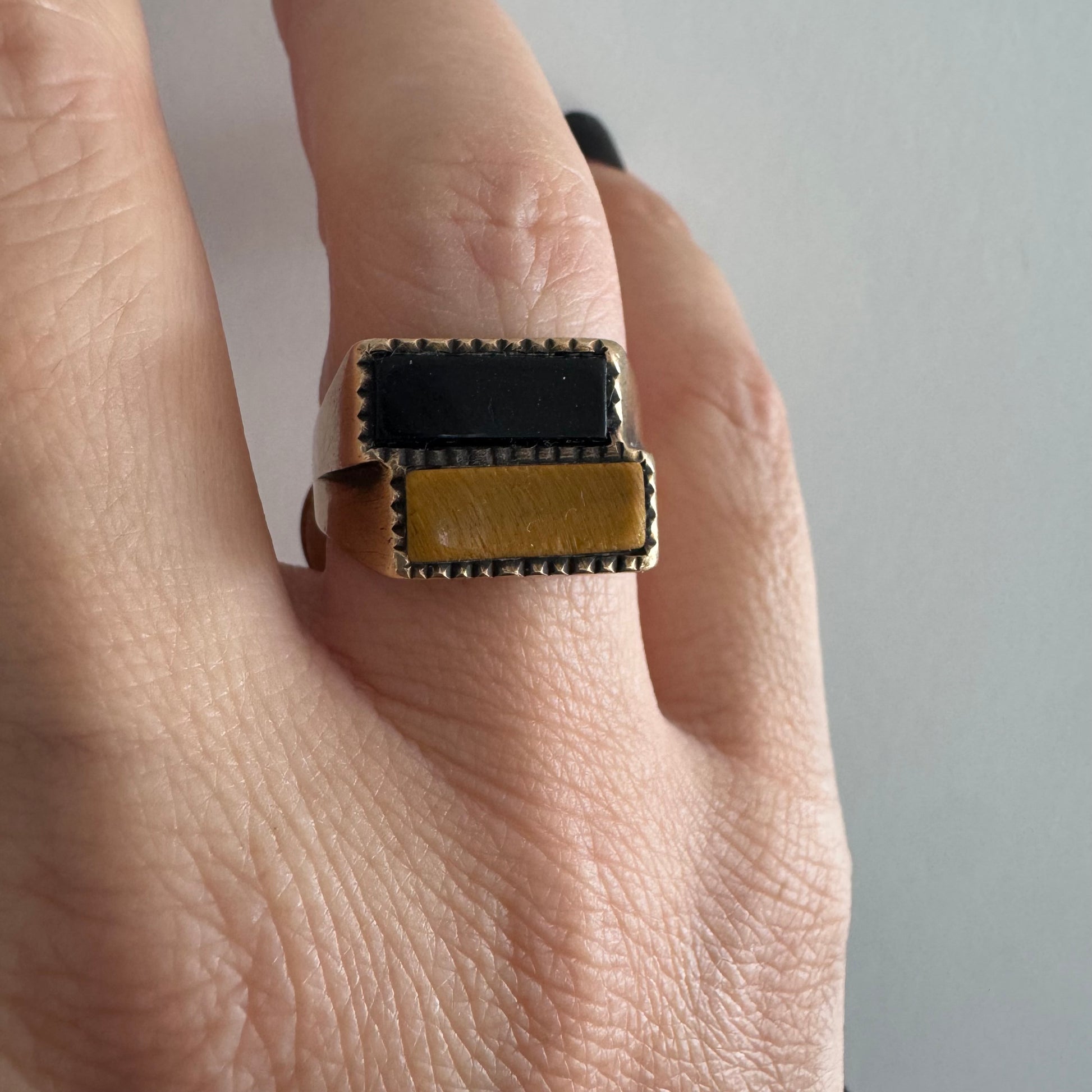 טבעת זהב צהוב 9 קראט משובצת אבן אוניקס בצבע שחור ואבן ״עין הנמר״