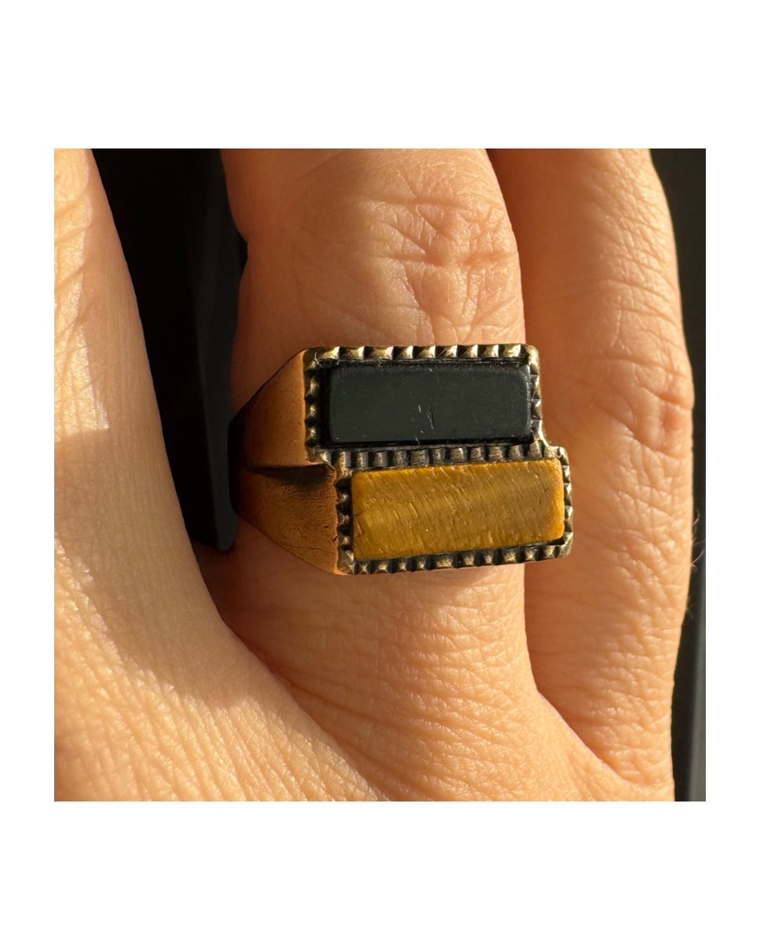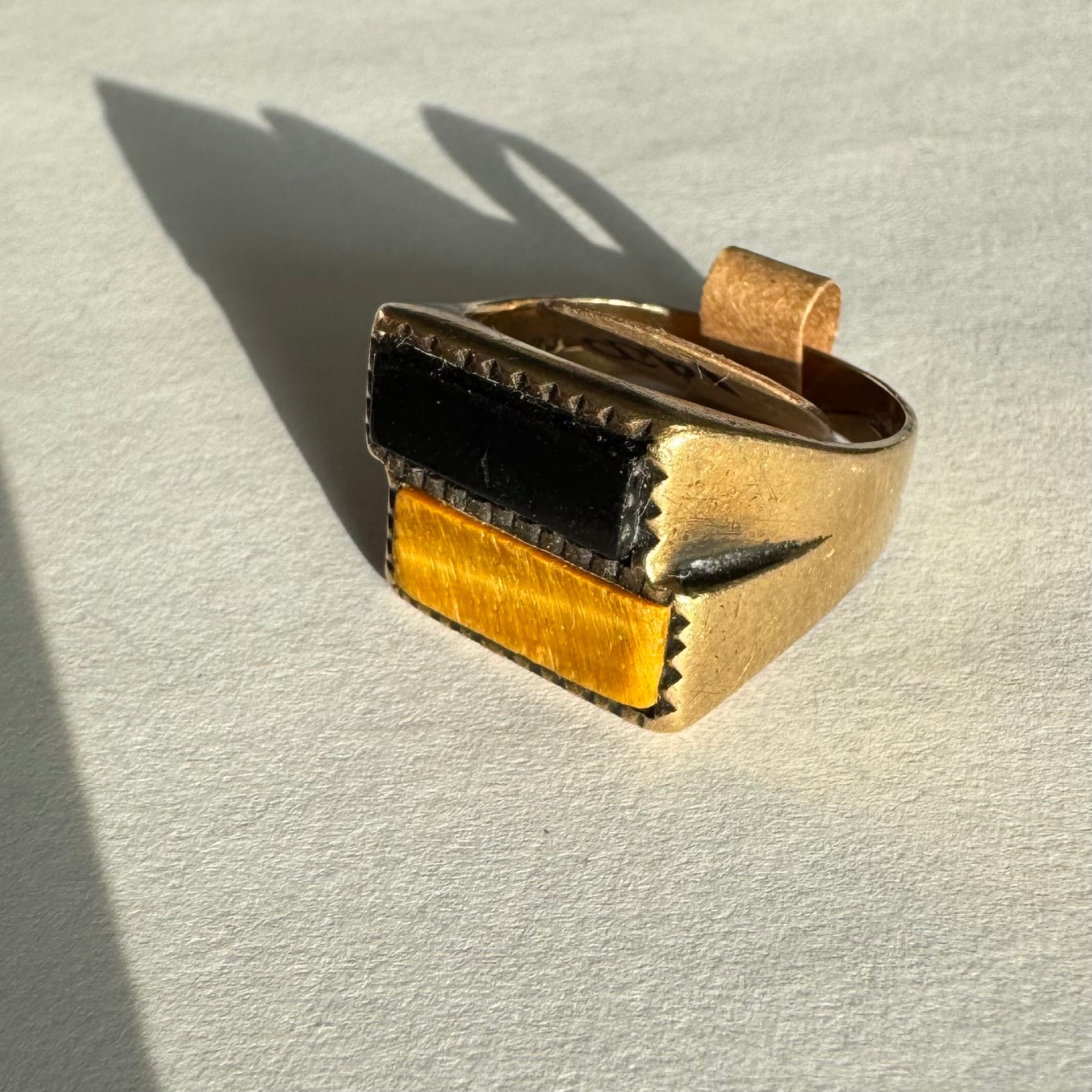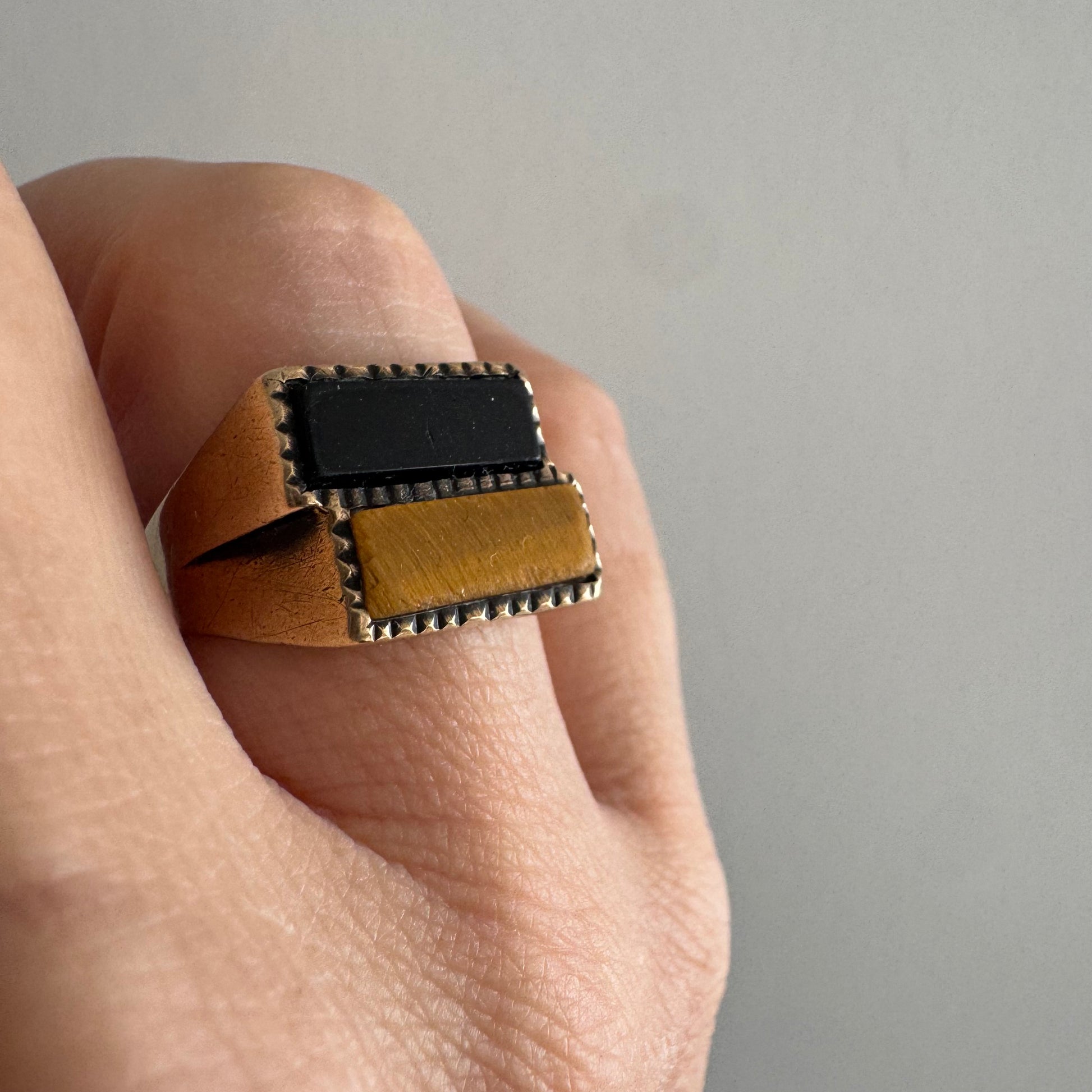 טבעת זהב צהוב 9 קראט משובצת אבן אוניקס בצבע שחור ואבן ״עין הנמר״