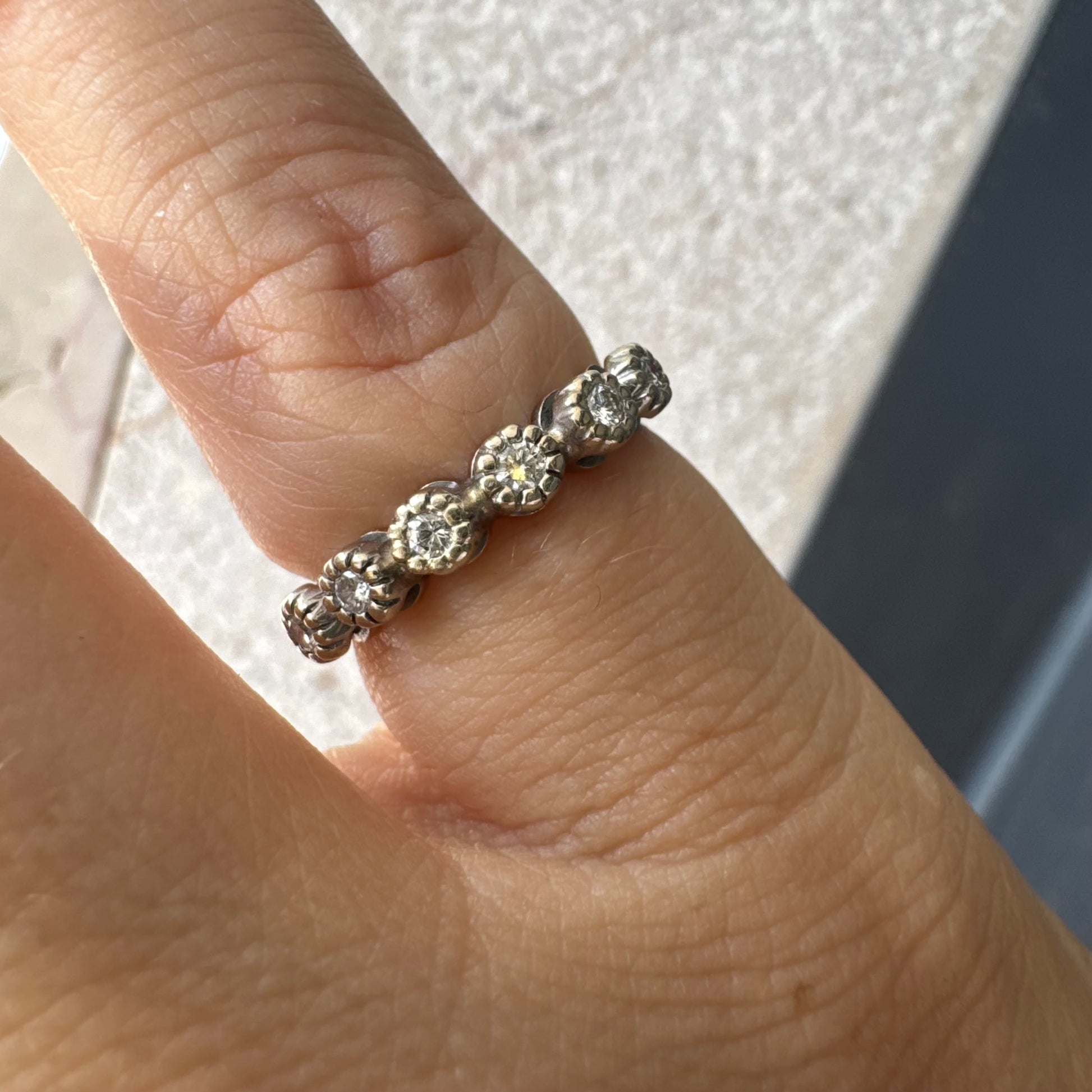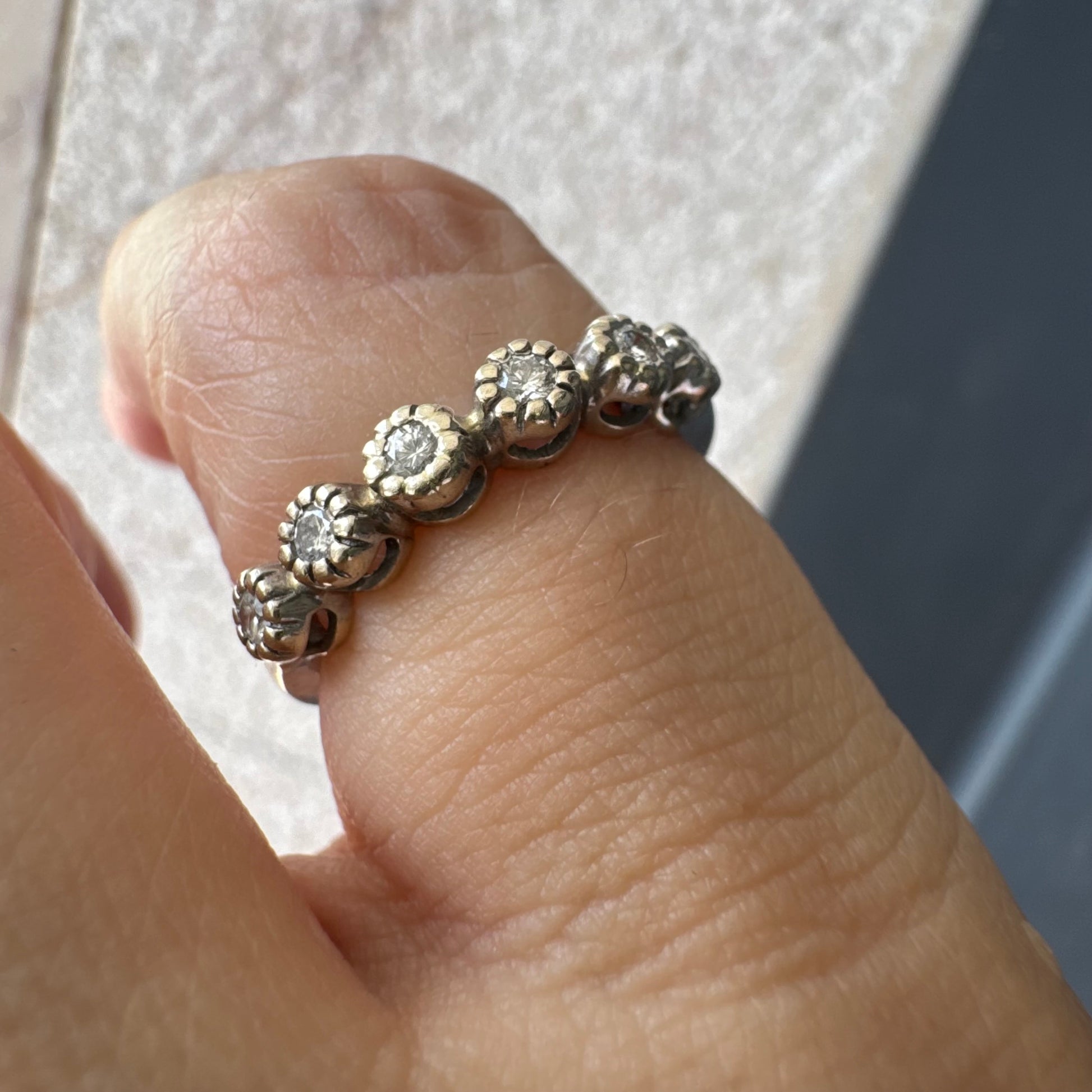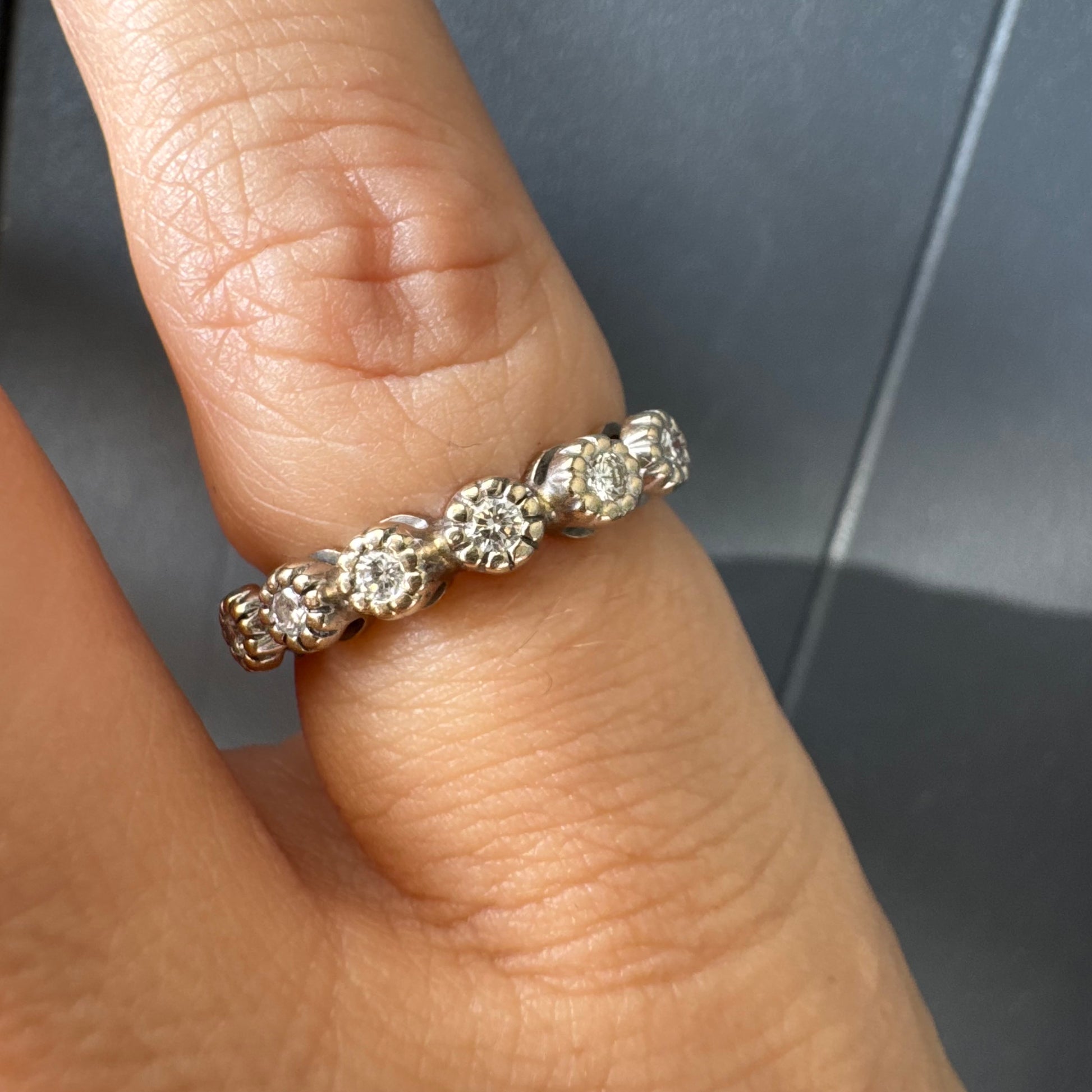 טבעת זהב 14 קראט בסגנון “חצי איטרניטי”, משובצת יהלומים עגולים בחיתוך עגול במסגרת עדינה בהשראת פרחים.