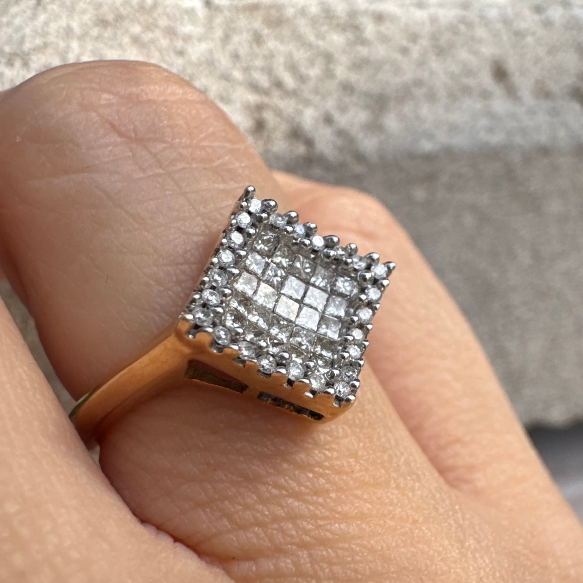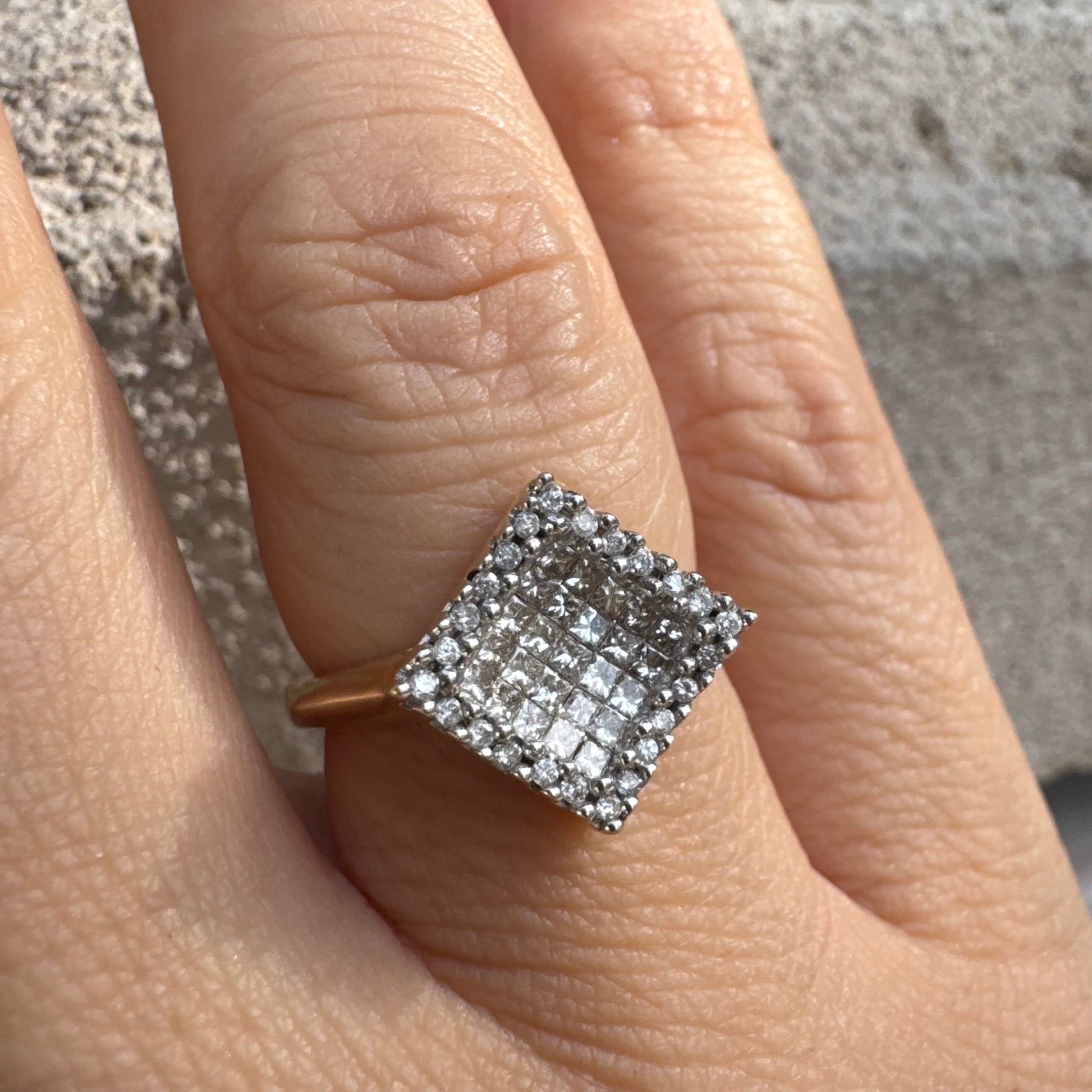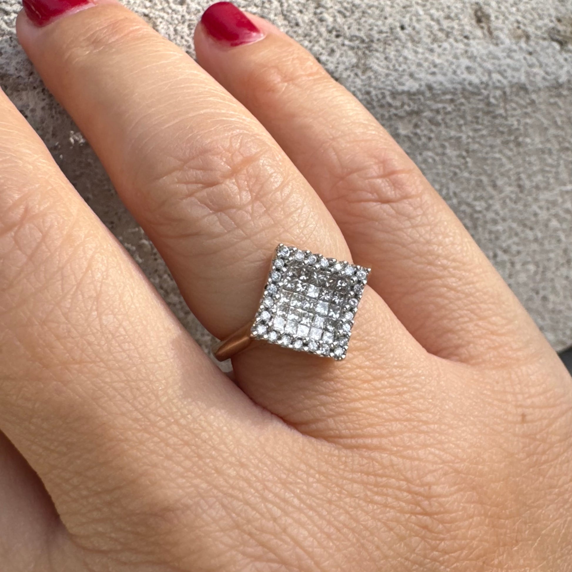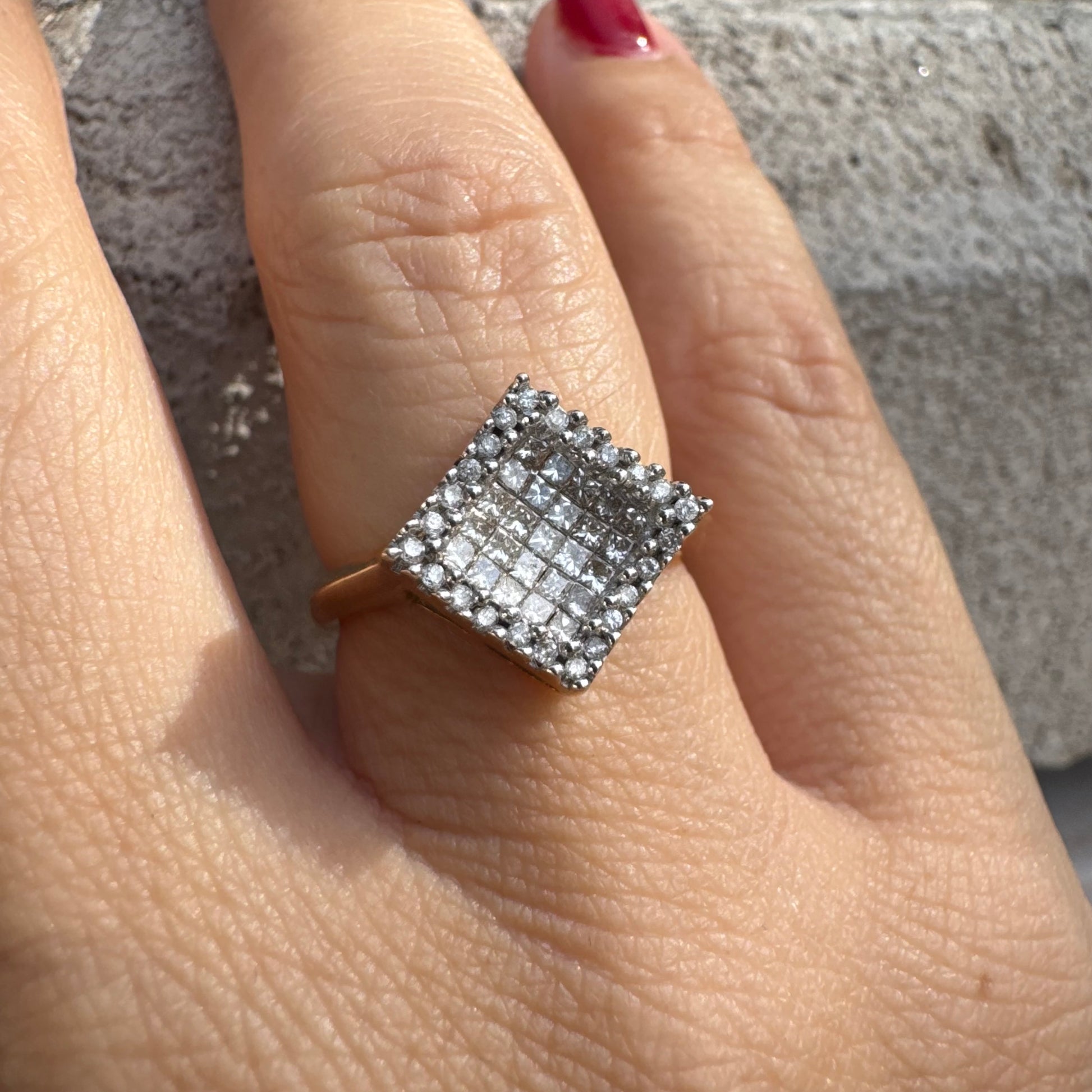 טבעת זהב 14 קראט בעיצוב ריבועי משובצת יהלומים בחיתוך פרינסס ומוקפת מסגרת יהלומים עגולים.