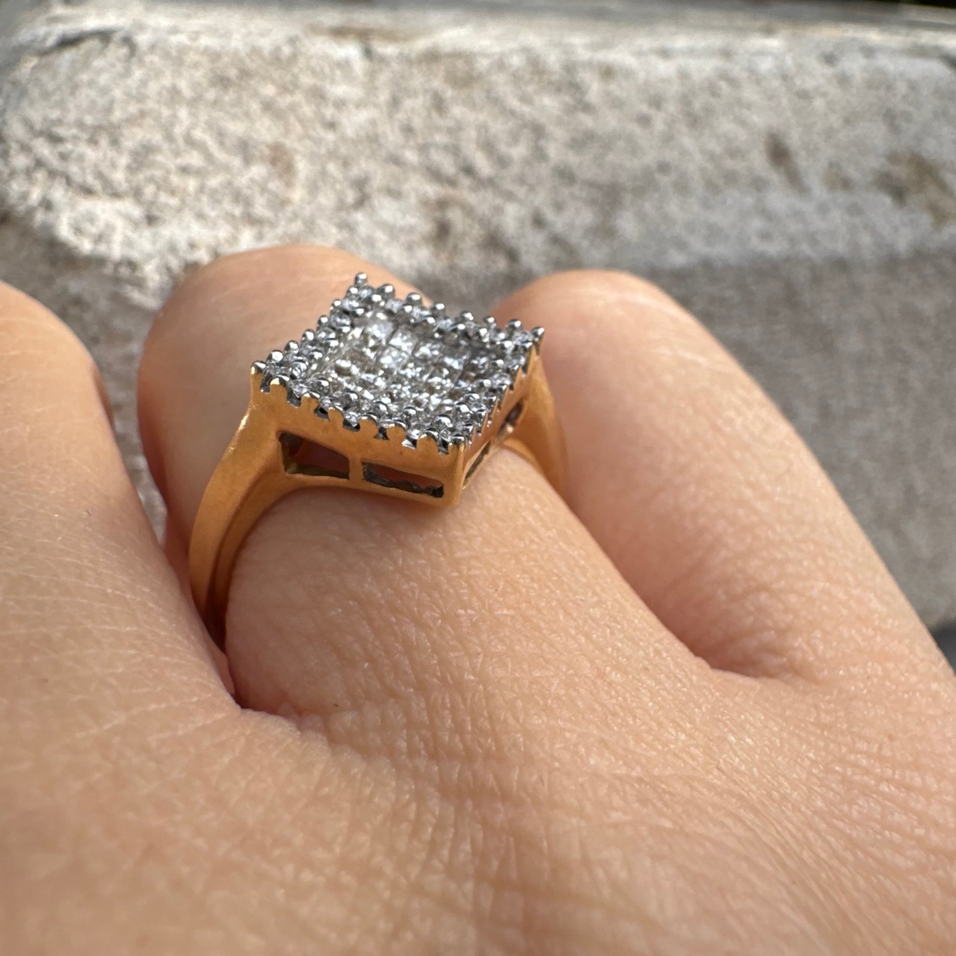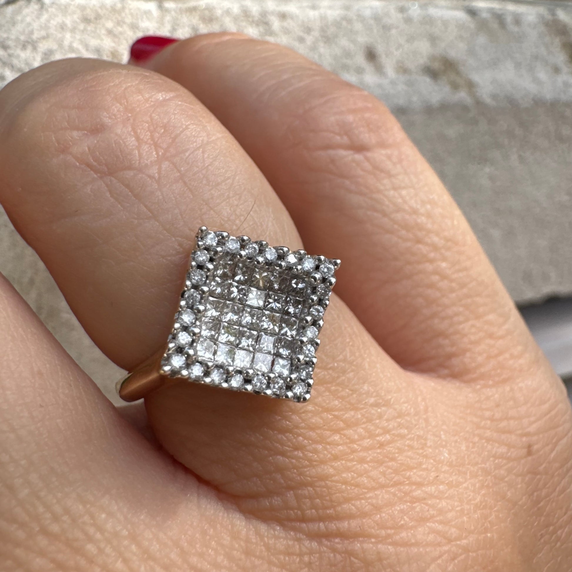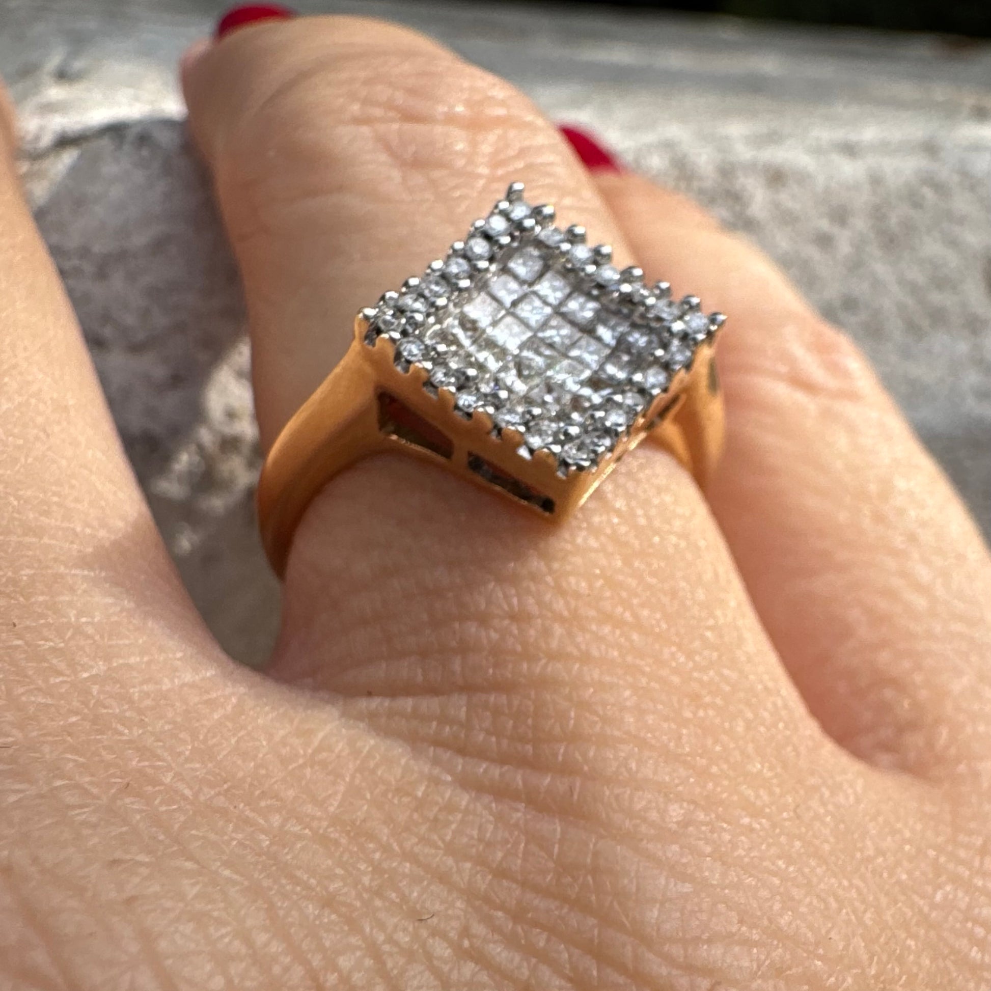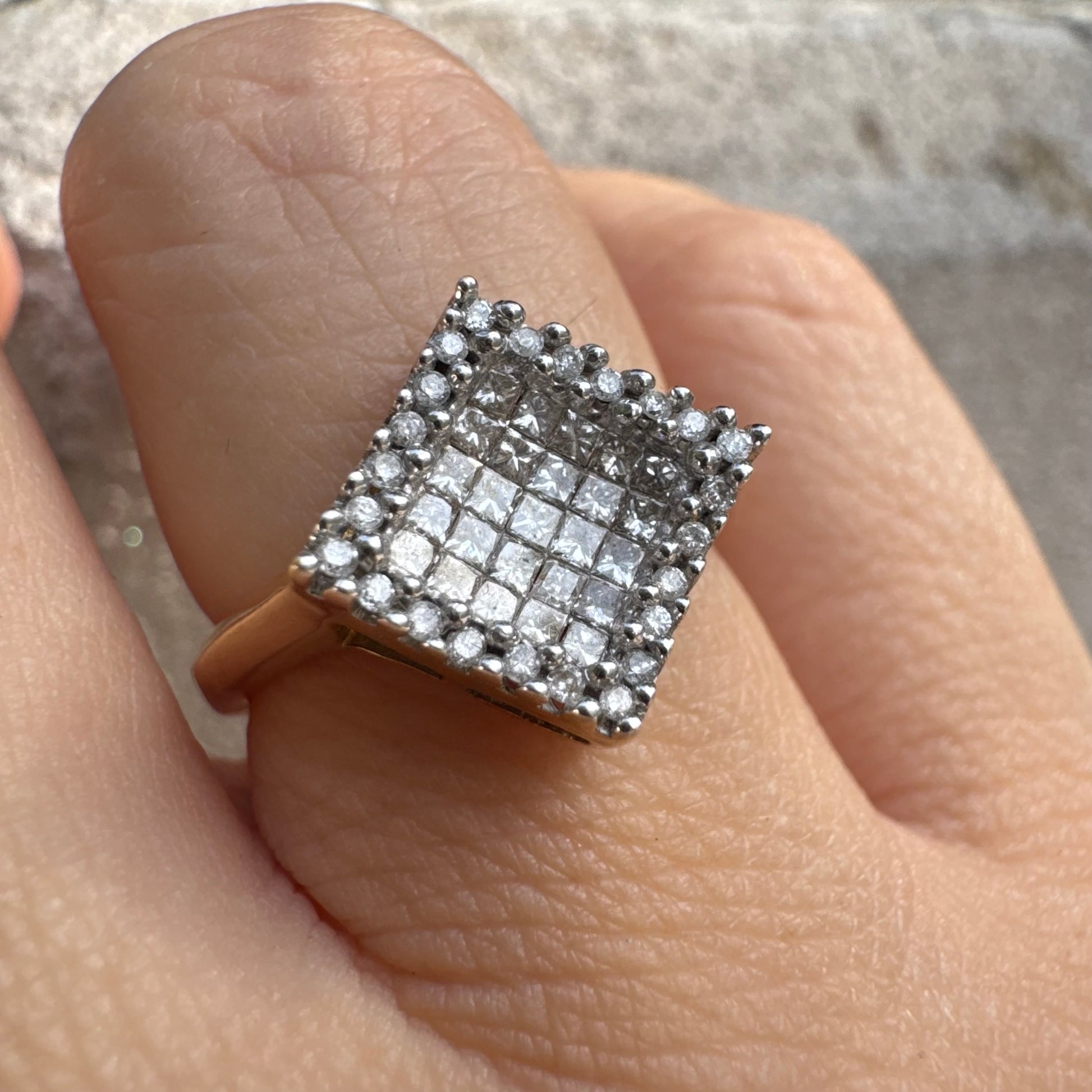 טבעת זהב 14 קראט בעיצוב ריבועי משובצת יהלומים בחיתוך פרינסס ומוקפת מסגרת יהלומים עגולים.