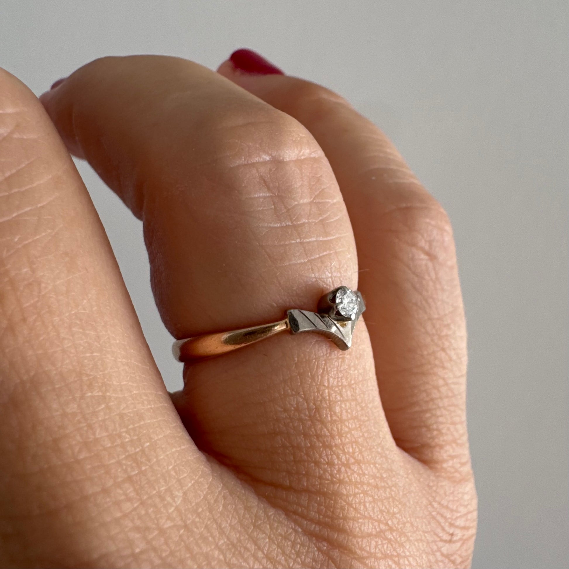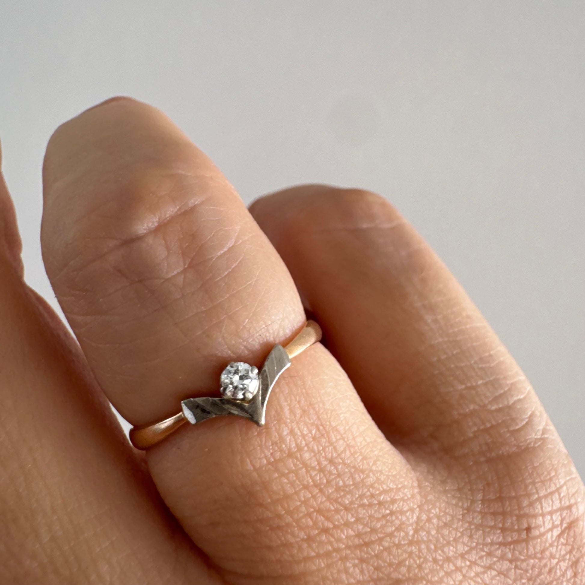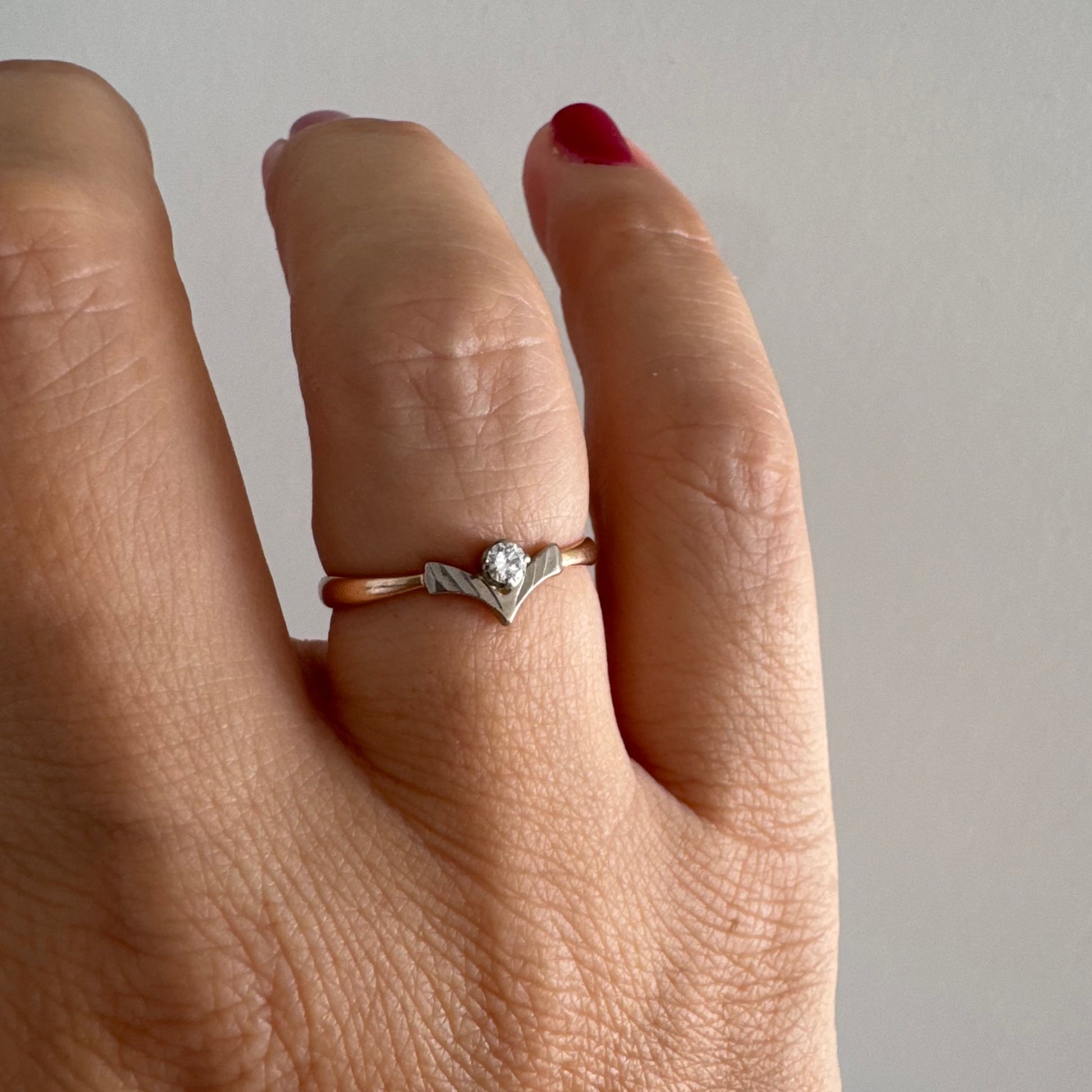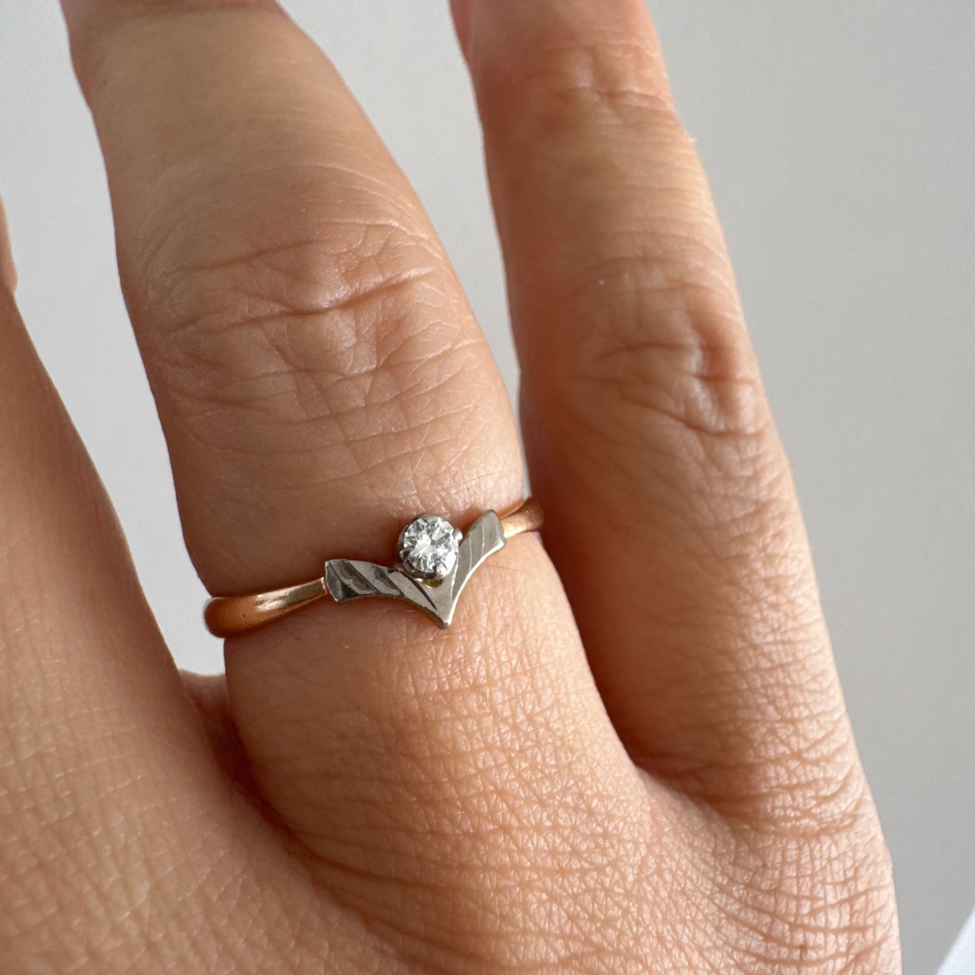 טבעת זהב 14 קראט עם ראש בצורת V מזהב לבן המשובץ יהלום עגול אחד.
