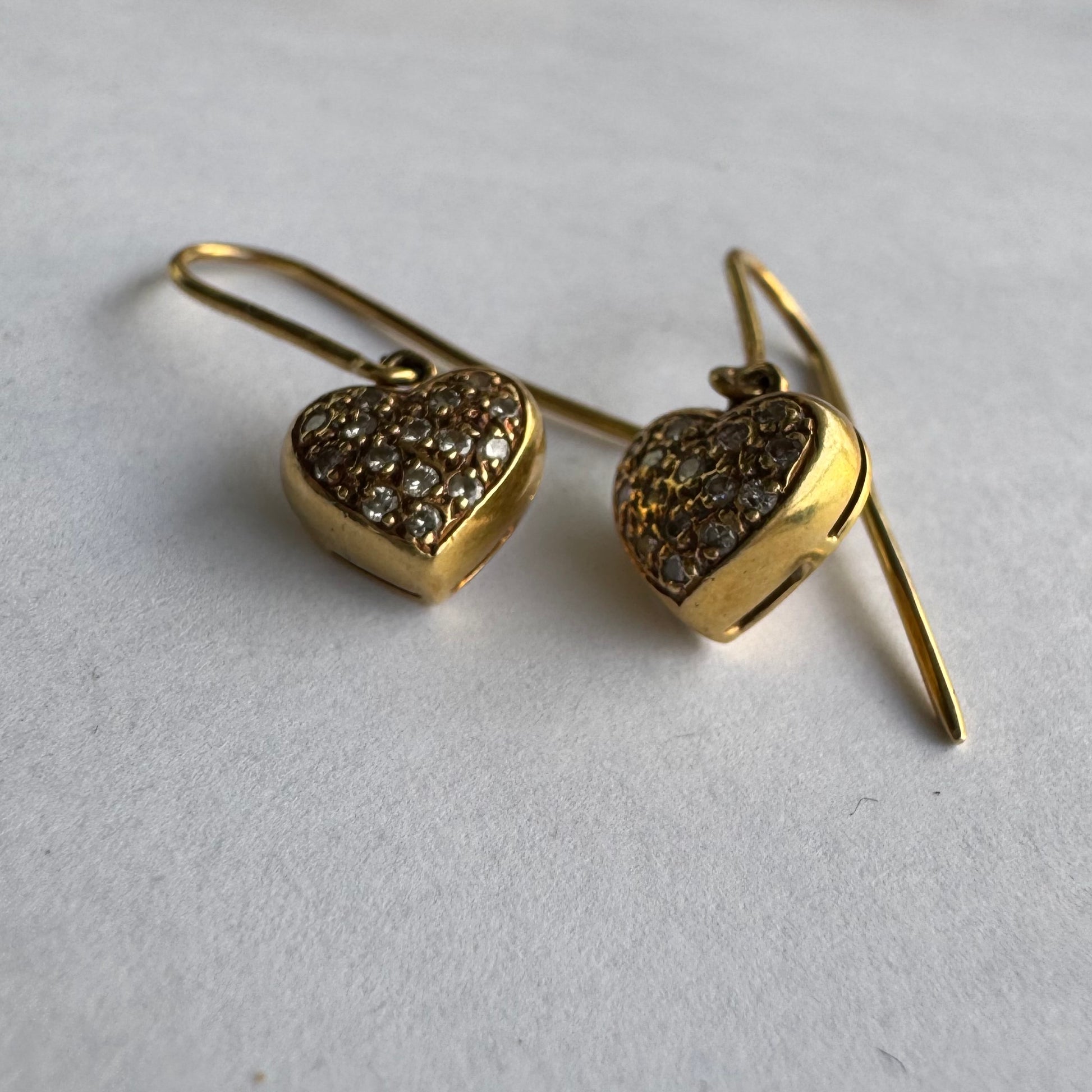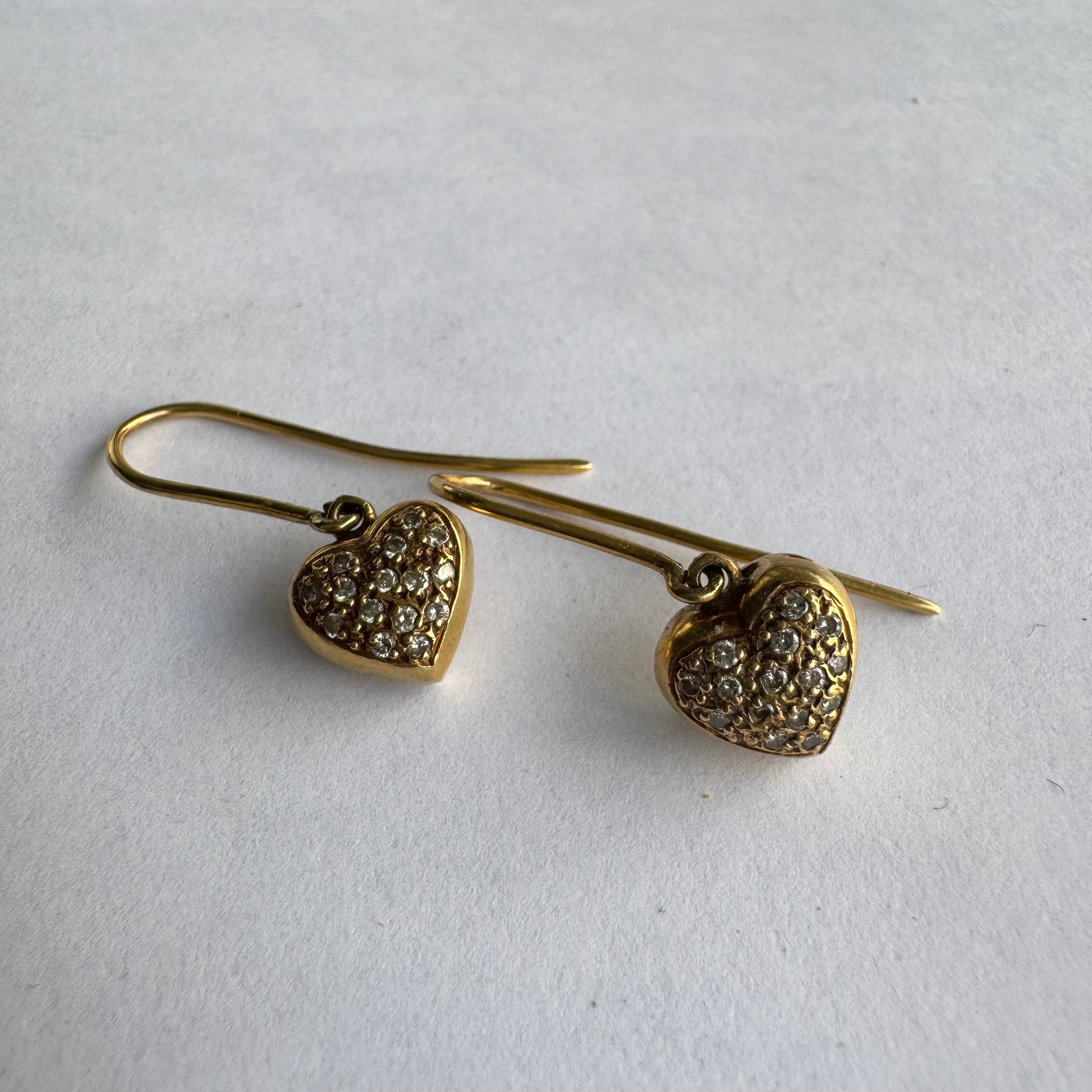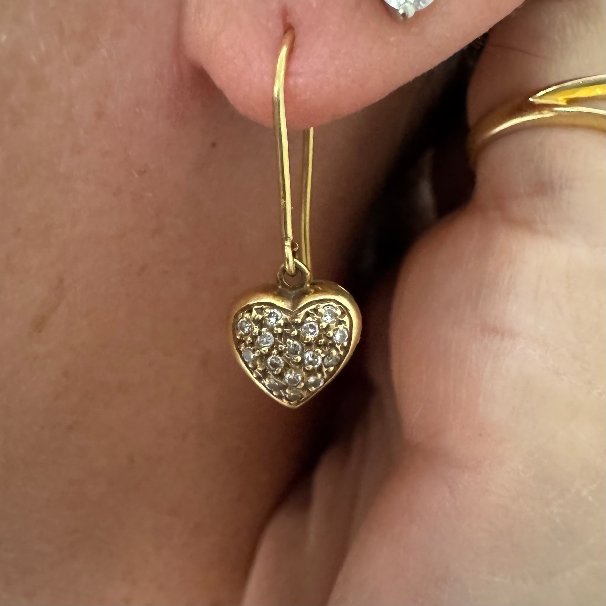 עגילי זהב צהוב 18 קראט תלויים בצורת לב, משובצים יהלומים קטנים המוסיפים ברק עדין ונוכחות אלגנטית.