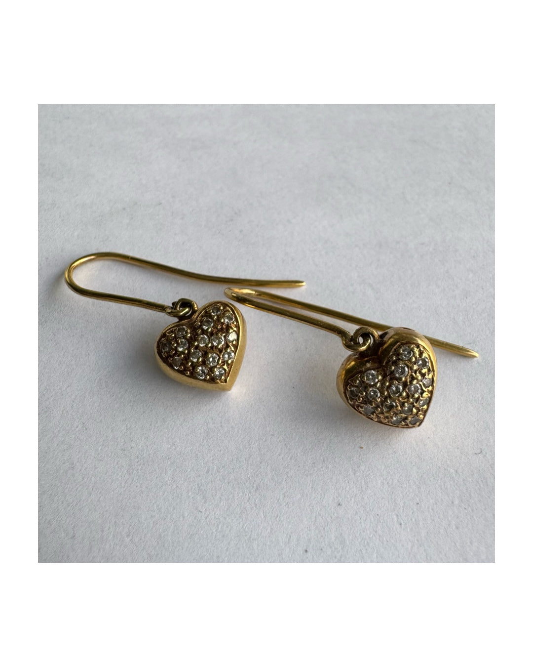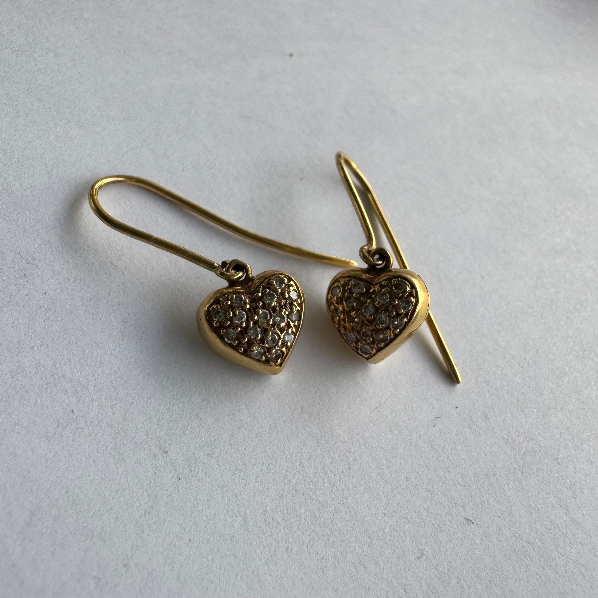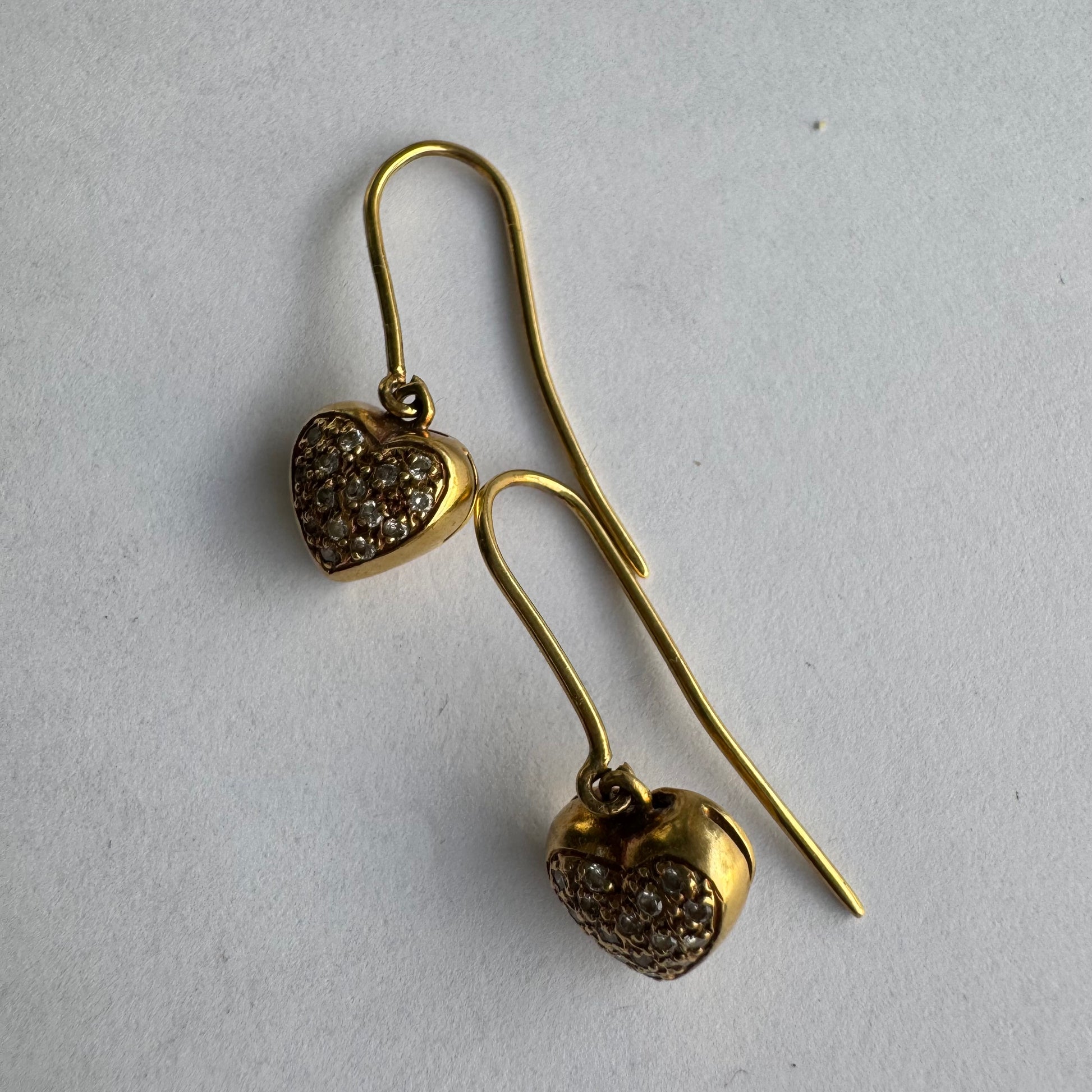 עגילי זהב צהוב 18 קראט תלויים בצורת לב, משובצים יהלומים קטנים המוסיפים ברק עדין ונוכחות אלגנטית.
