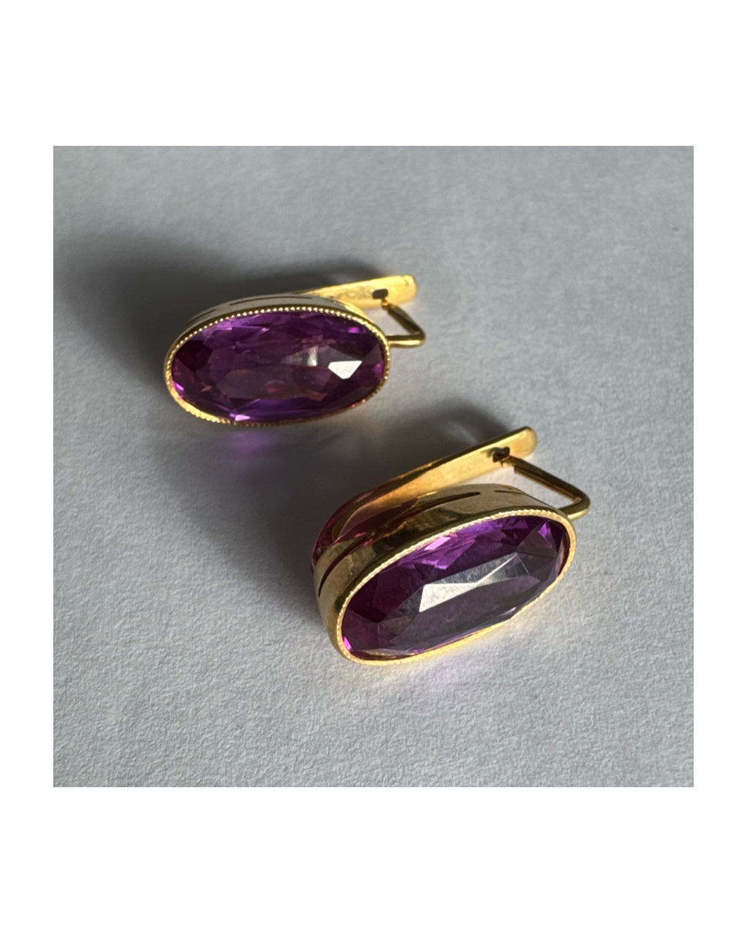 עגילי זהב צהוב 18 קראט, תלויים קצרים, משובצים באבני אמטיסט סגולות בחיתוך אובלי עמוק.