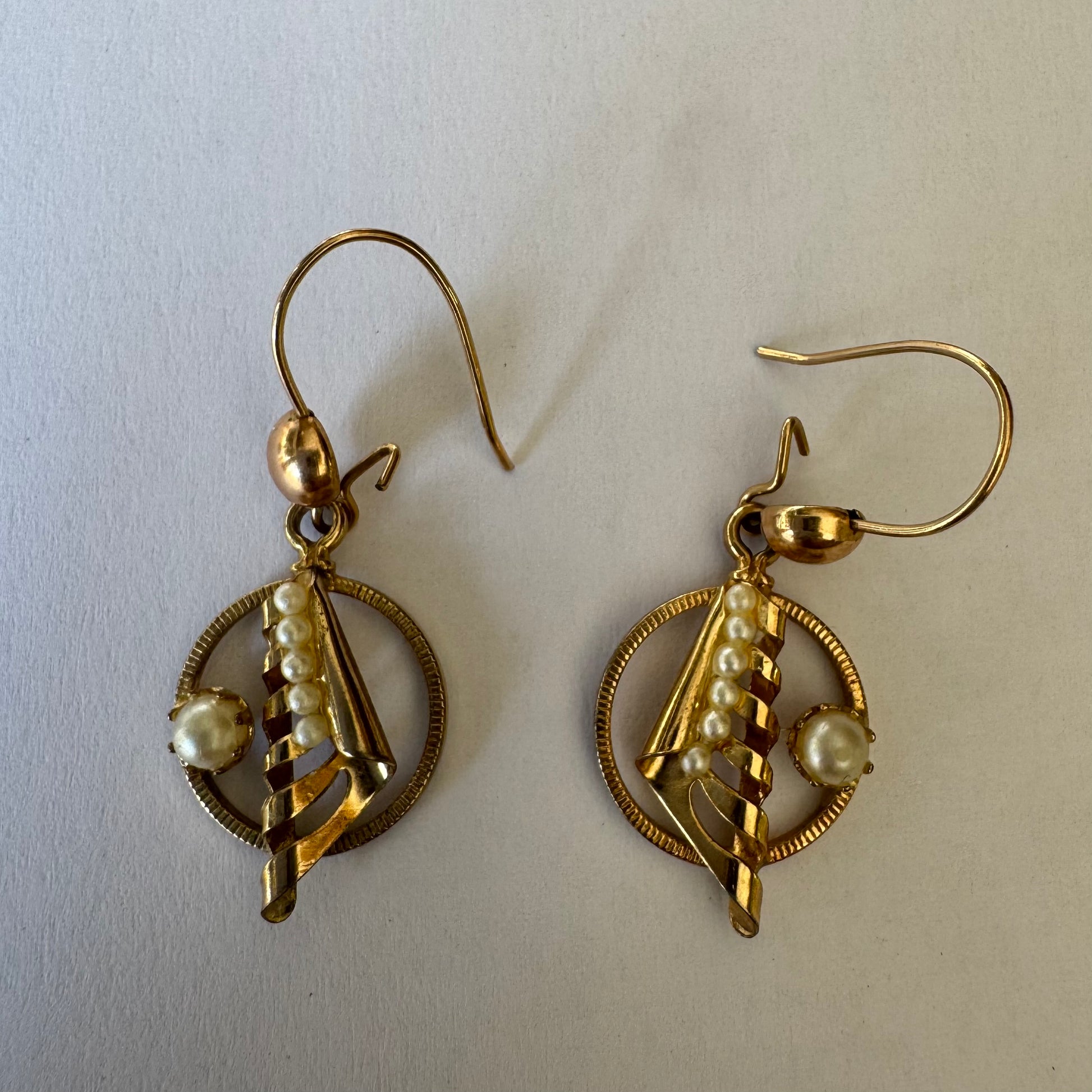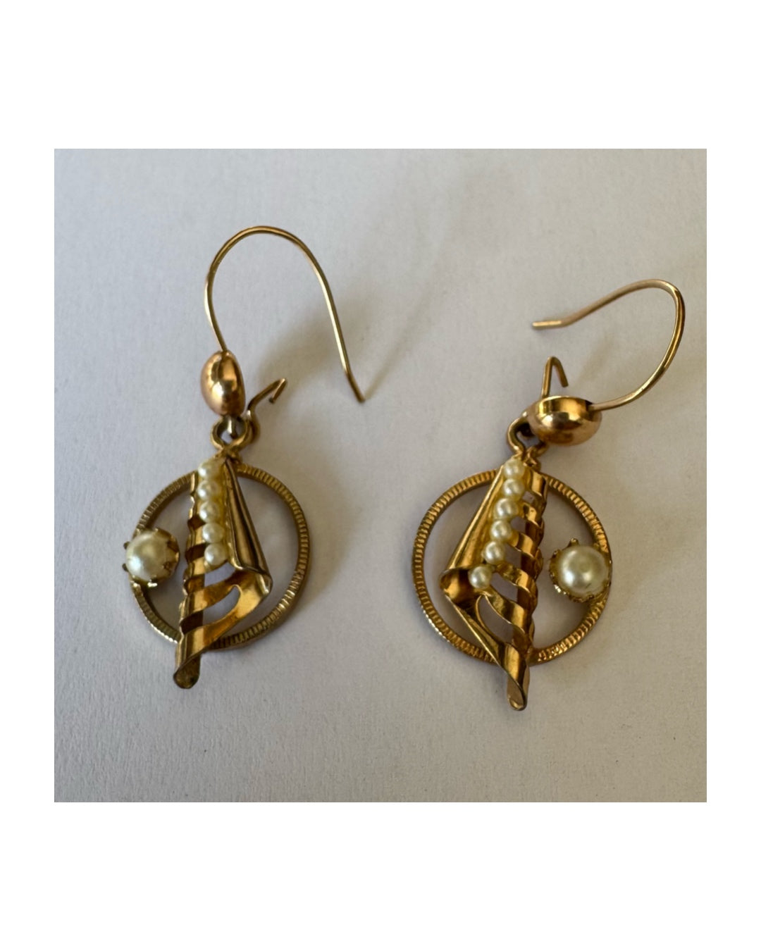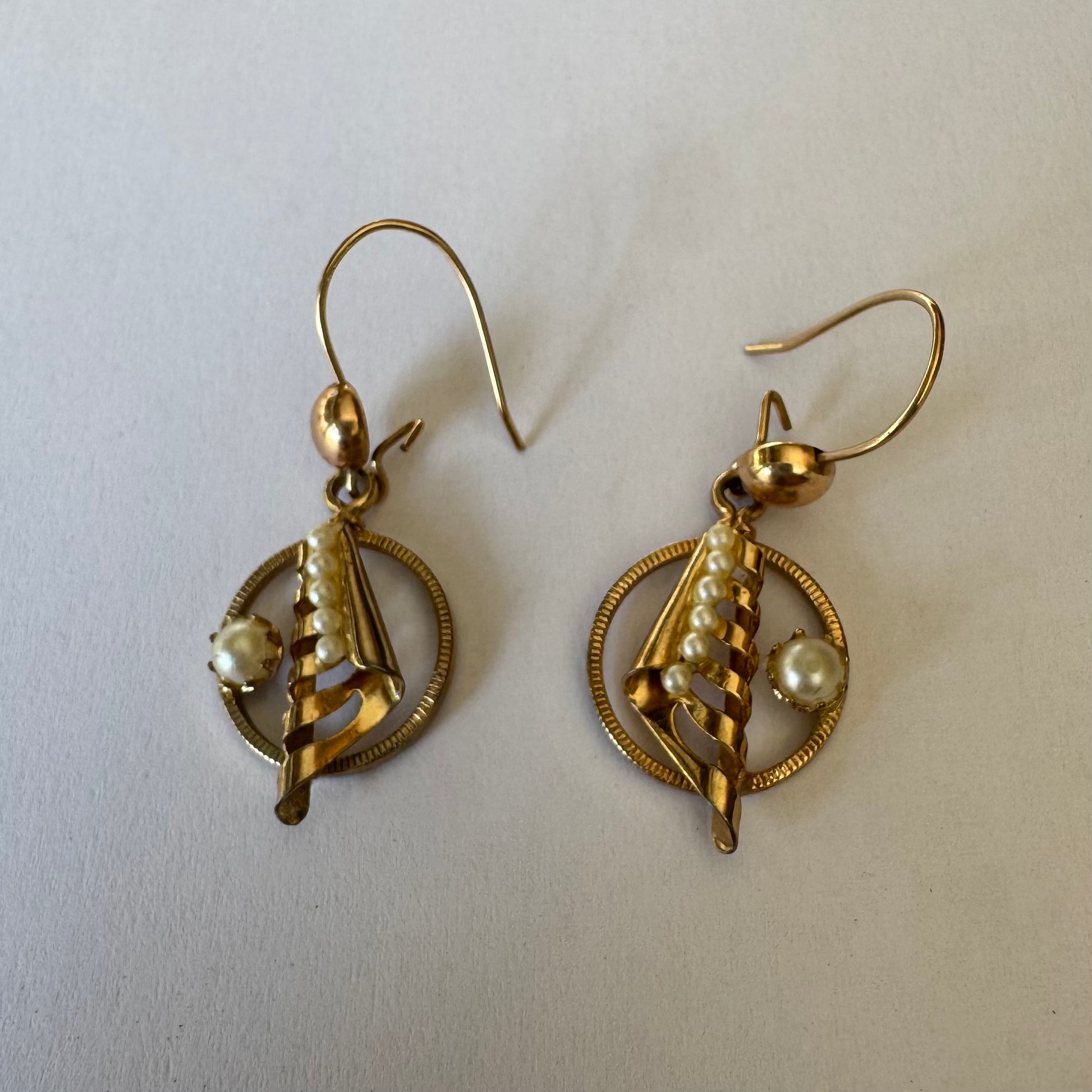 עגילי זהב 10 קראט, בעיצוב עדין עם אלמנט ספירלי ושילוב פנינים קטנות בגוון לבן-קרם.