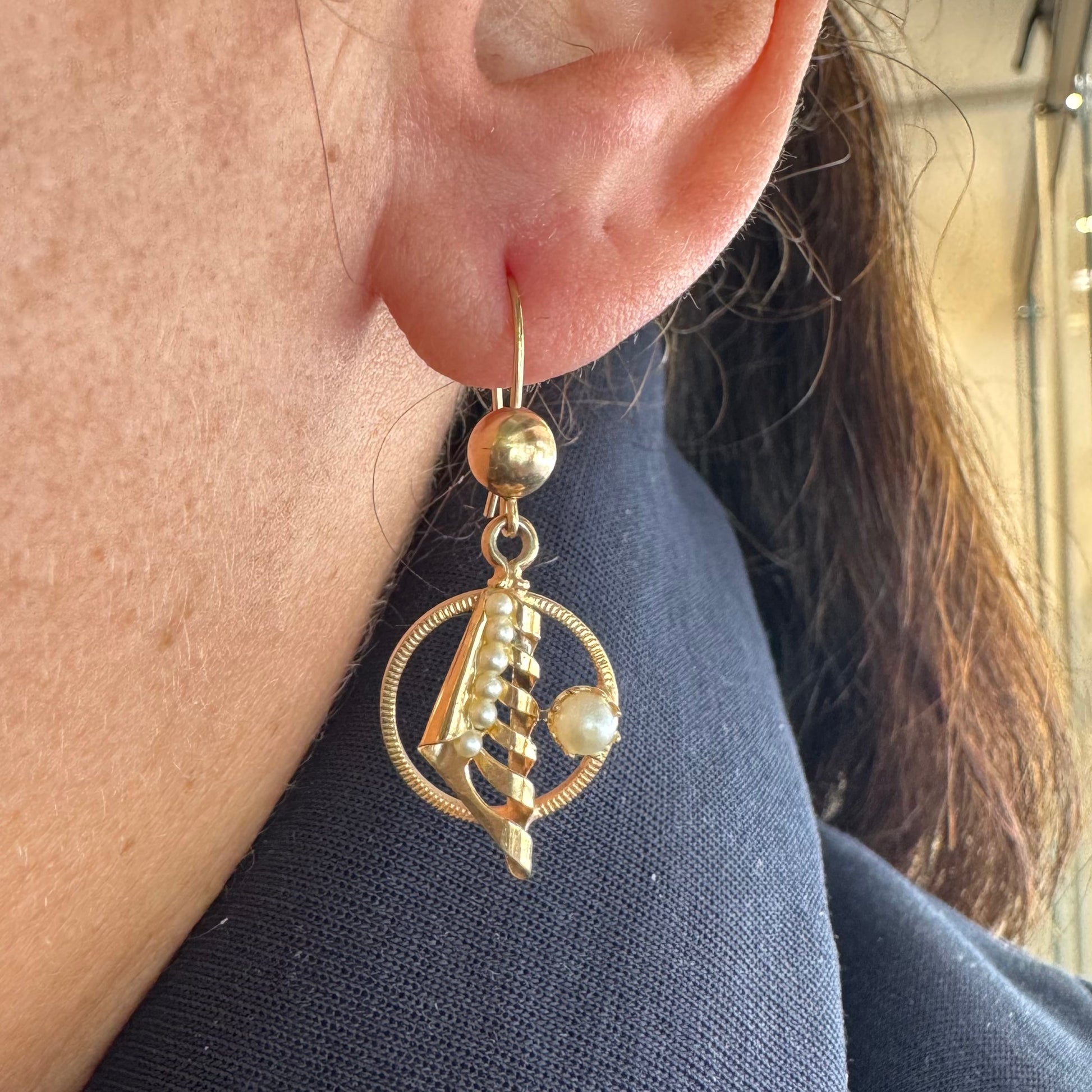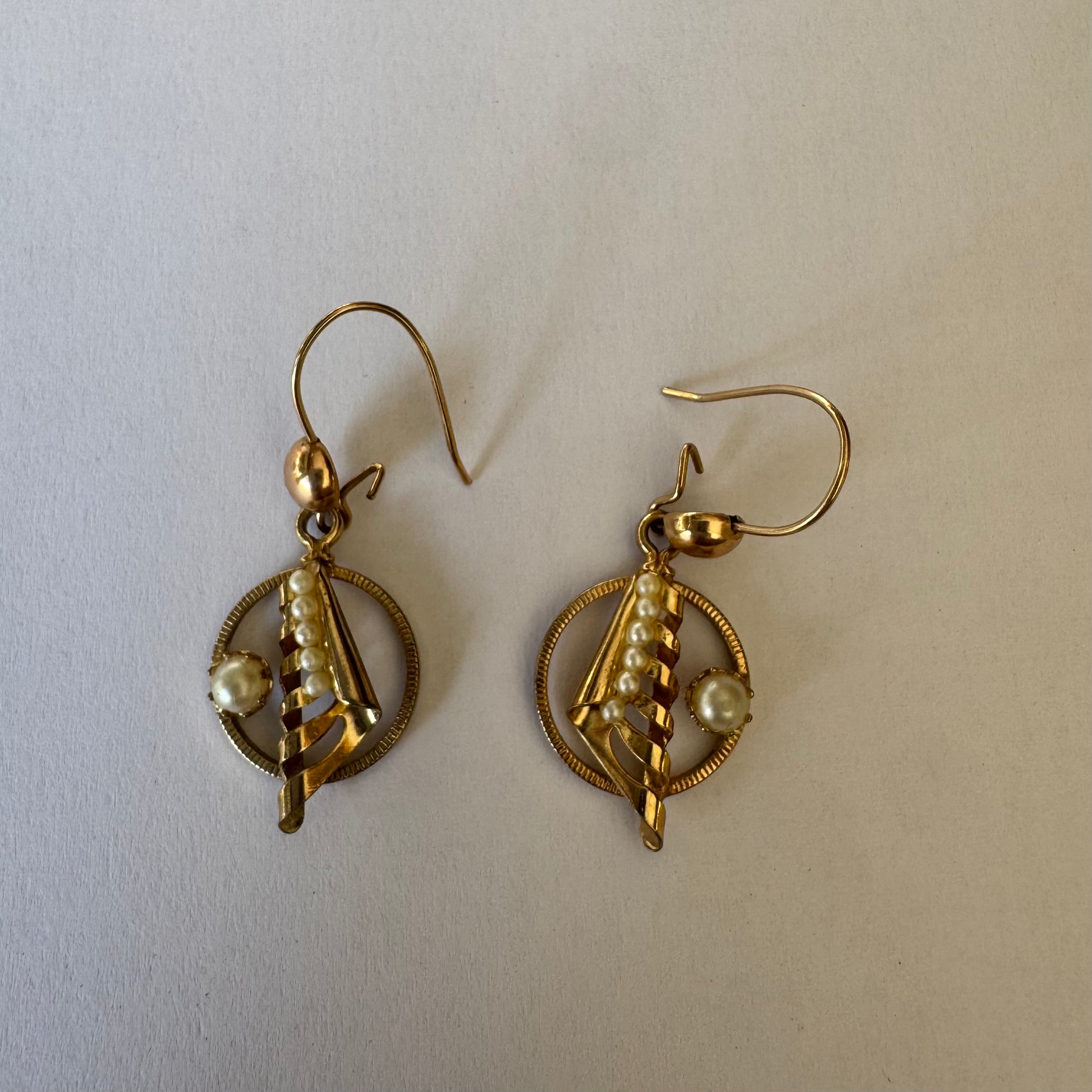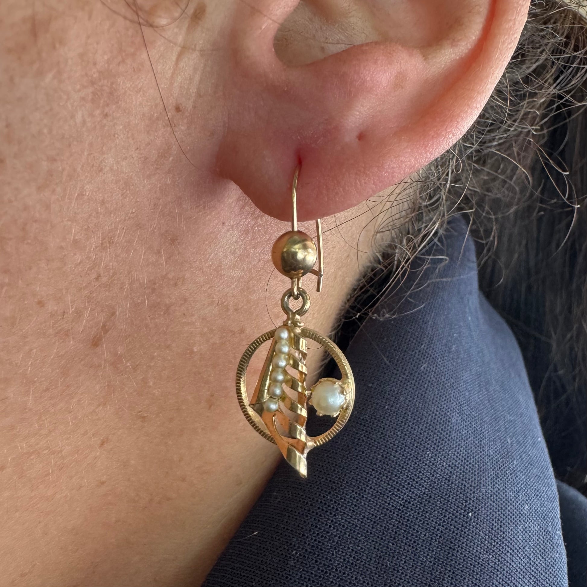 עגילי זהב 10 קראט, בעיצוב עדין עם אלמנט ספירלי ושילוב פנינים קטנות בגוון לבן-קרם.