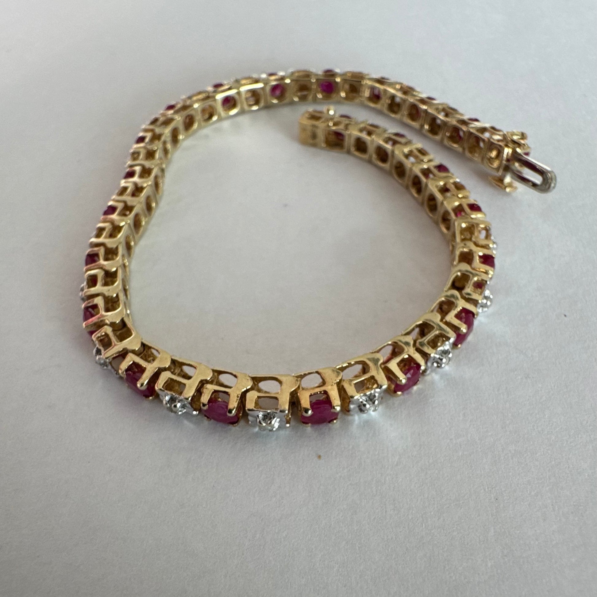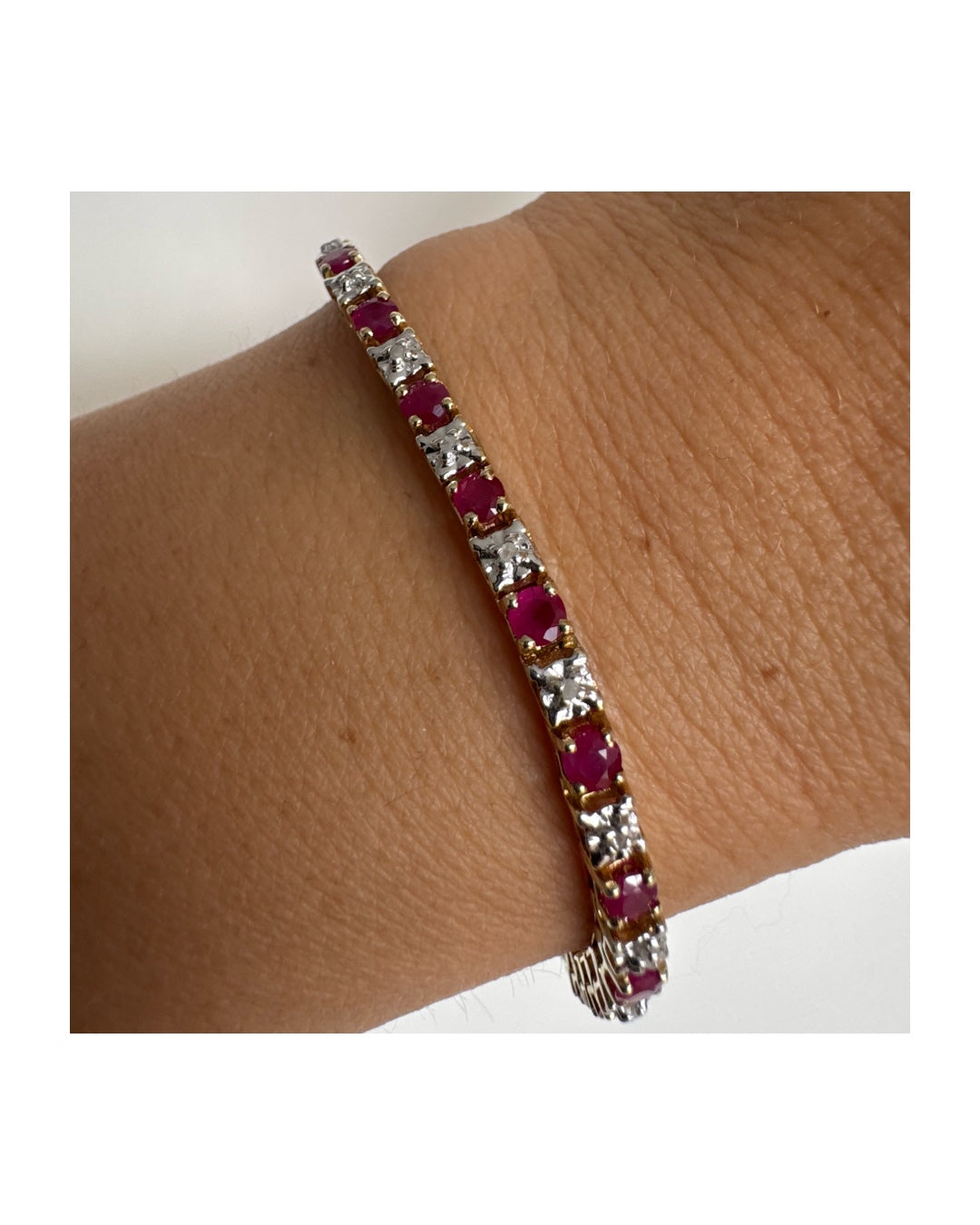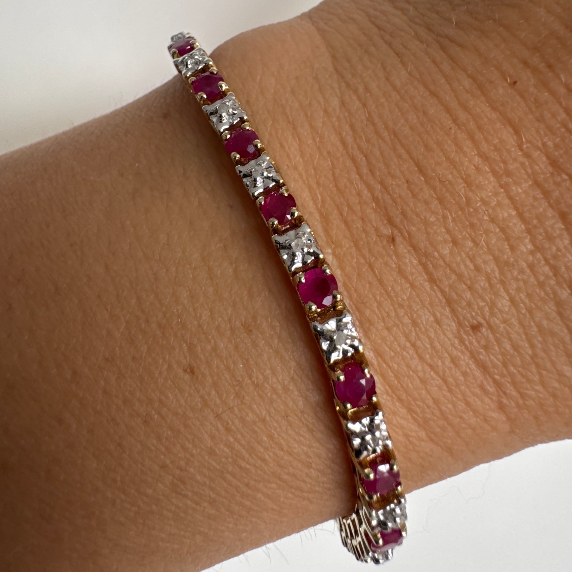 צמיד זהב צהוב 10 קראט משובץ אבני רובי בגוון אדום עמוק וביניהן יהלומים לבנים מנצנצים.