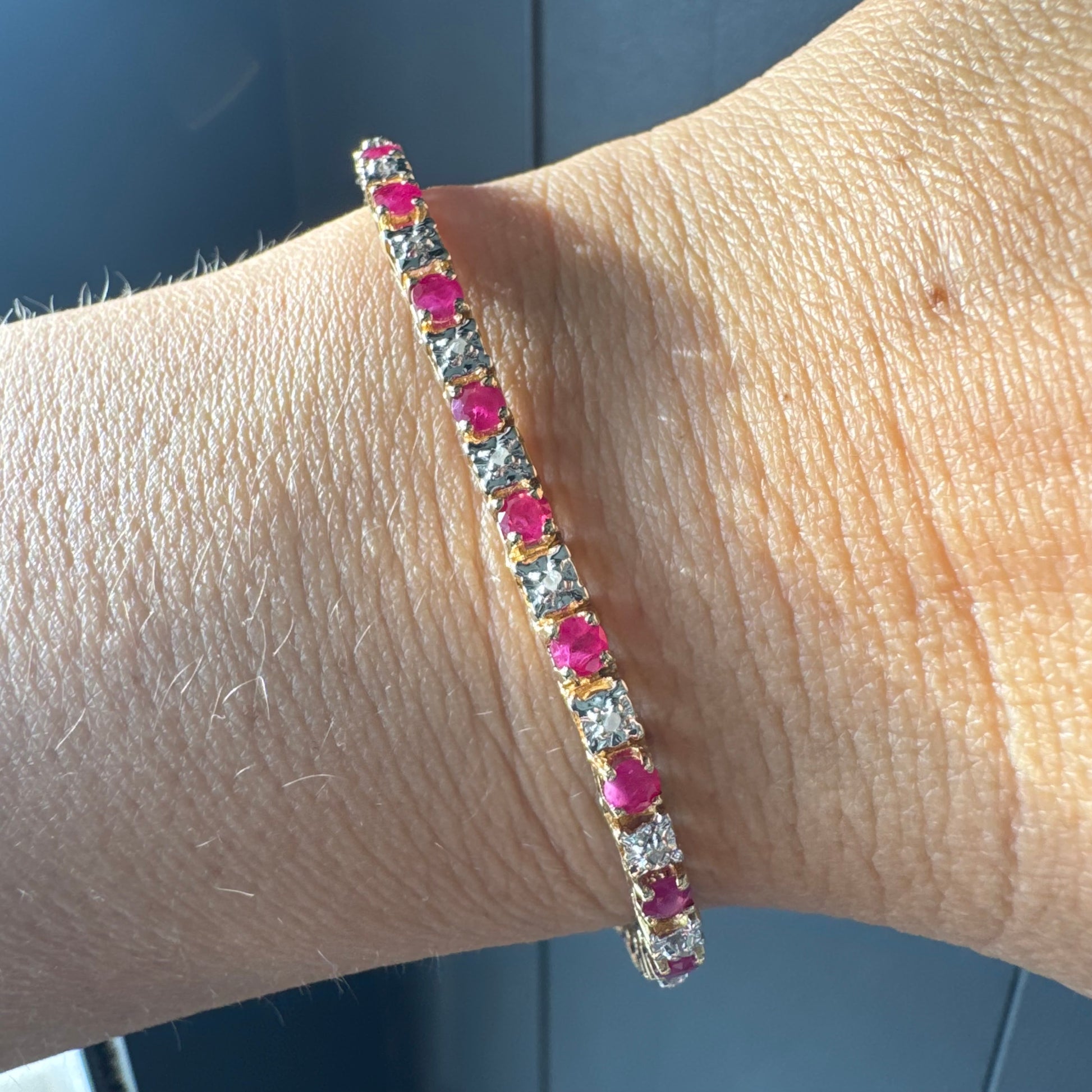 השיבוץ הקלאסי יוצר רצף אלגנטי ומדויק לאורך היד, עם ניגוד עשיר בין האדום החם לניצוץ הצלול של היהלומים.