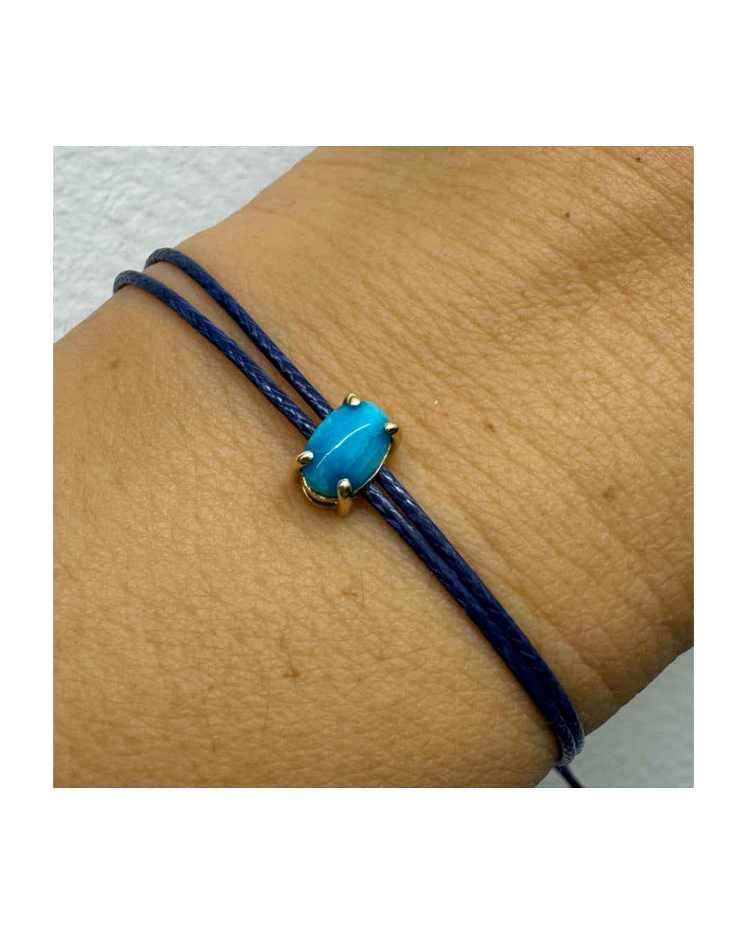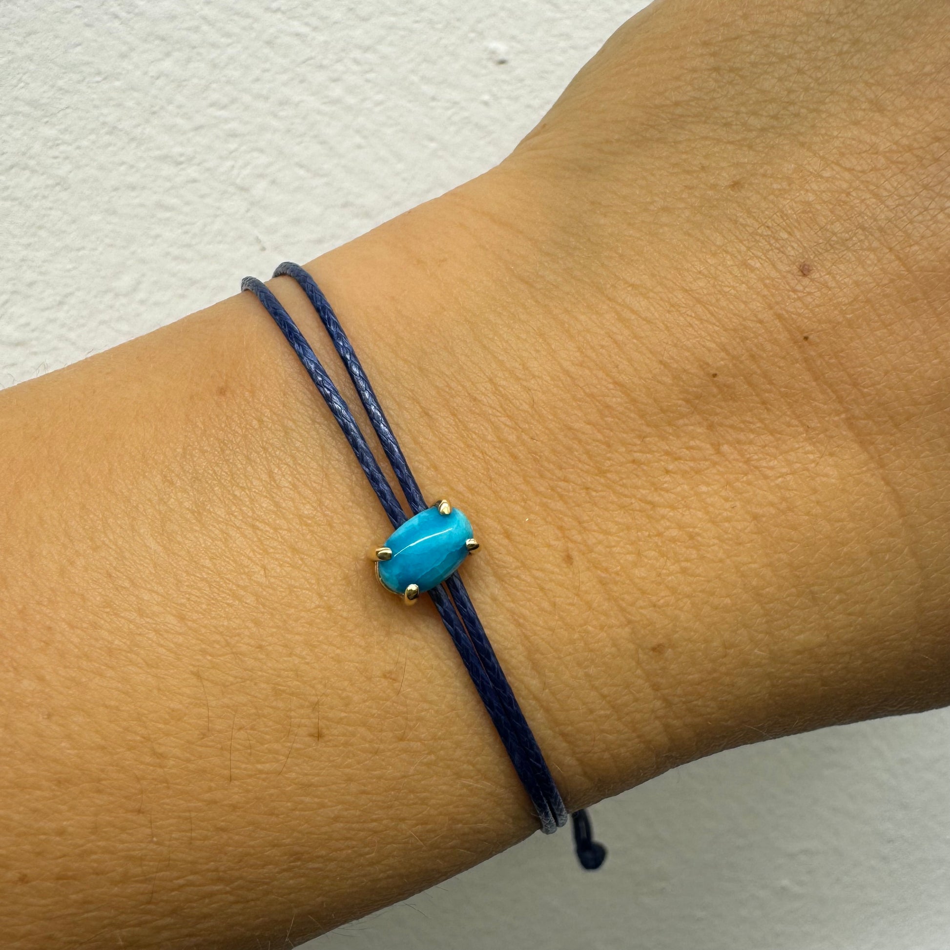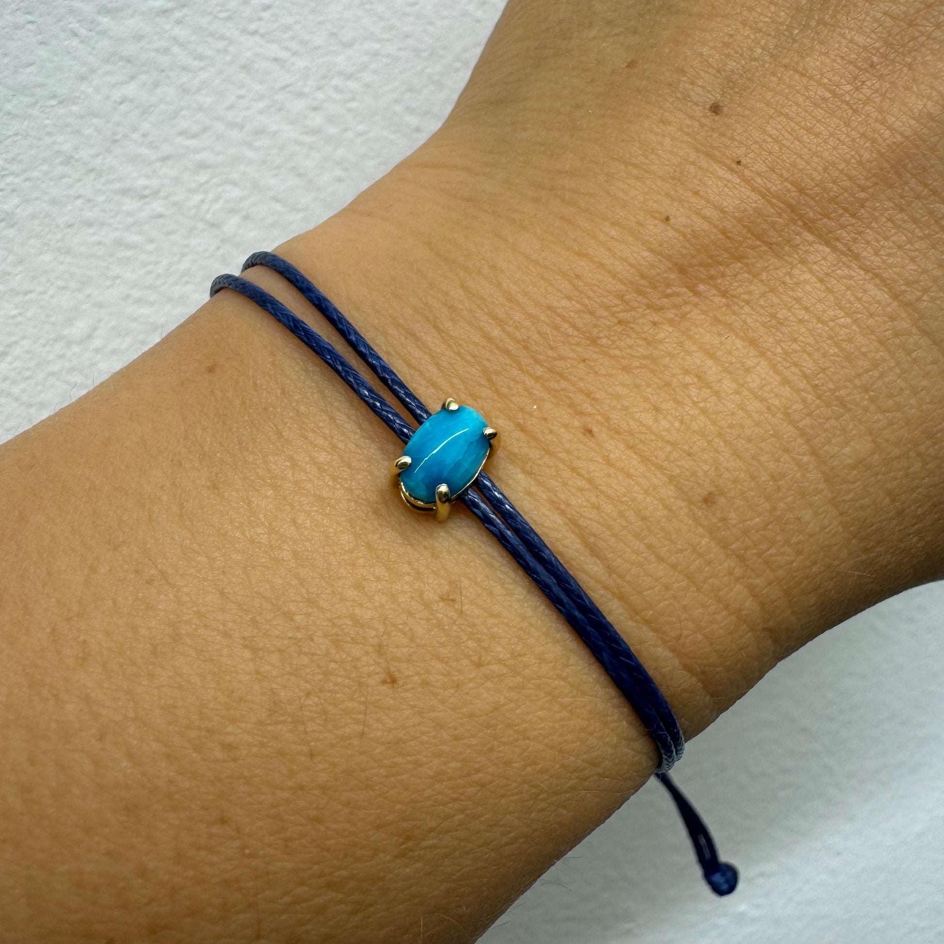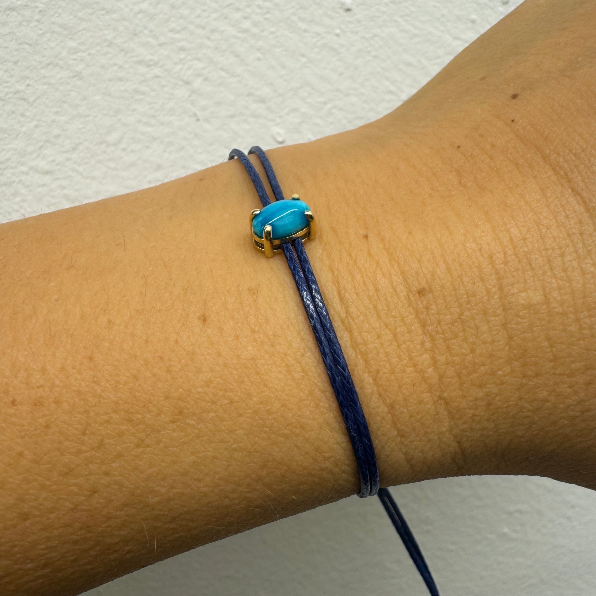 צמיד חוט כחול עדין עם אבן טורקיז טבעית בגוון כחול עמוק, משובצת במסגרת זהב.