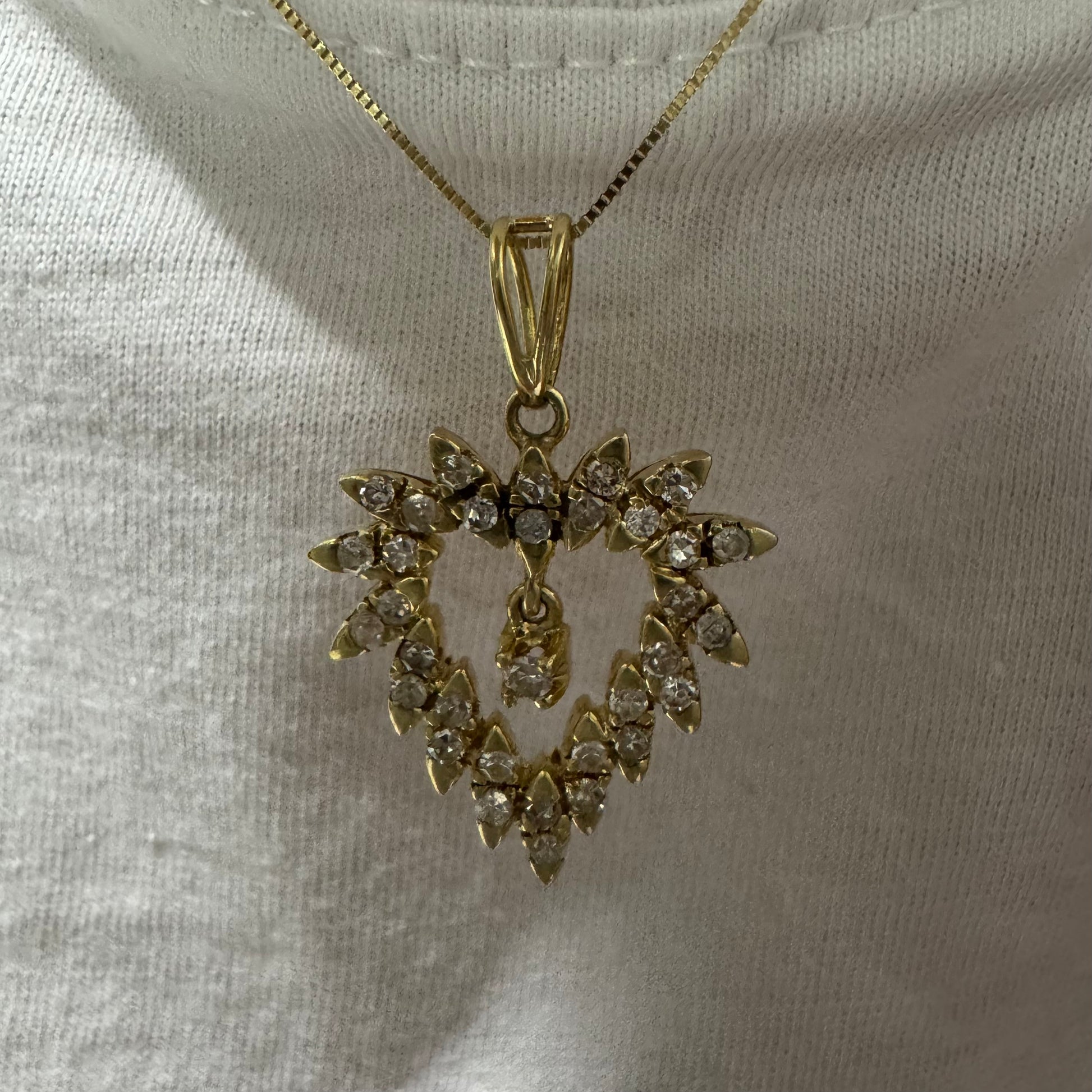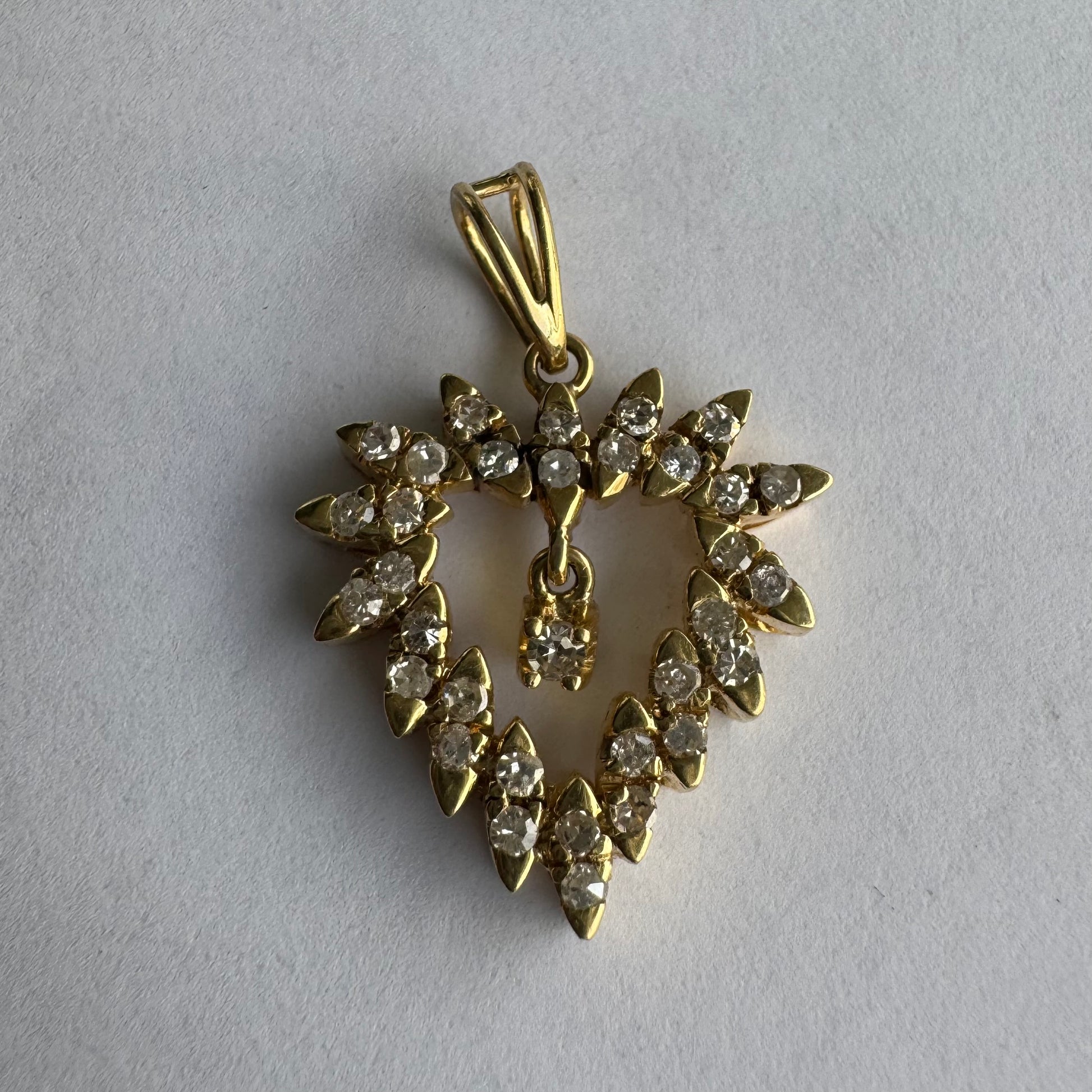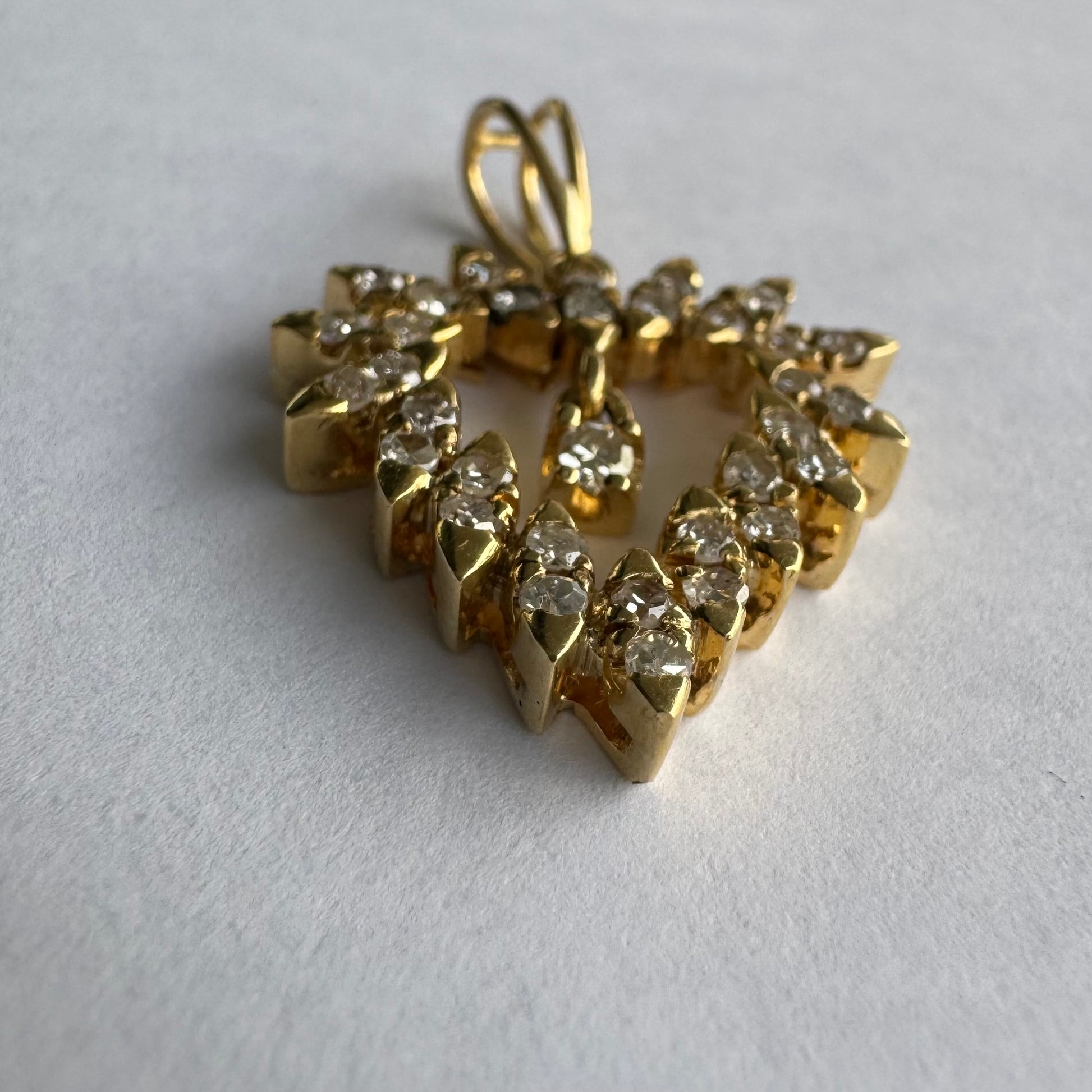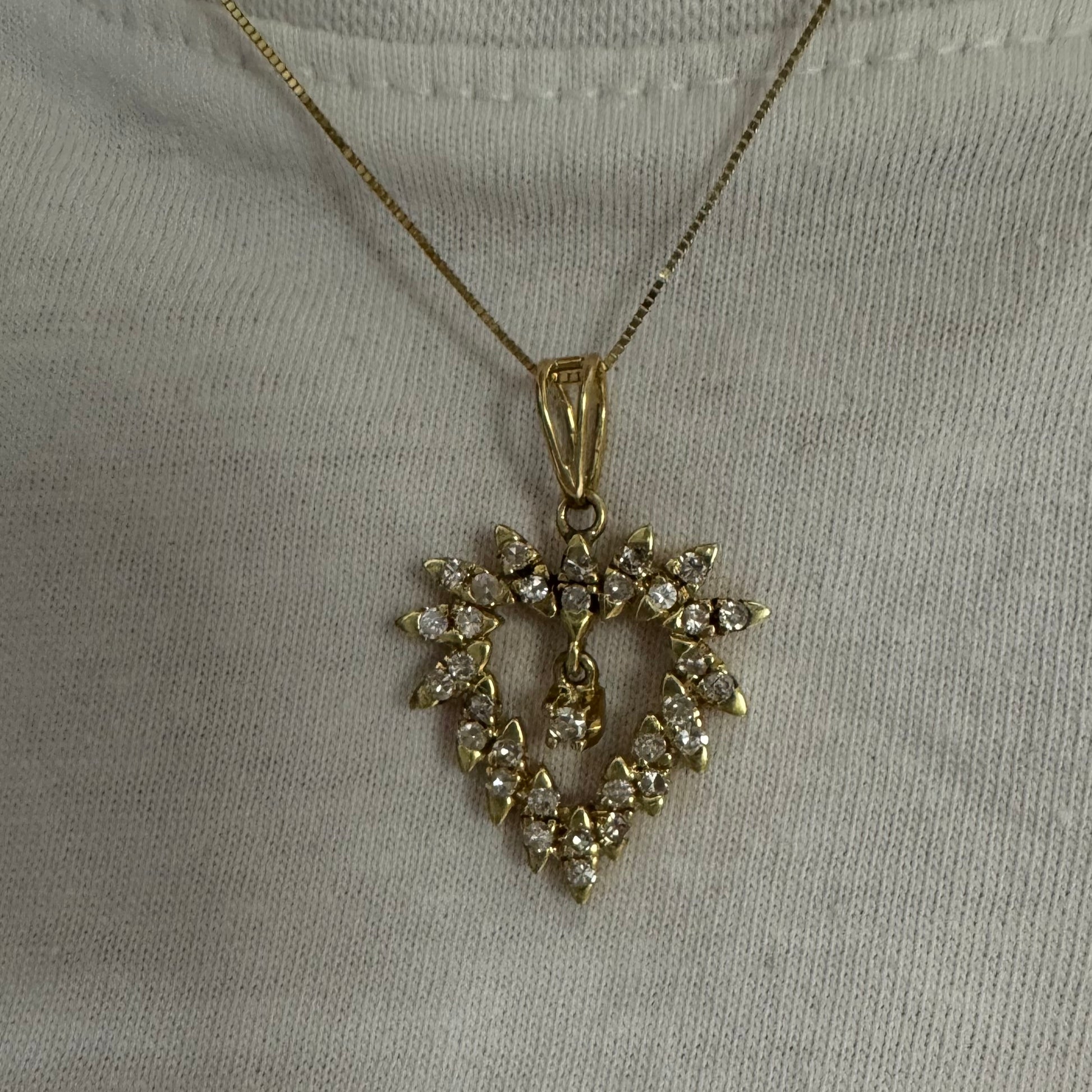 תליון זהב צהוב 14 קראט בצורת לב, משובץ יהלומים בסידור עדין היוצר מראה עשיר ומלא ברק.