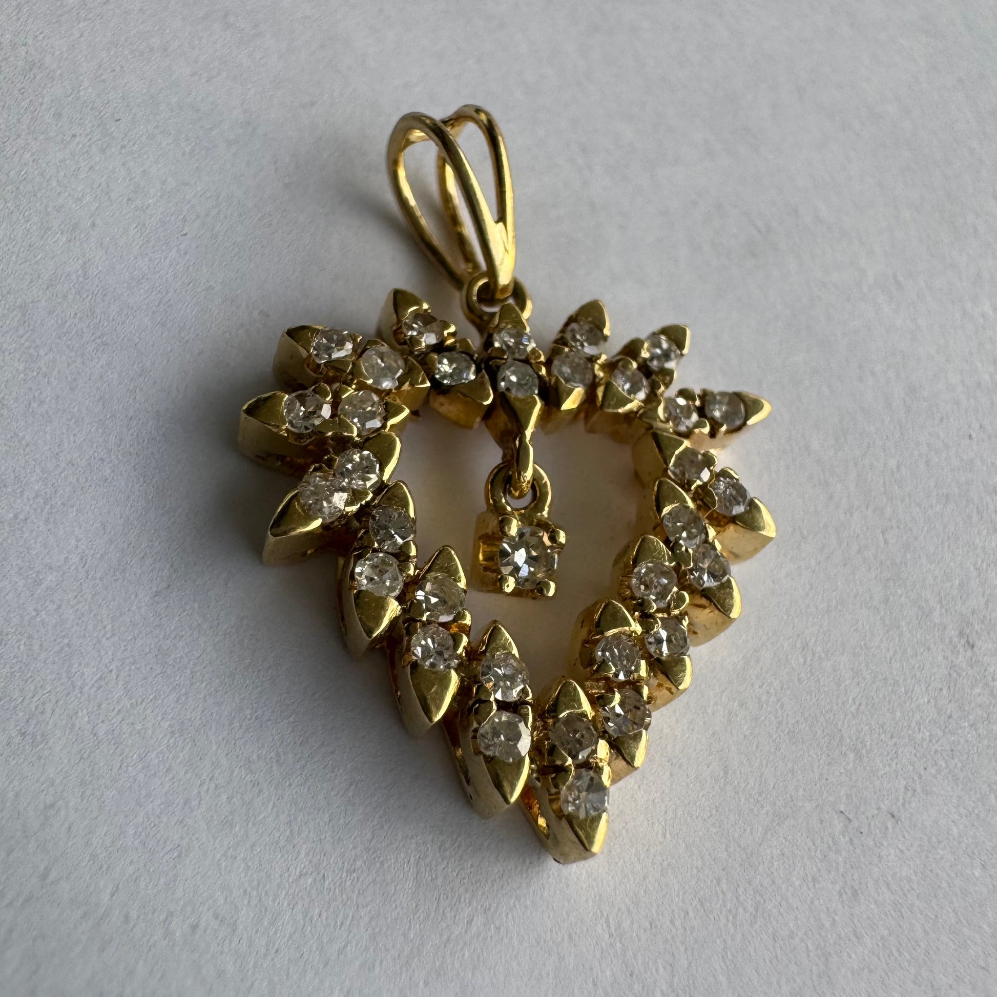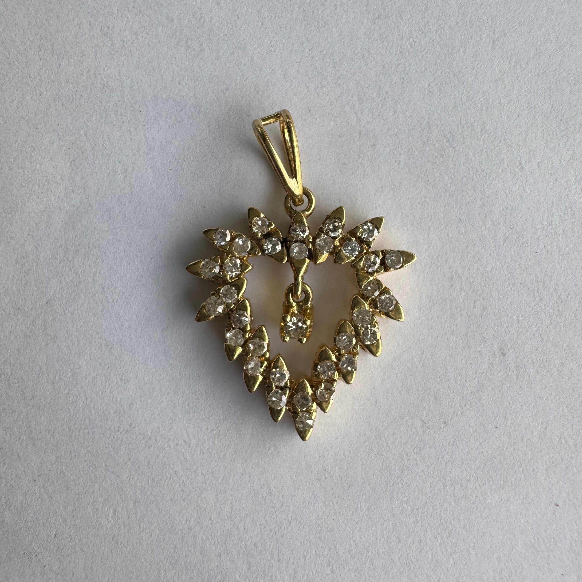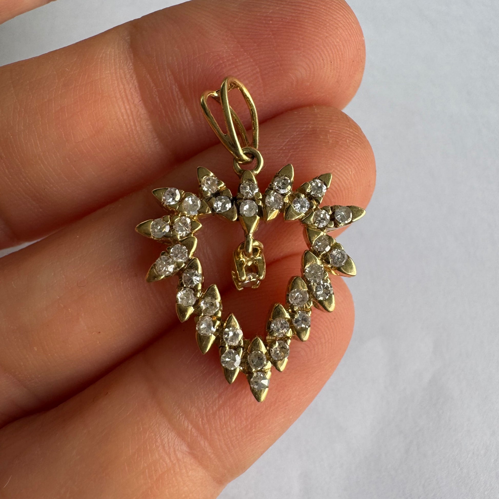 תליון זהב צהוב 14 קראט בצורת לב, משובץ יהלומים בסידור עדין היוצר מראה עשיר ומלא ברק.