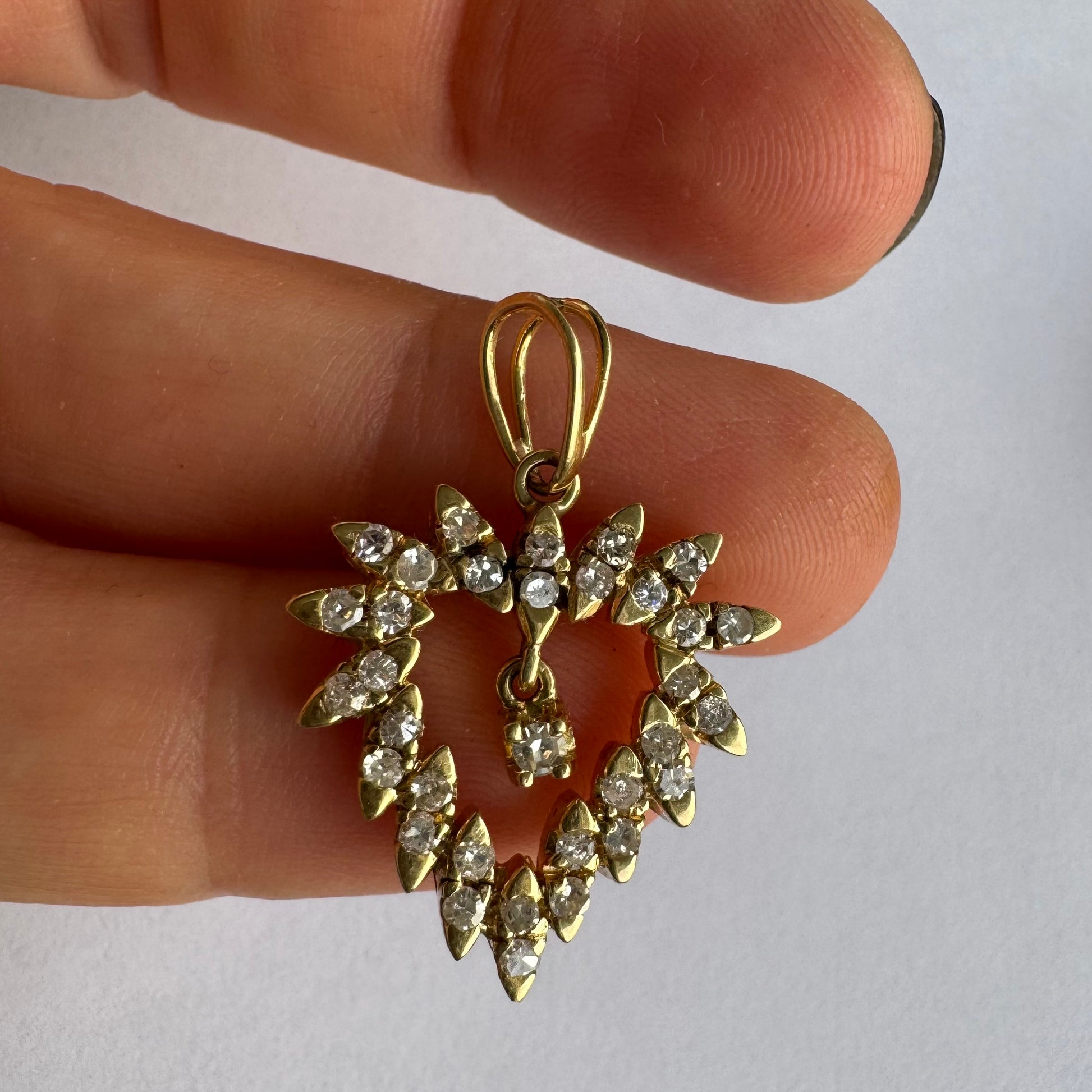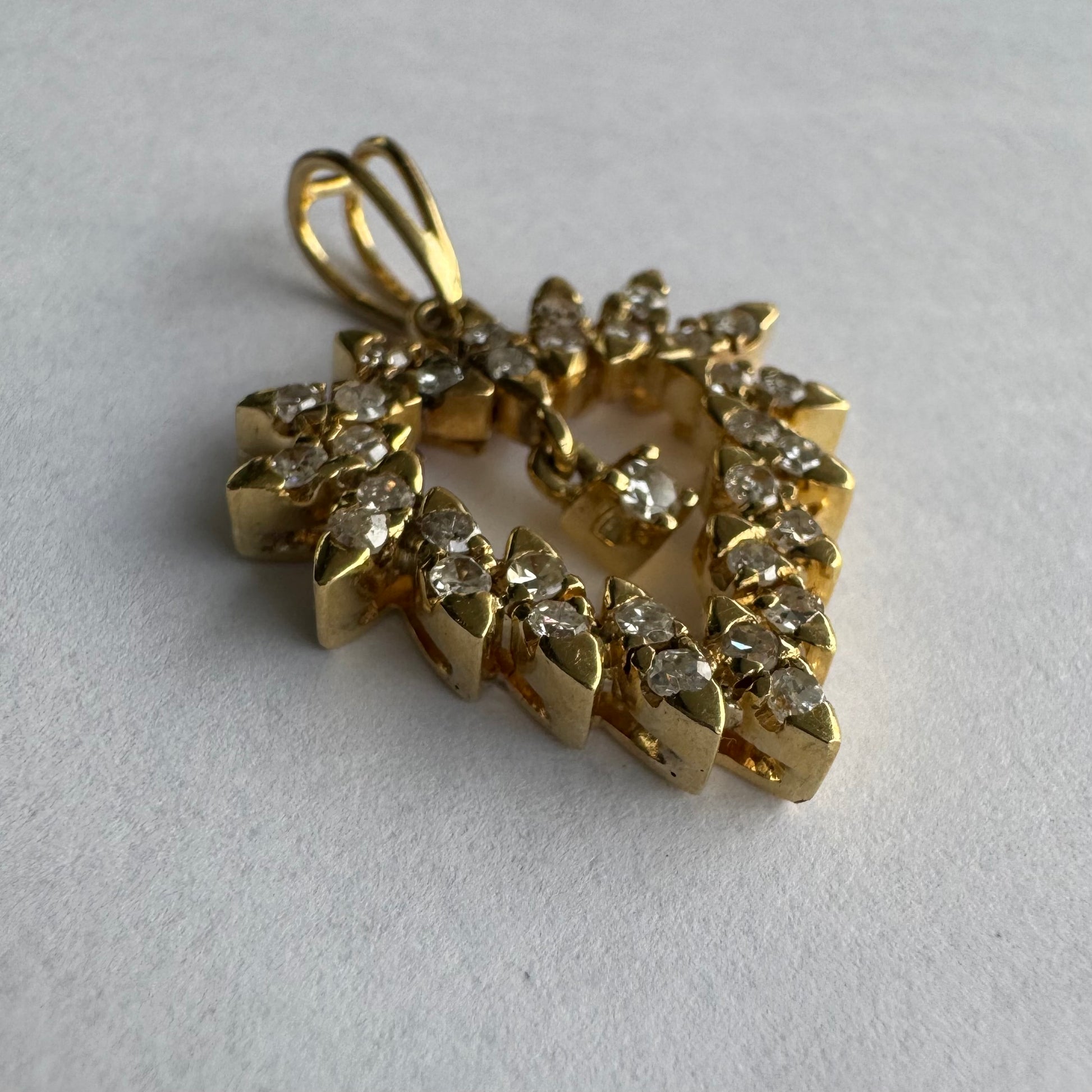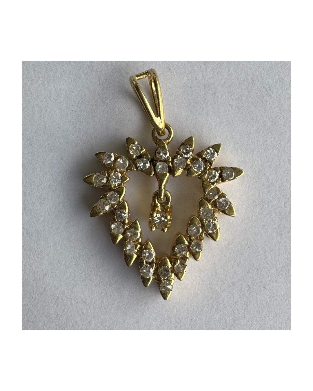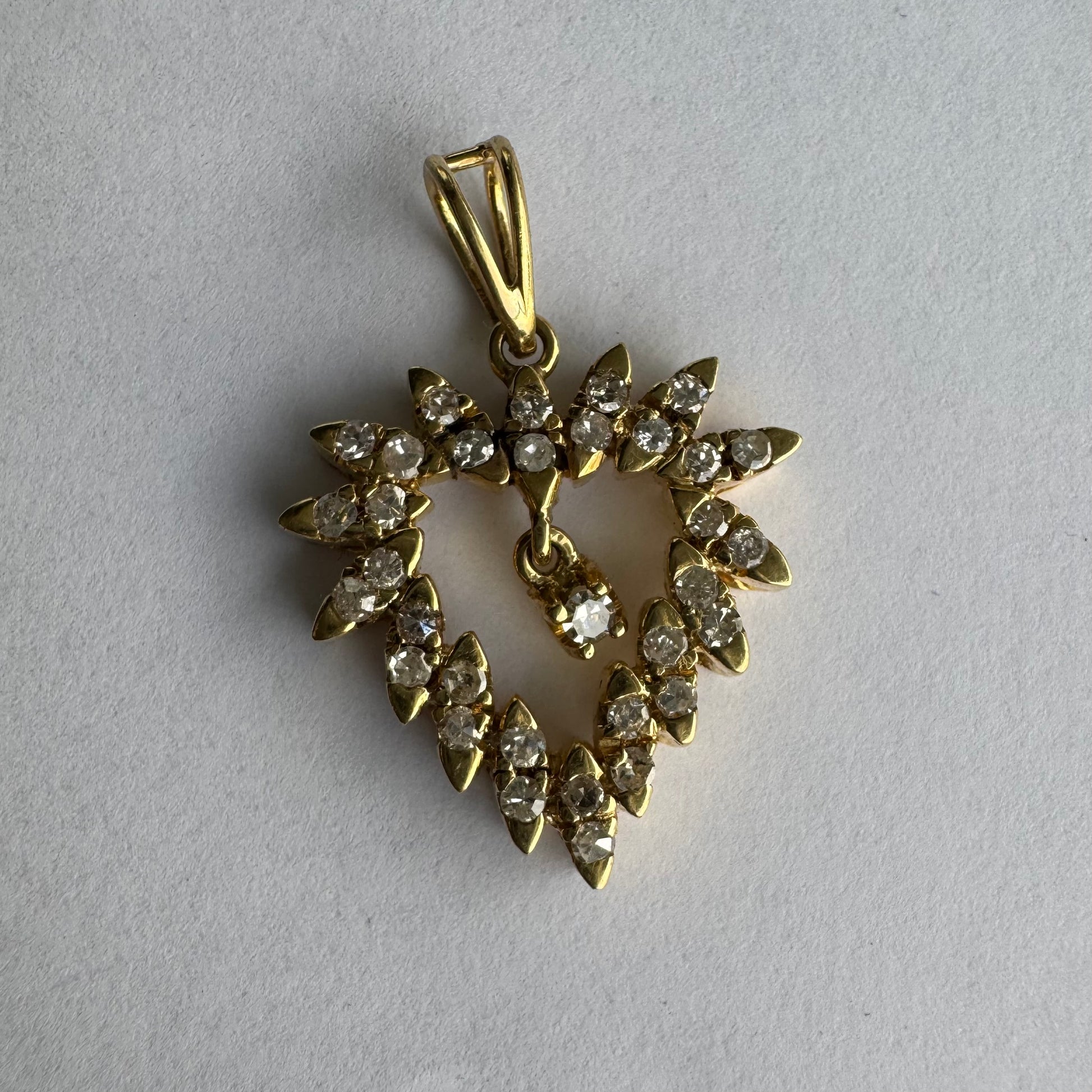 תליון זהב צהוב 14 קראט בצורת לב, משובץ יהלומים בסידור עדין היוצר מראה עשיר ומלא ברק.