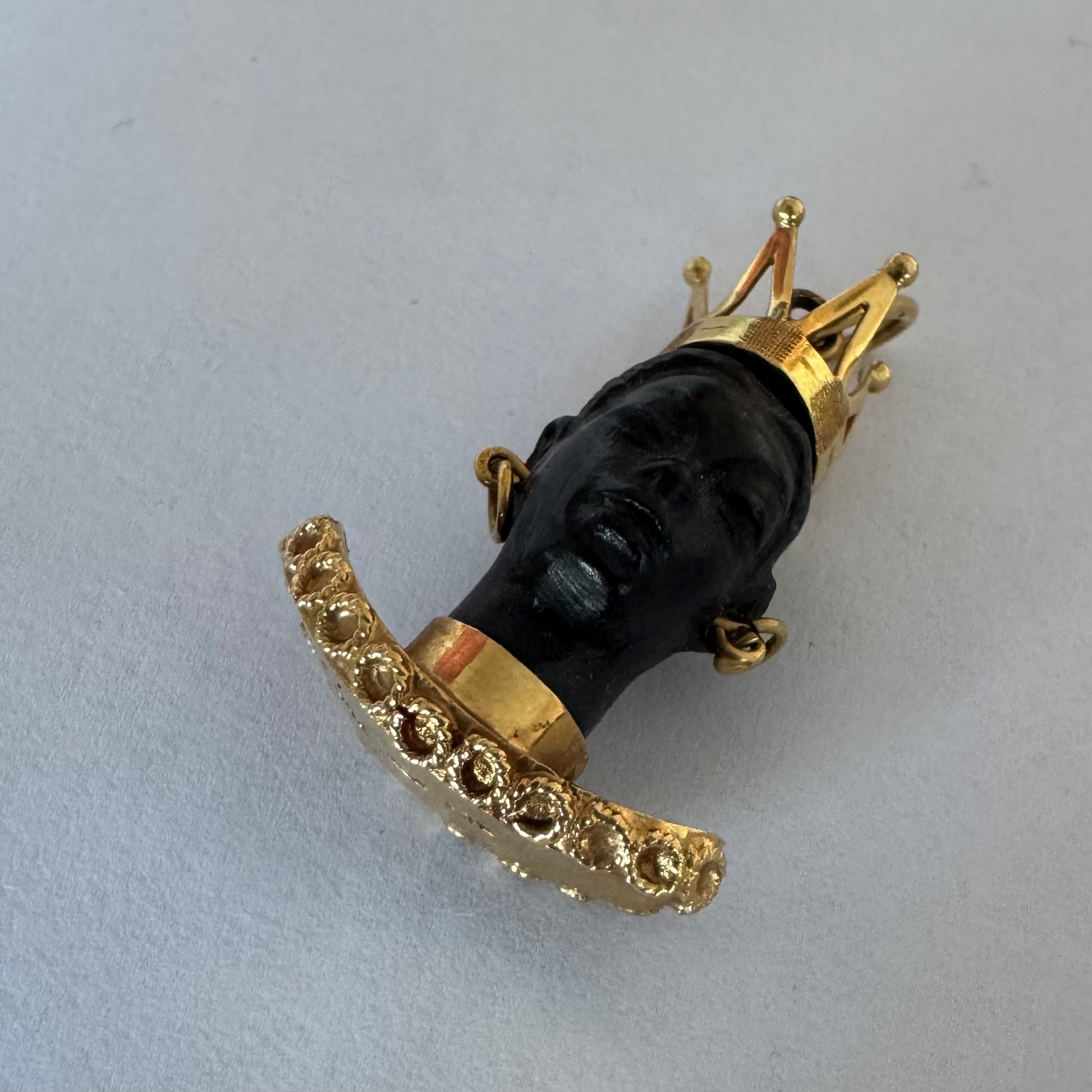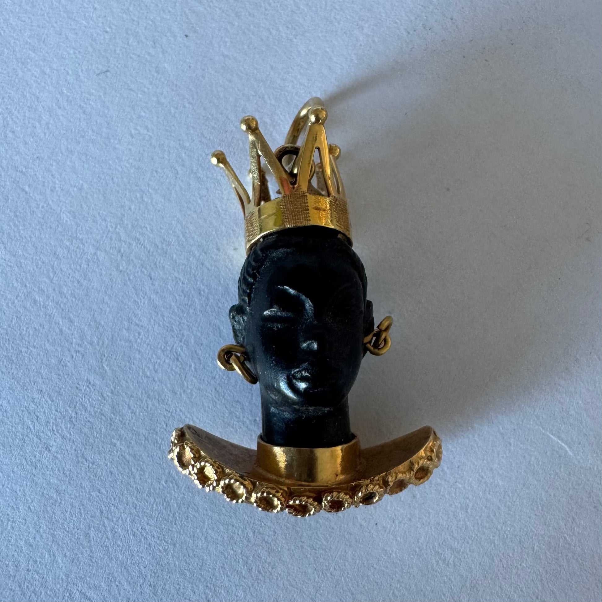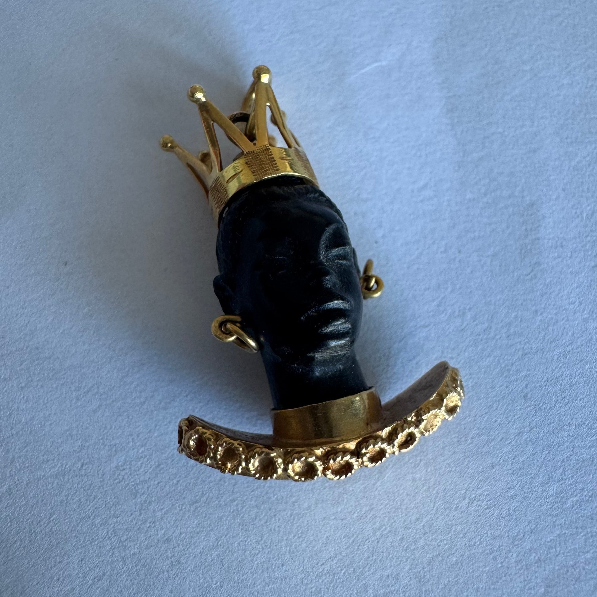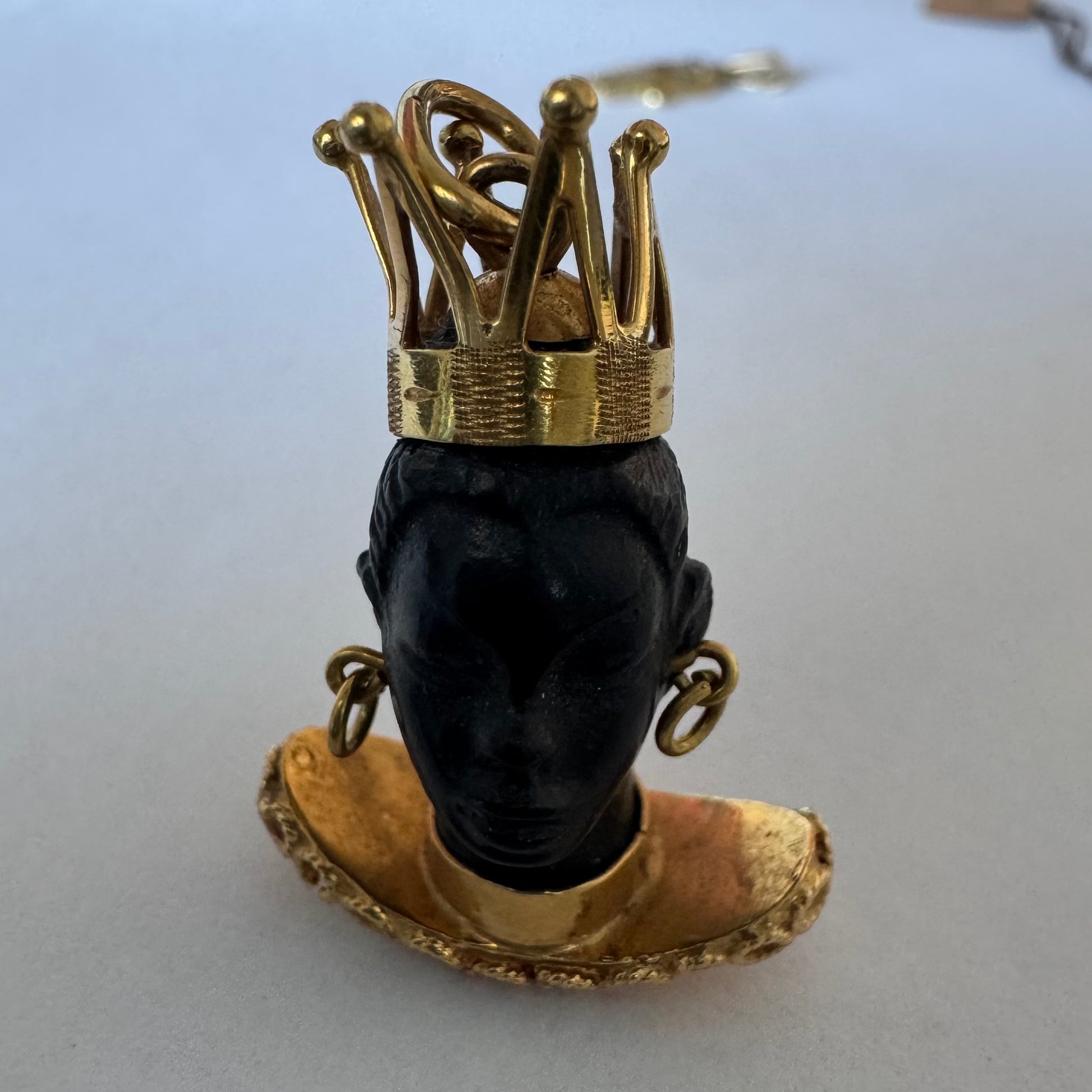 התליון מציג דמות אצילית מגולפת בחומר כהה ויוקרתי, המעוטרת בכתר מלכותי, עגילים תלויים וצווארון זהב רחב בעיצוב קלוע ומפורט.