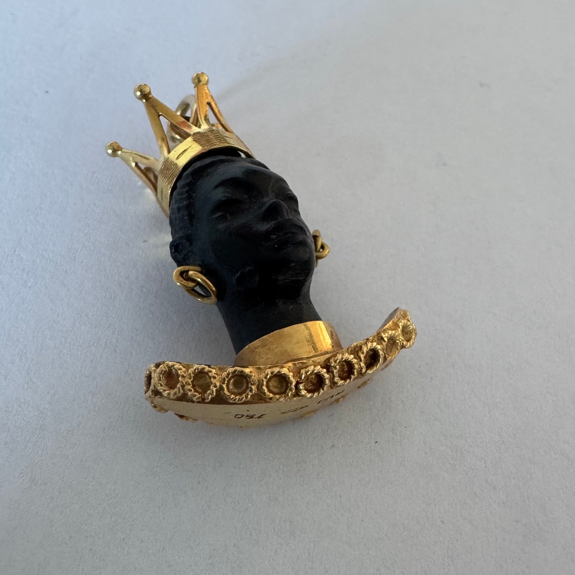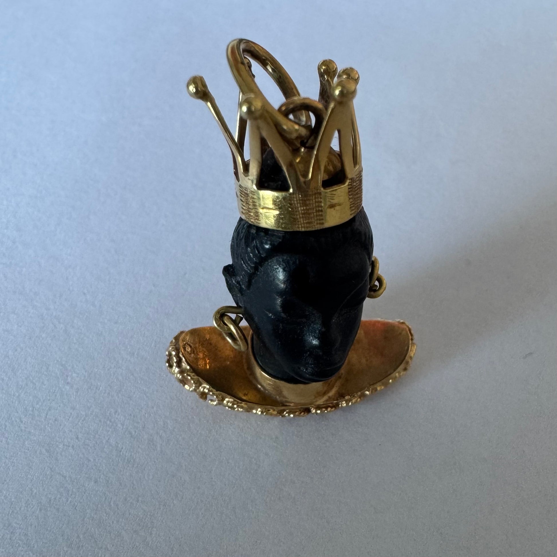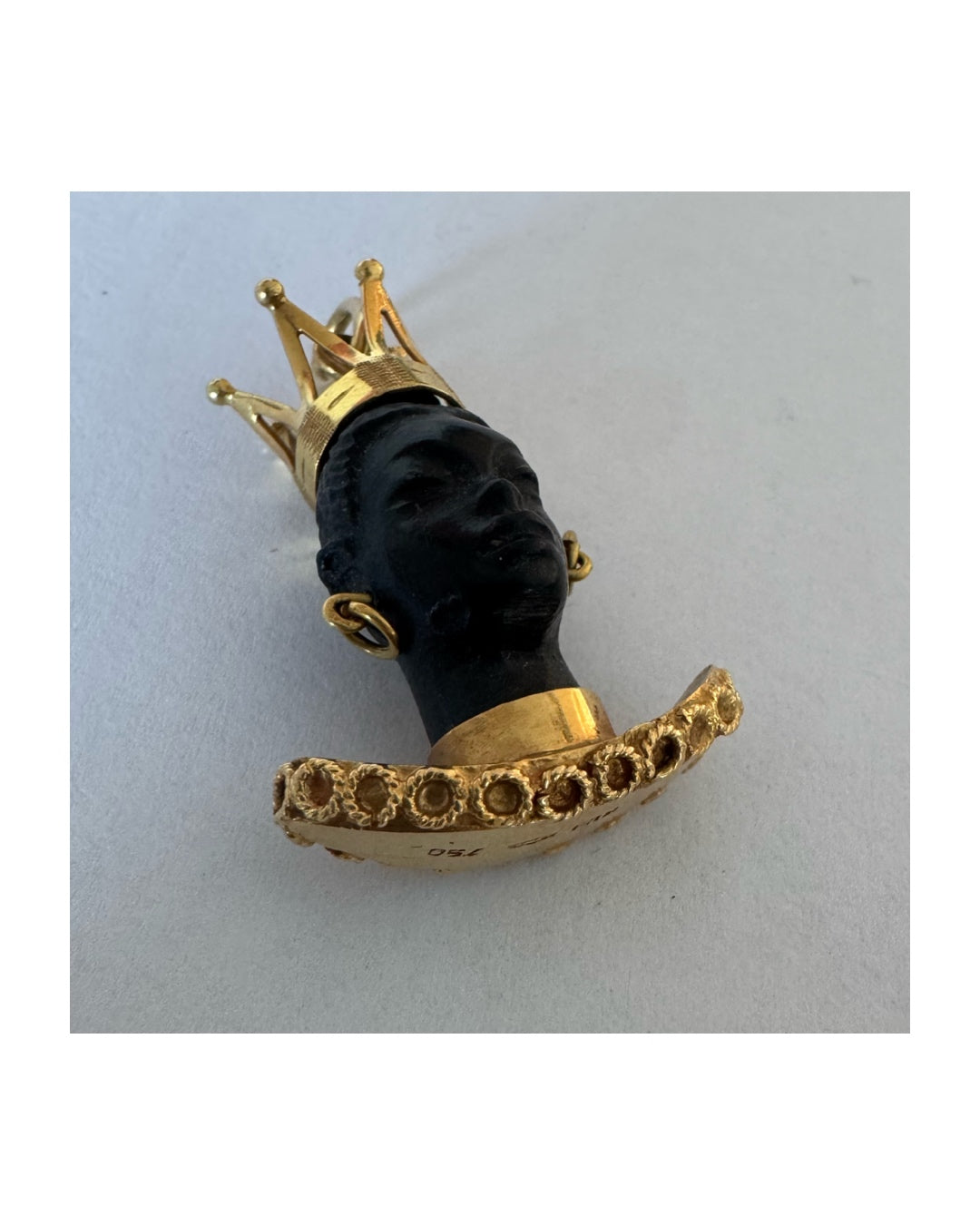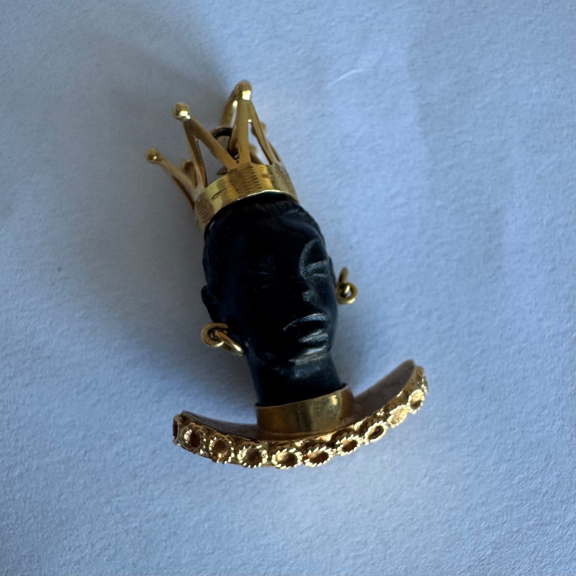 התליון מציג דמות אצילית מגולפת בחומר כהה ויוקרתי, המעוטרת בכתר מלכותי, עגילים תלויים וצווארון זהב רחב בעיצוב קלוע ומפורט.