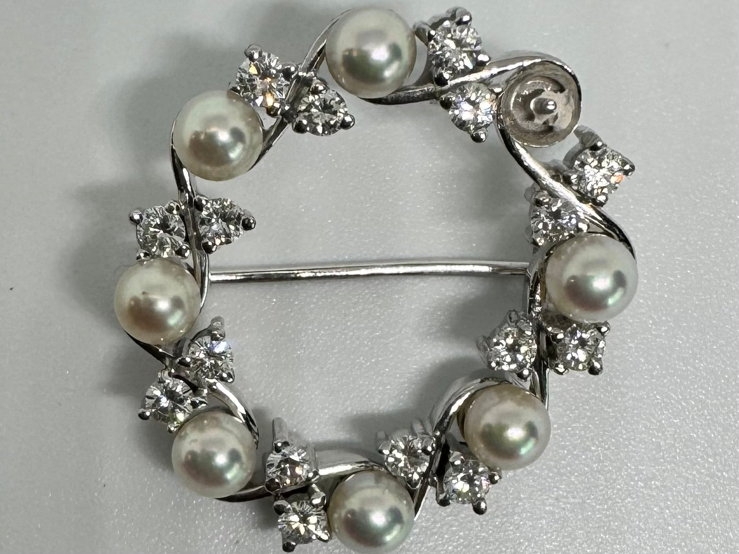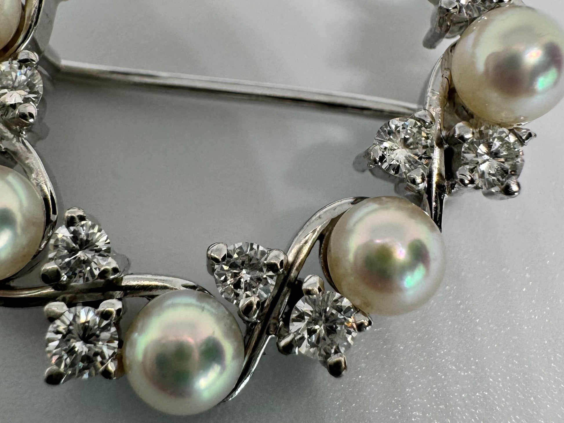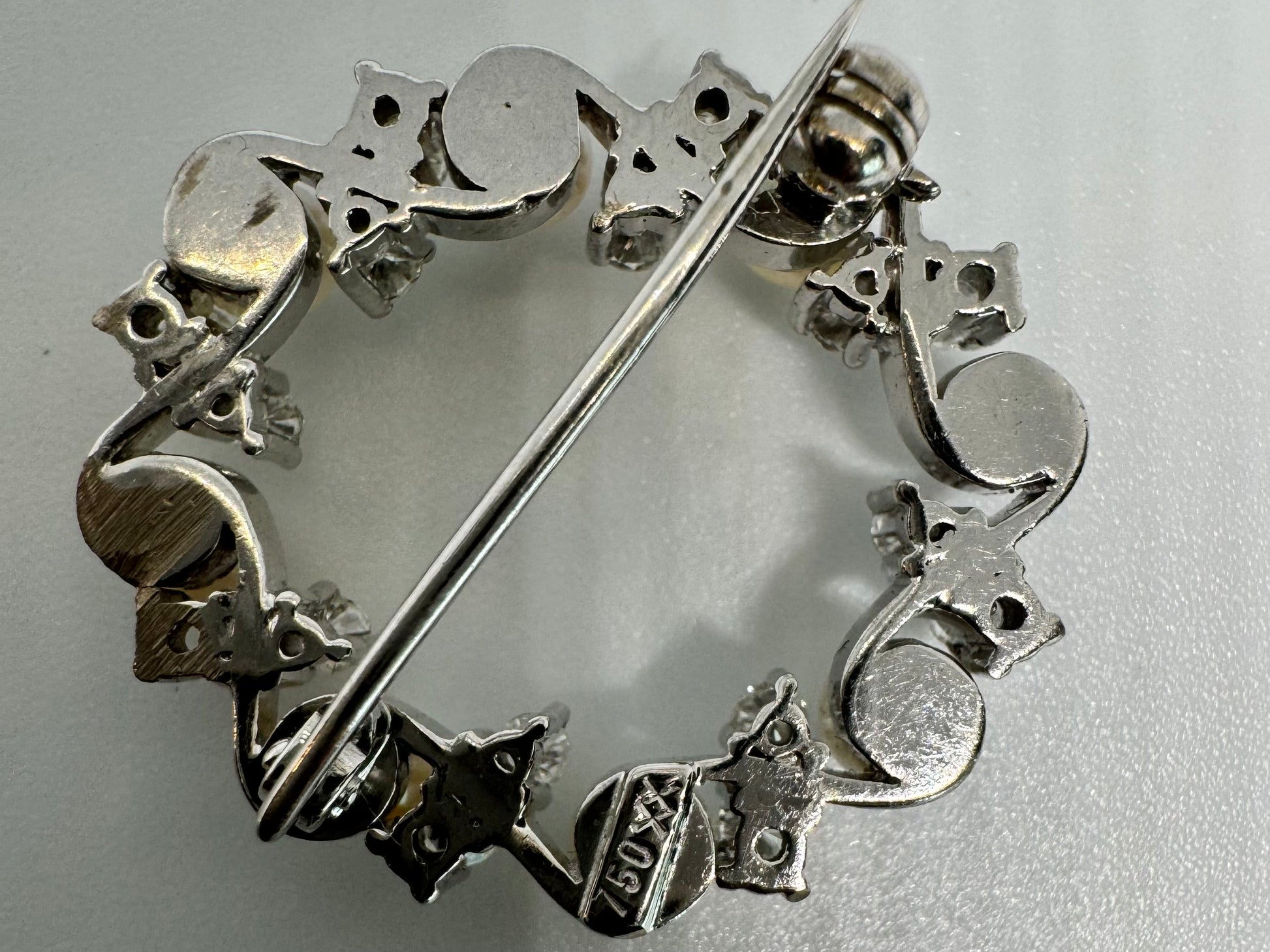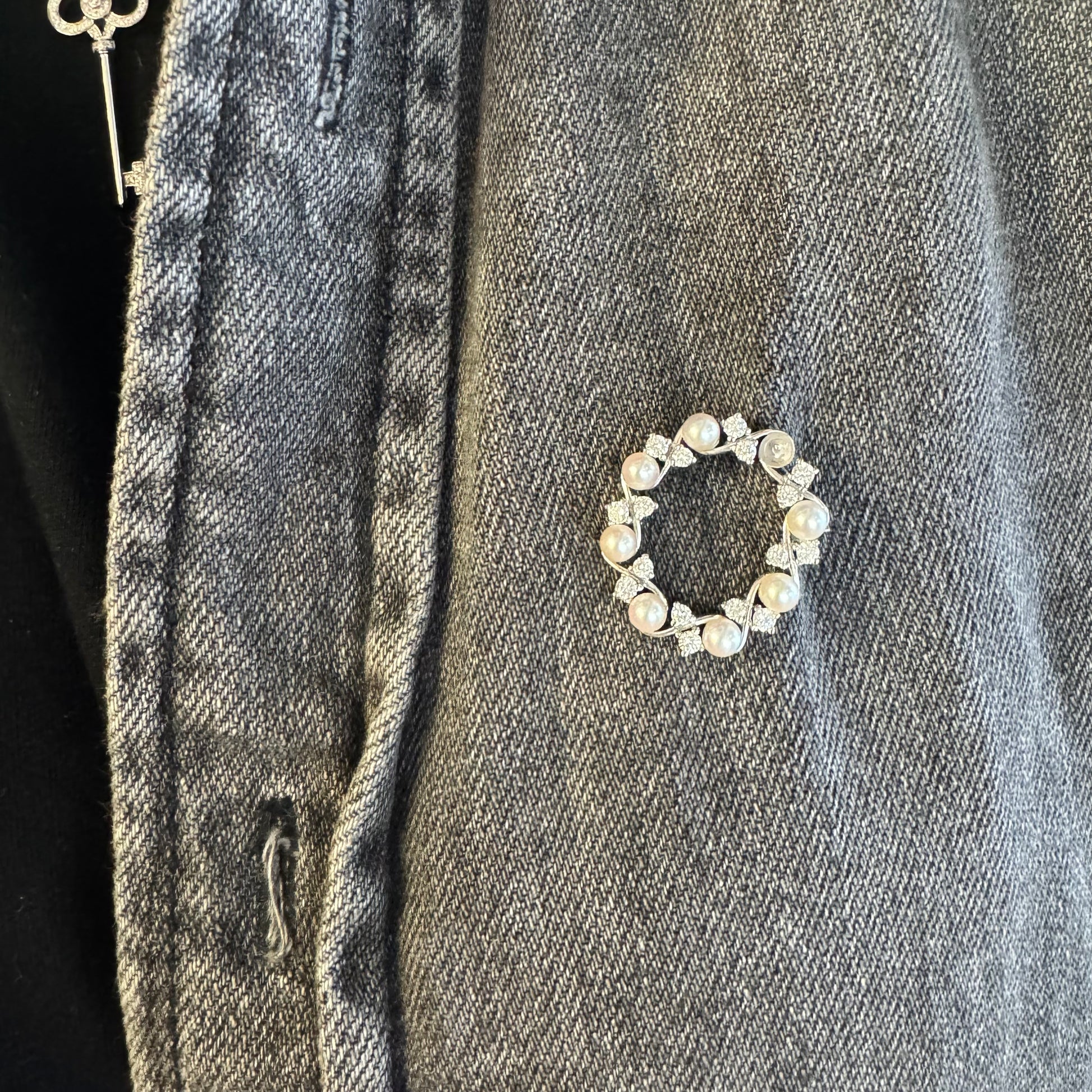 סיכת דש מזהב לבן 18 קראט, משובצת פנינים ויהלומים נוצצים, בעיצוב מעגלי עדין המשדר אלגנטיות קלאסית
