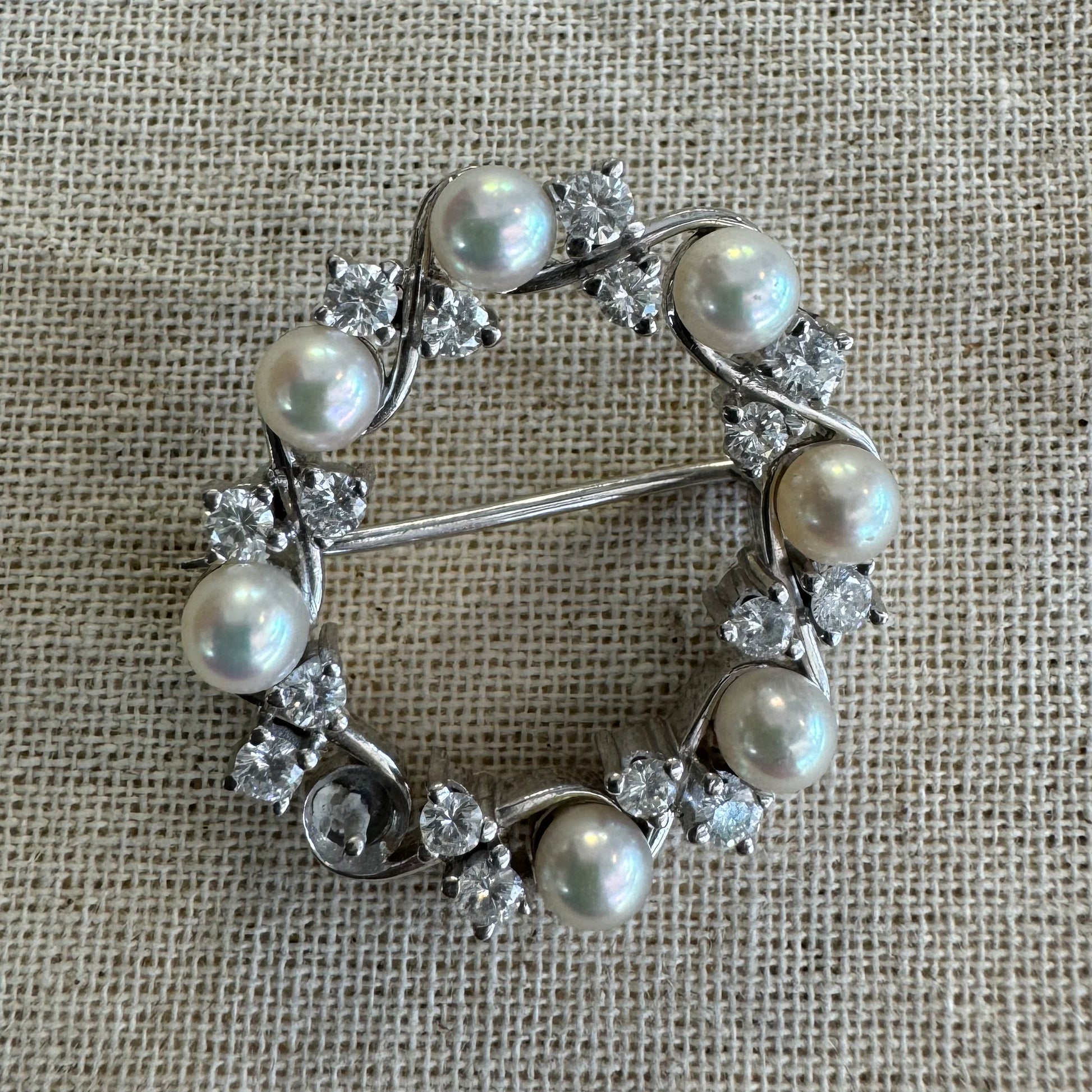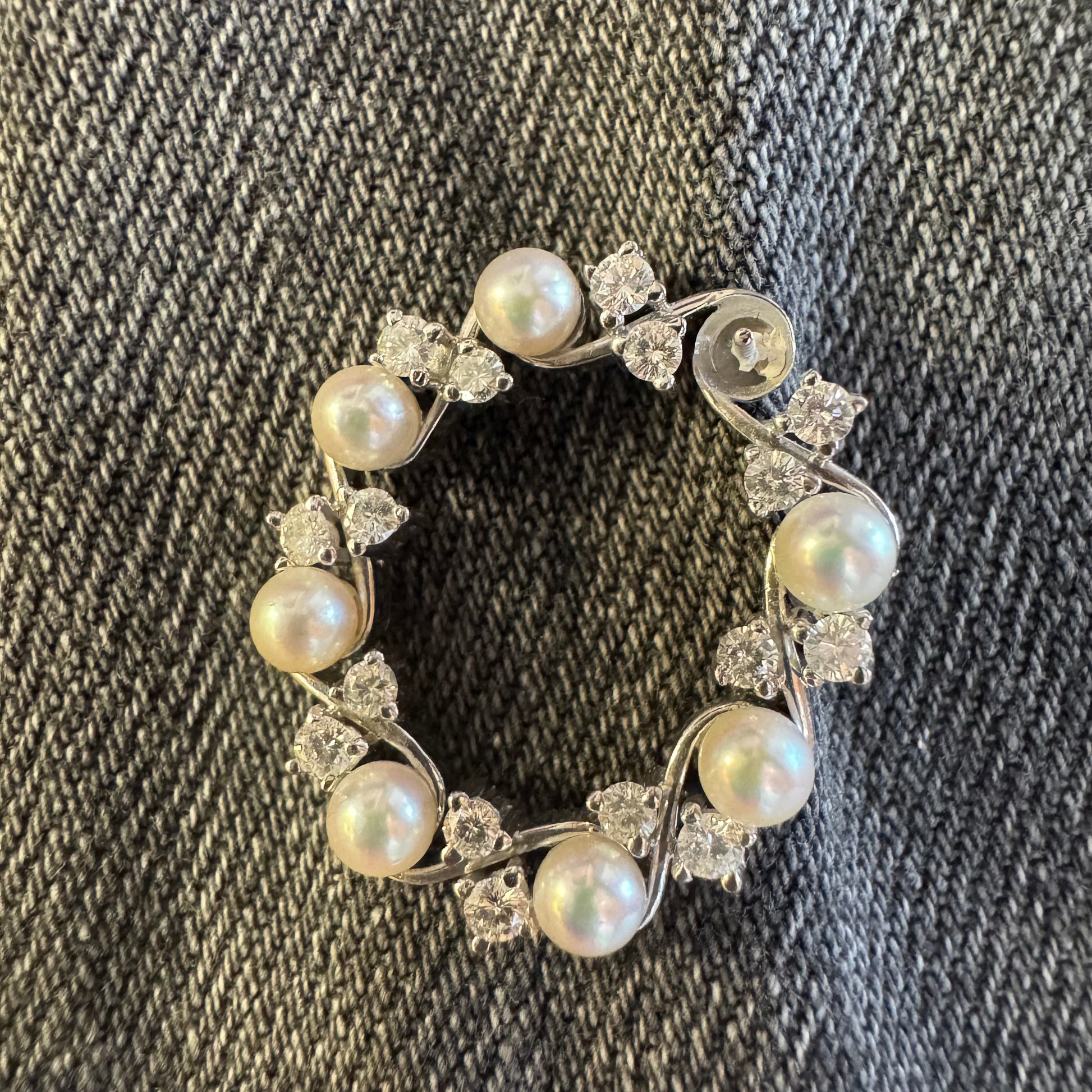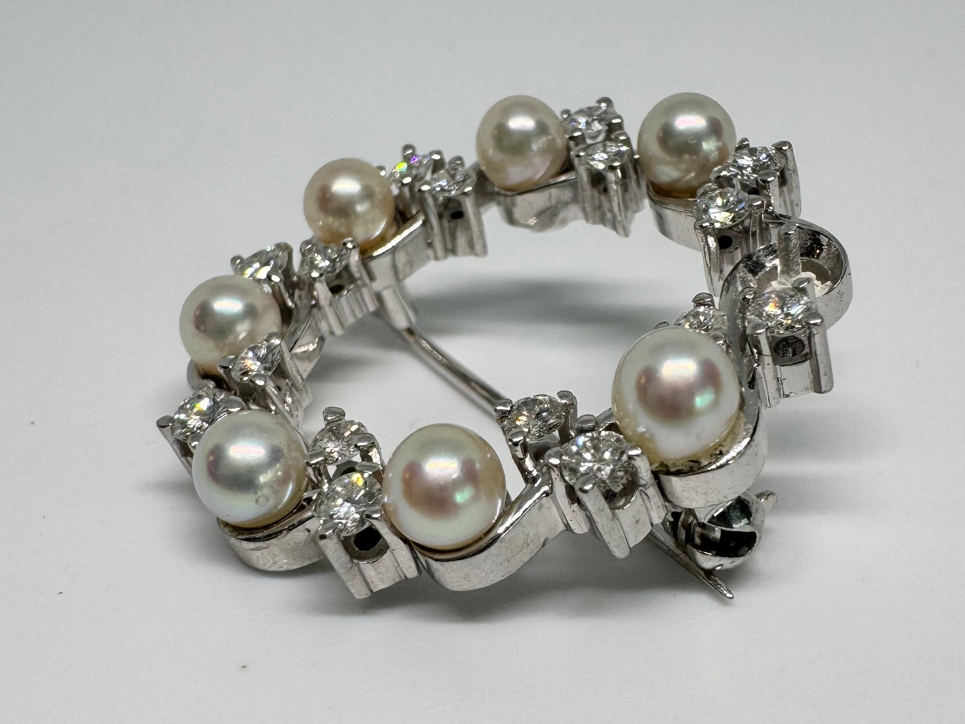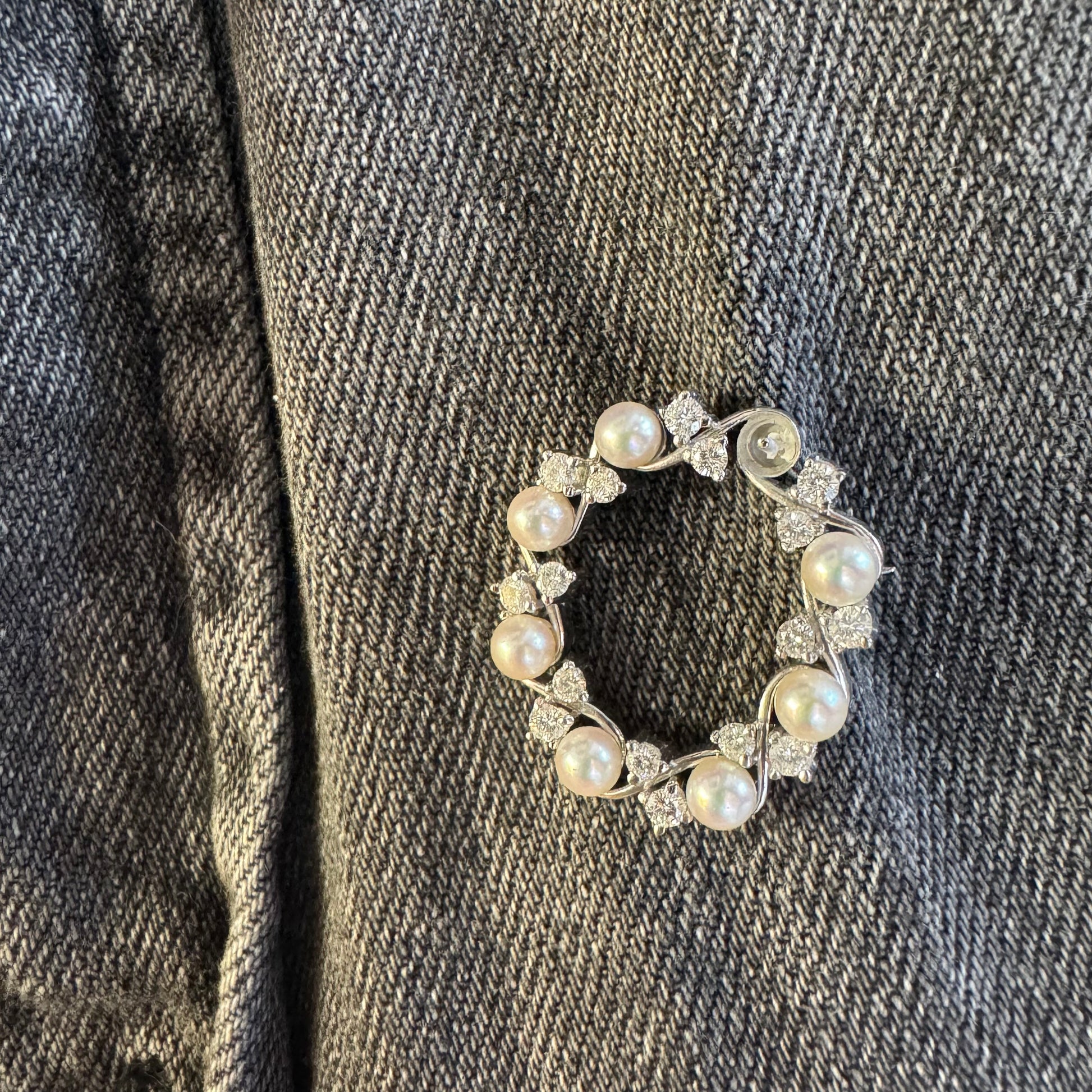 סיכת דש מזהב לבן 18 קראט, משובצת פנינים ויהלומים נוצצים, בעיצוב מעגלי עדין המשדר אלגנטיות קלאסית
