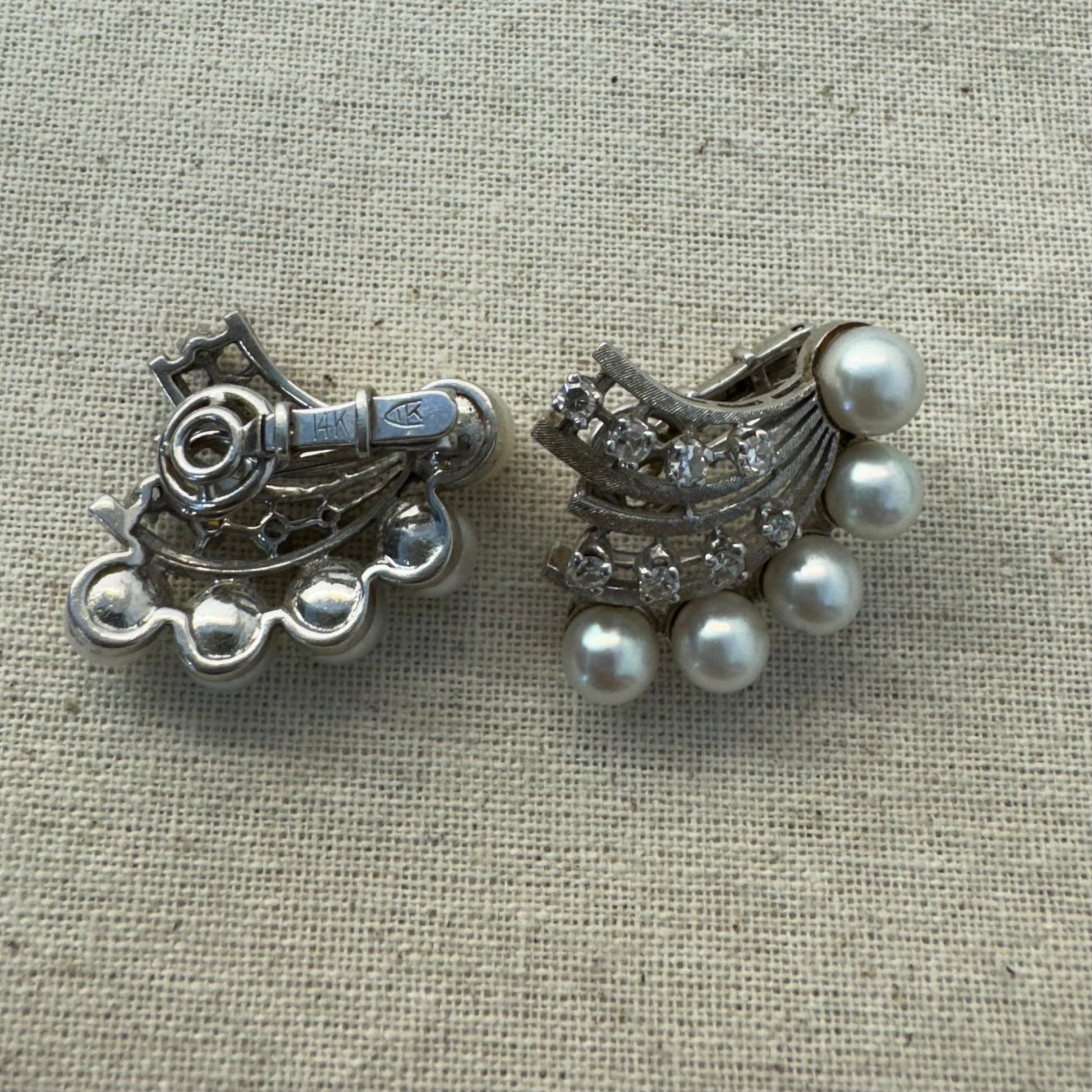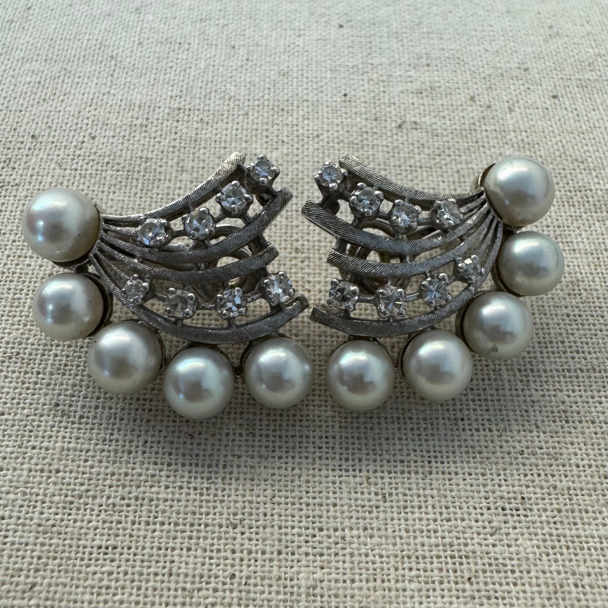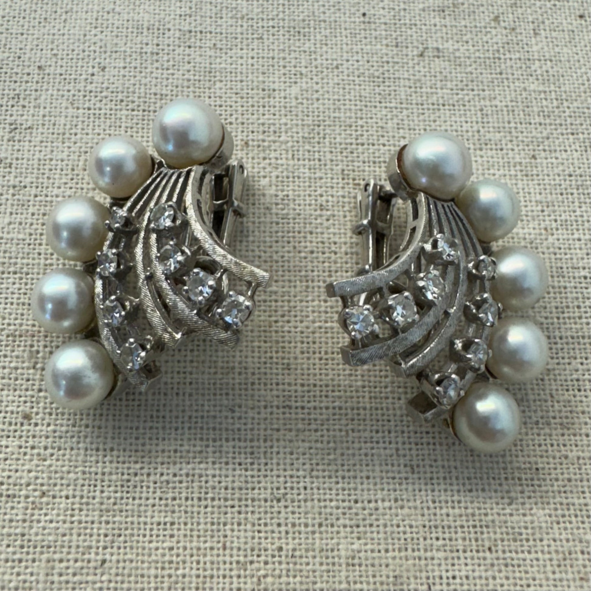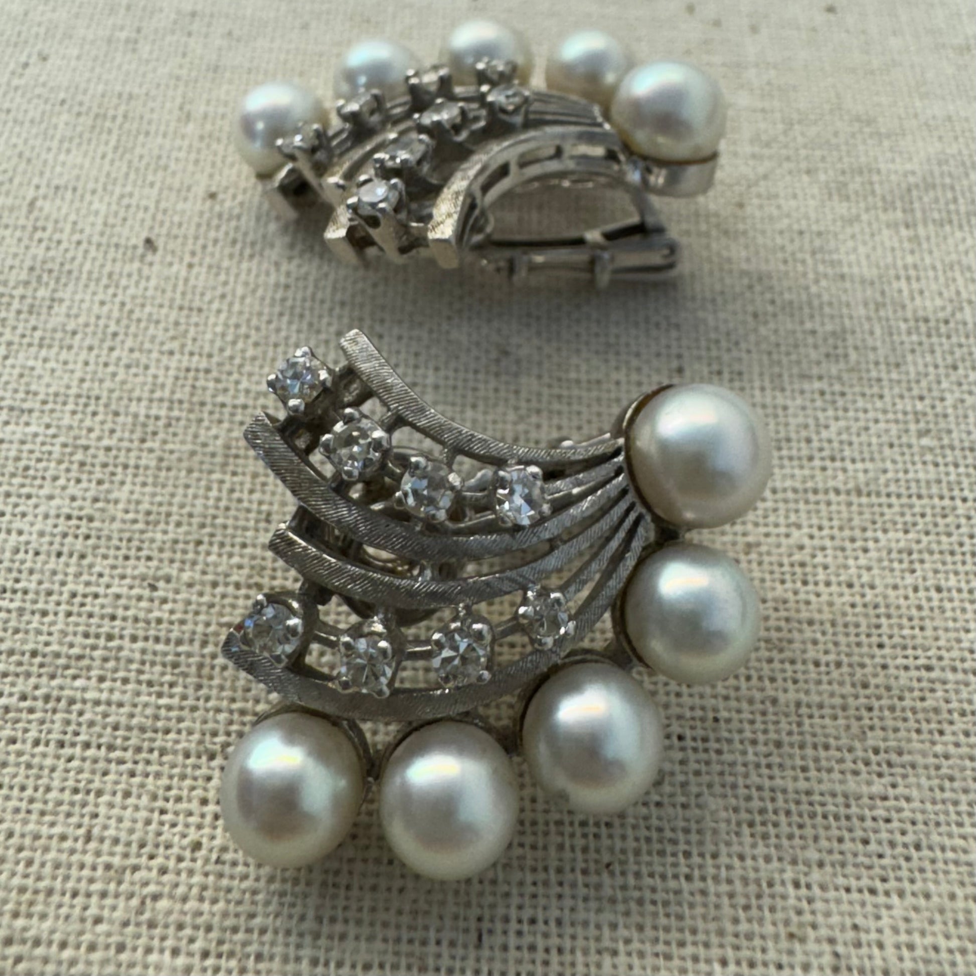 עגילי זהב לבן 14 קראט, קליפס, בסגנון הוליווד של שנות ה־50, משובצים שורות של יהלומים ופנינים עגולות שמוסיפות ברק רך ונוכחות עוצמתית.