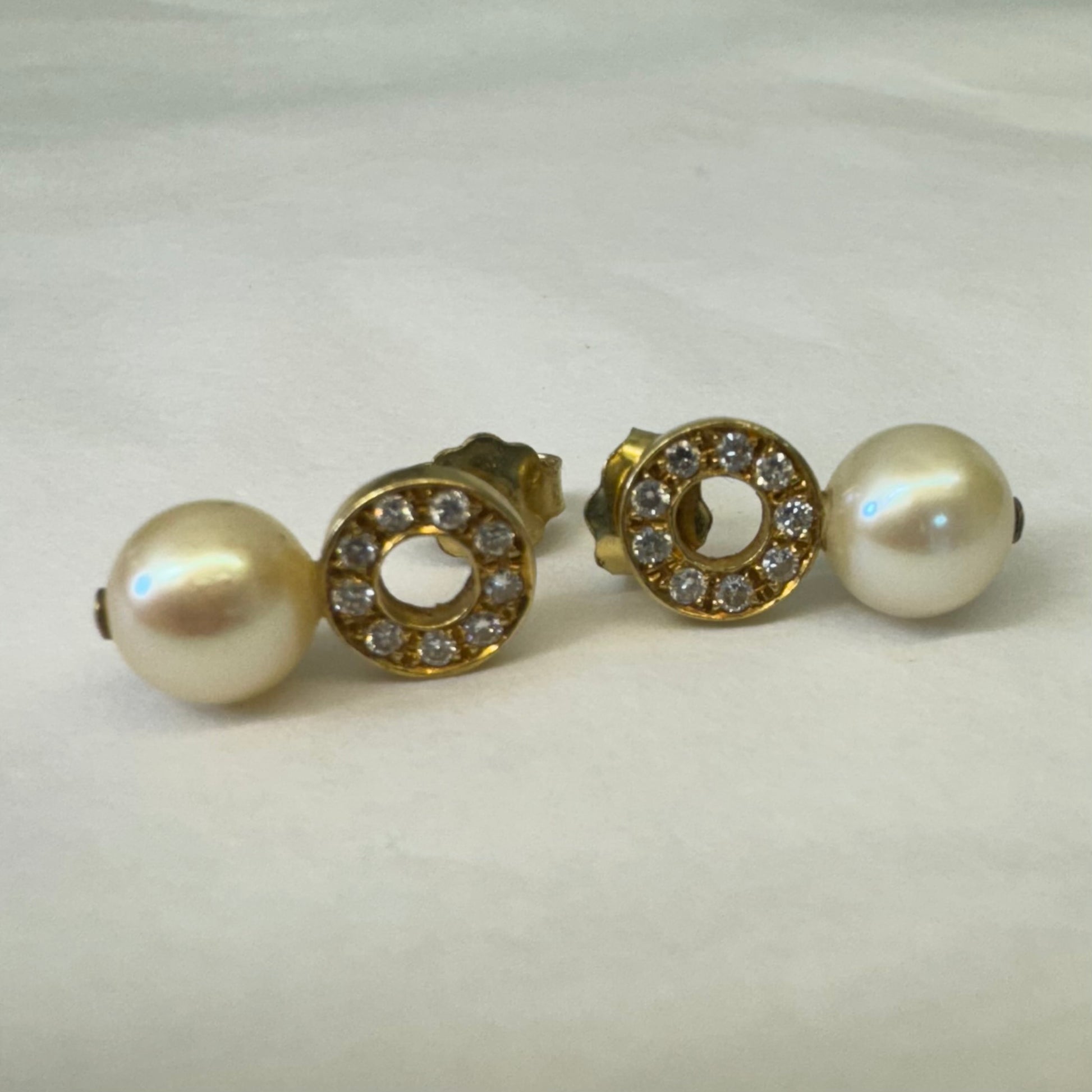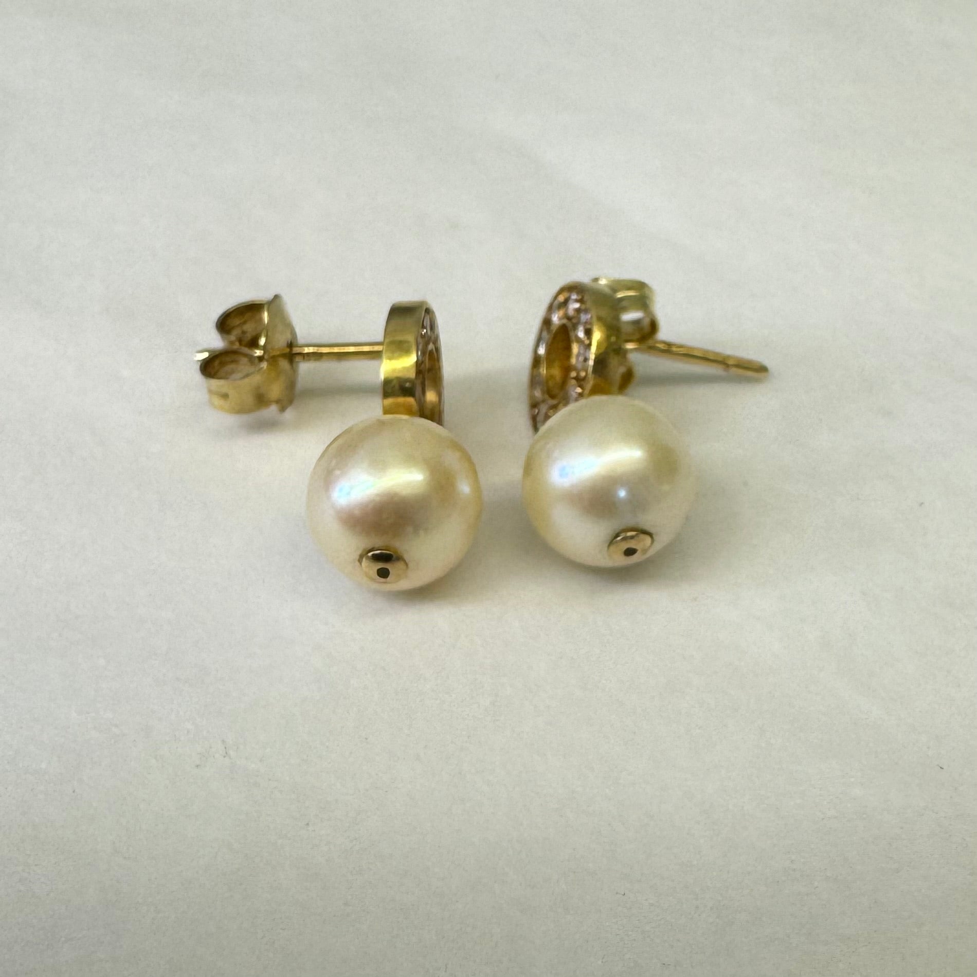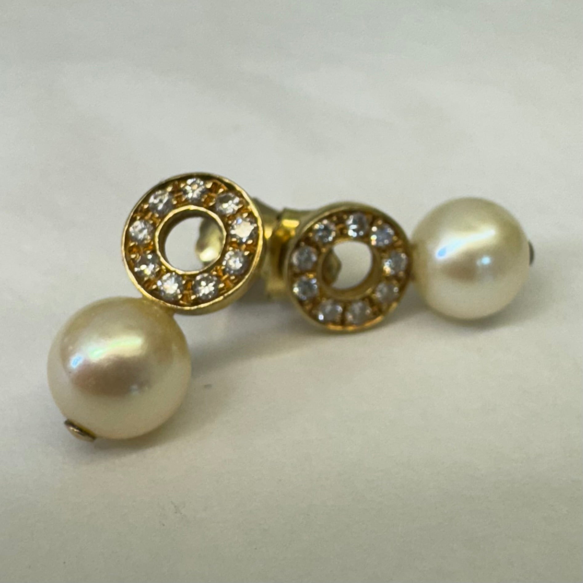 עגילי זהב צהוב 18 קראט, צמודים לאוזן ארוכים, משובצים פנינה ויהלומים