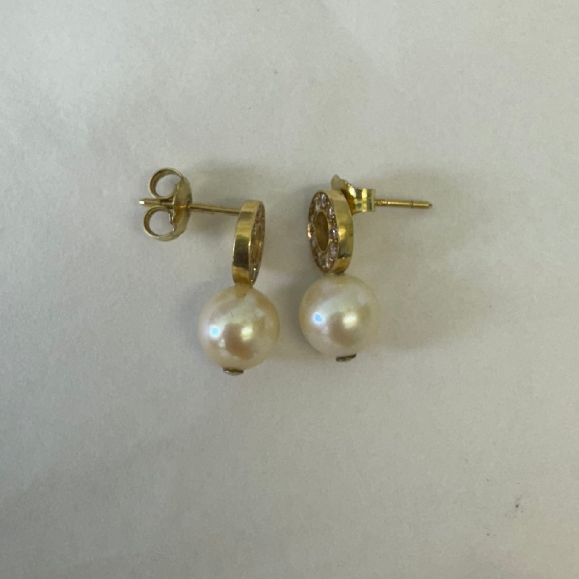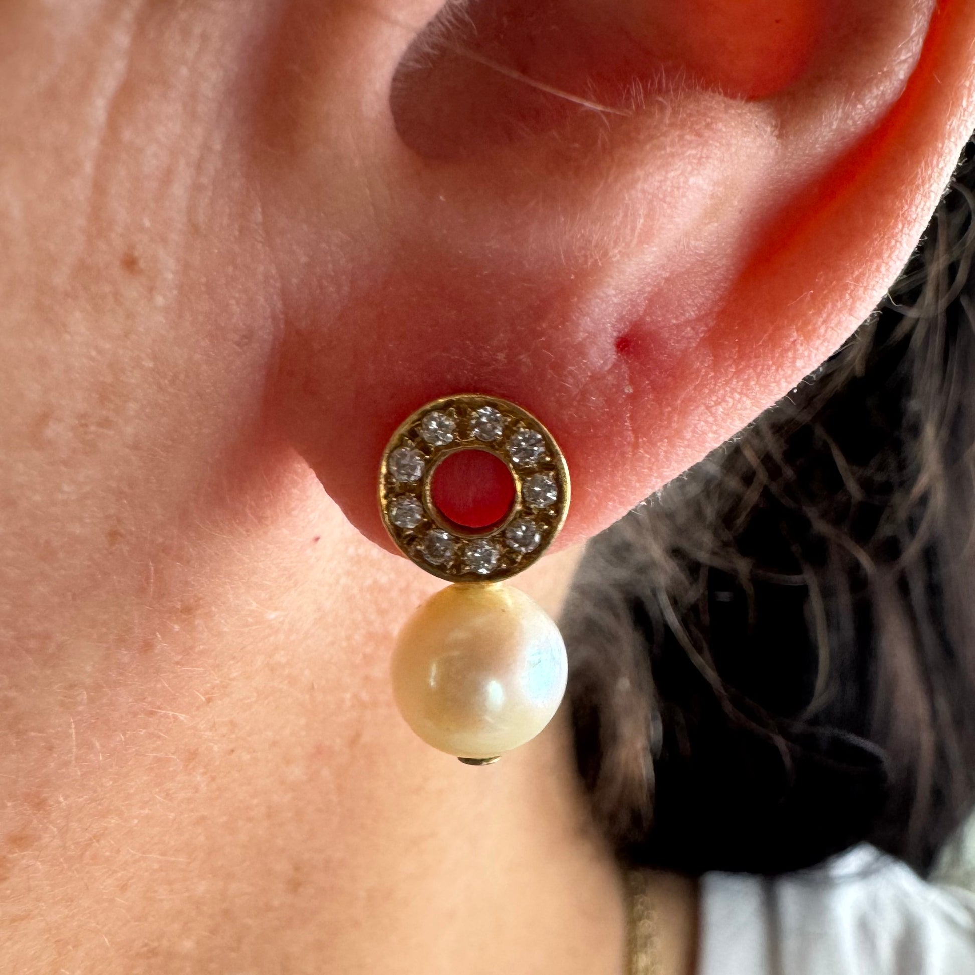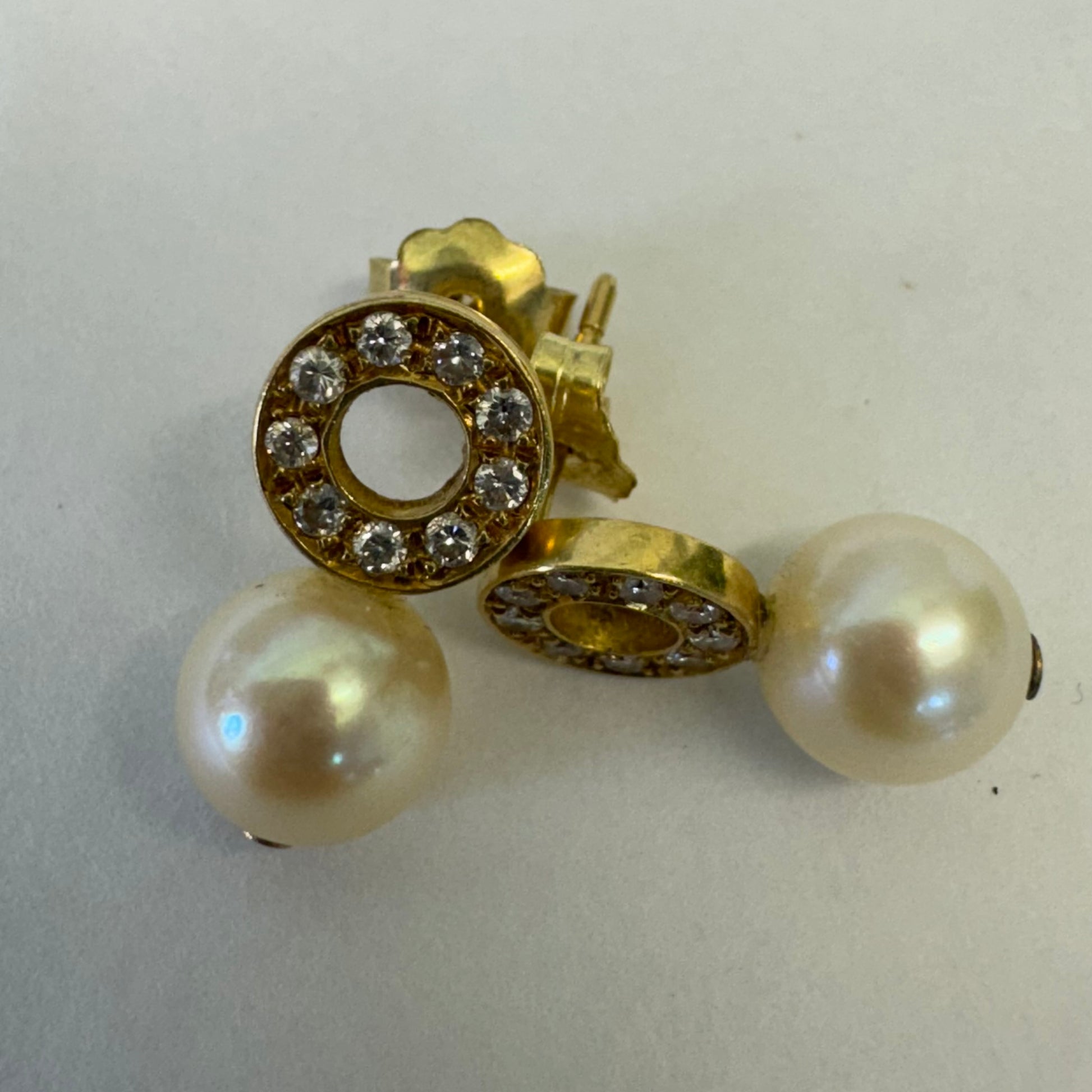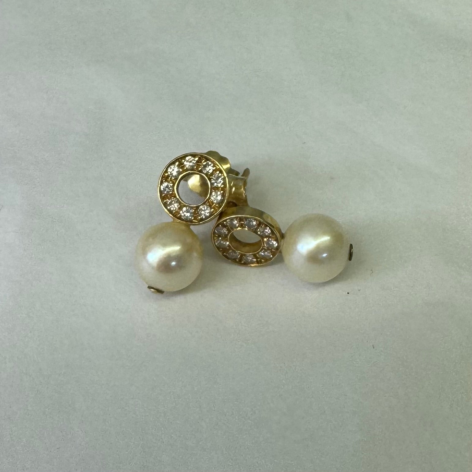 עגילי זהב צהוב 18 קראט, צמודים לאוזן ארוכים, משובצים פנינה ויהלומים