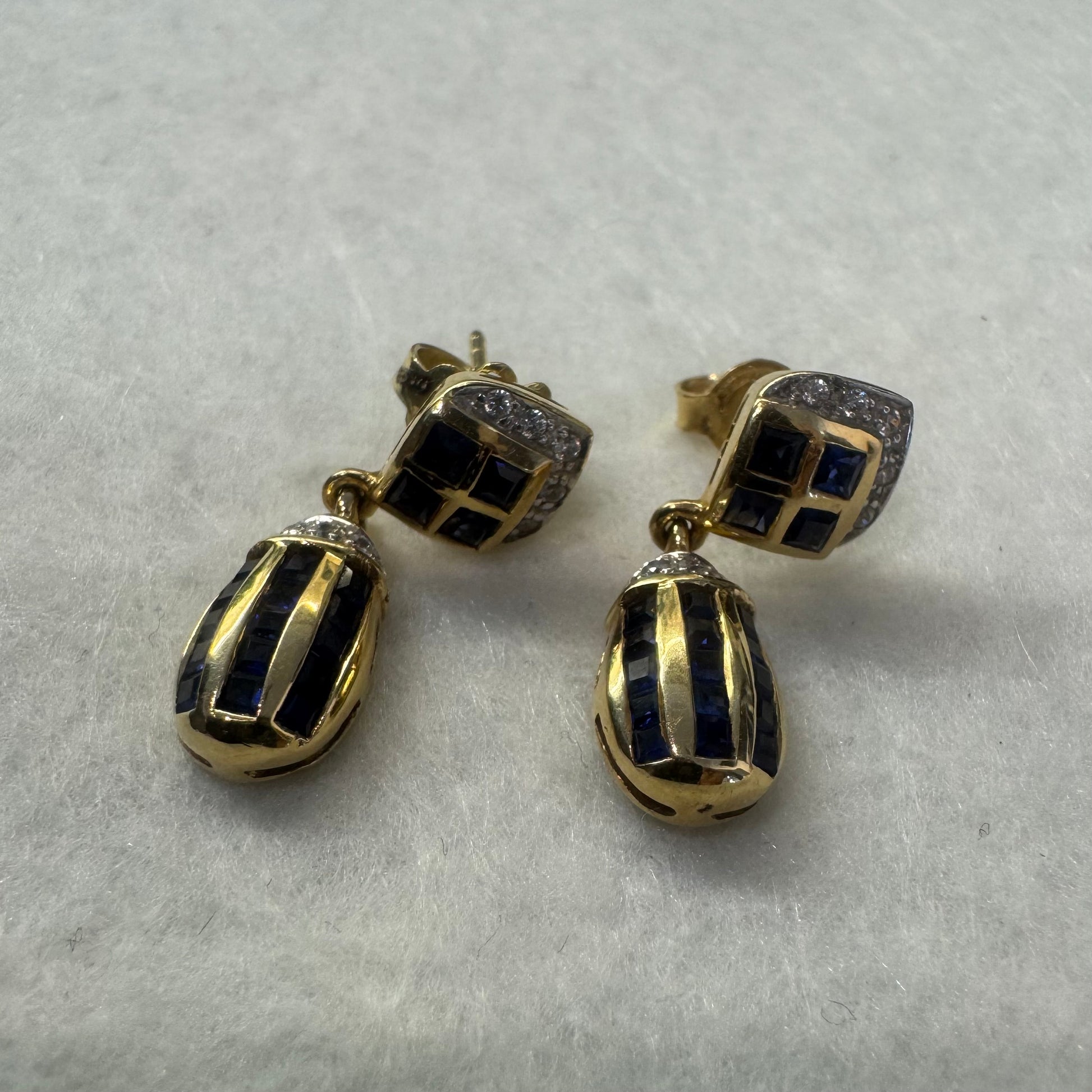 עגילי זהב צהוב 18 קראט תלויים, משובצים אבני ספיר כחולות בגוון כחול עמוק בעיצוב גיאומטרי, בשילוב יהלומים מנצנצים