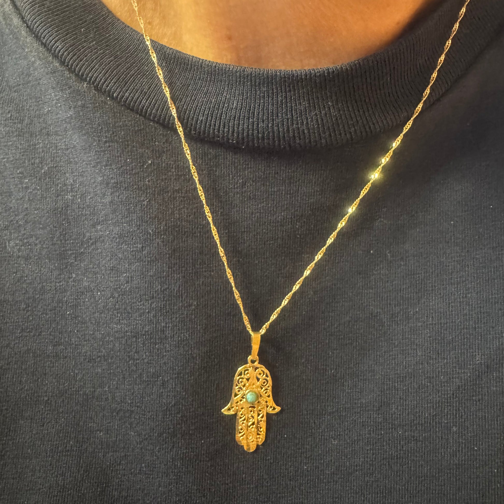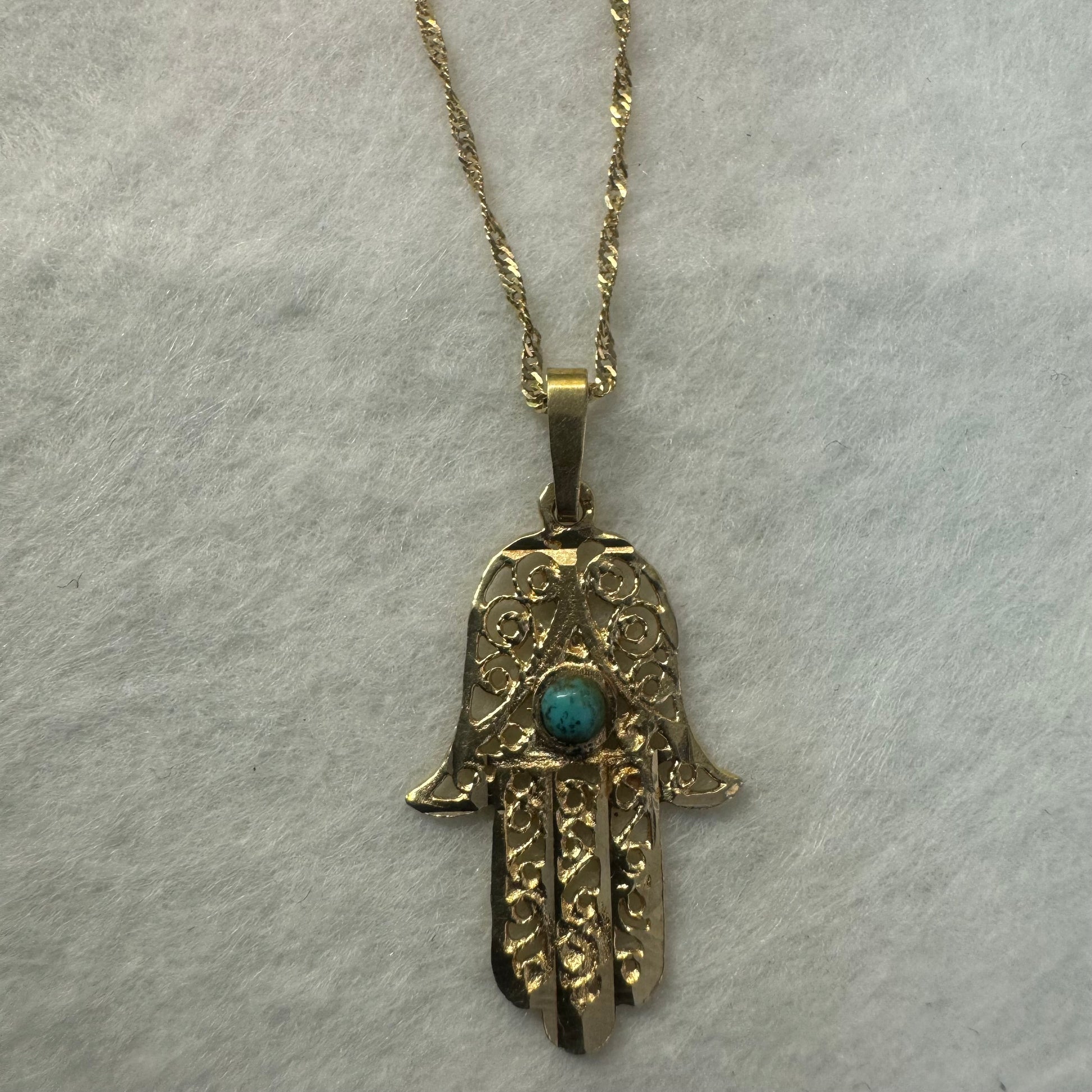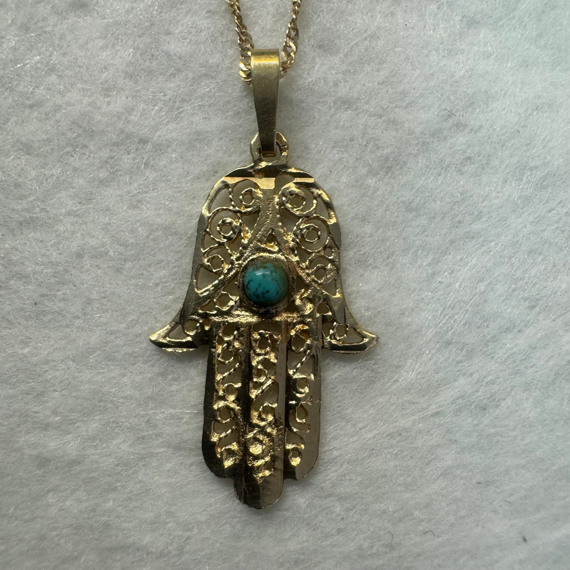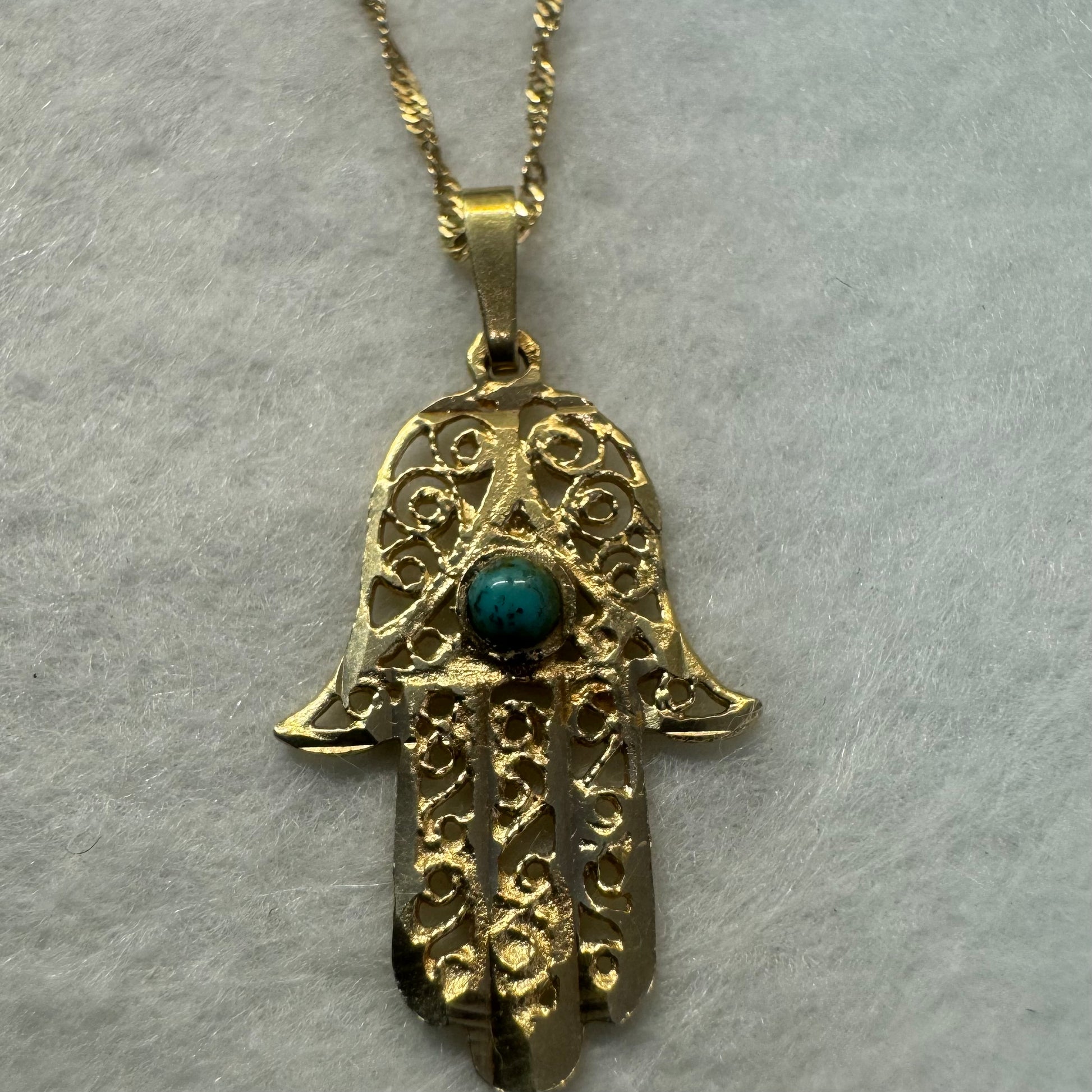 שרשרת זהב צהוב 14 קראט עם תליון ״חמסה״ משובץ אבן טורקיז במרכז