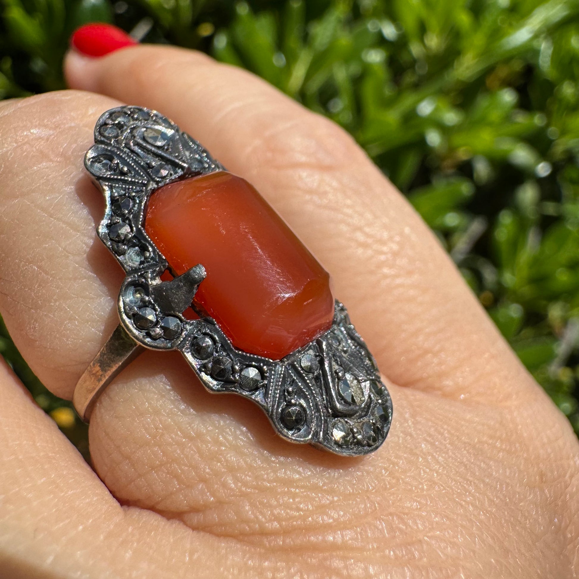 טבעת זהב לבן 10 קראט בשילוב כסף משובצת אבן קרנליאן ויהלומים מסביב